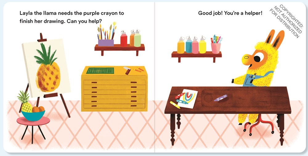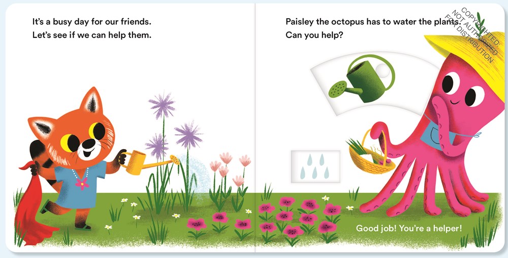 It's a busy day for the Beginning Baby animal friends, and they could use some help! In YOU'RE A HELPER, baby can push the embedded slides to help Paisley the octopus water plants, Layla the llama find a crayon, Mia the monkey put away toys, and other characters with their activities around the house. It all ends with a hug for Mateo the red panda, who needs one after getting an ouchie.