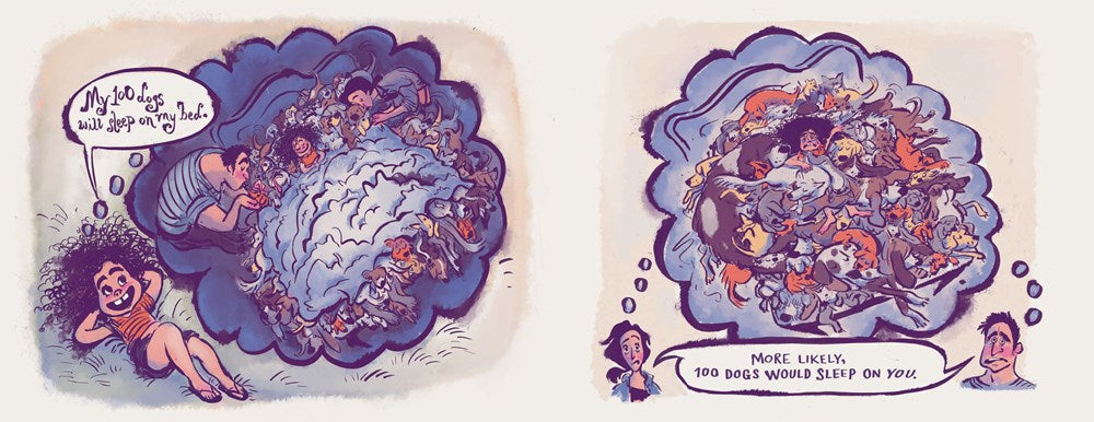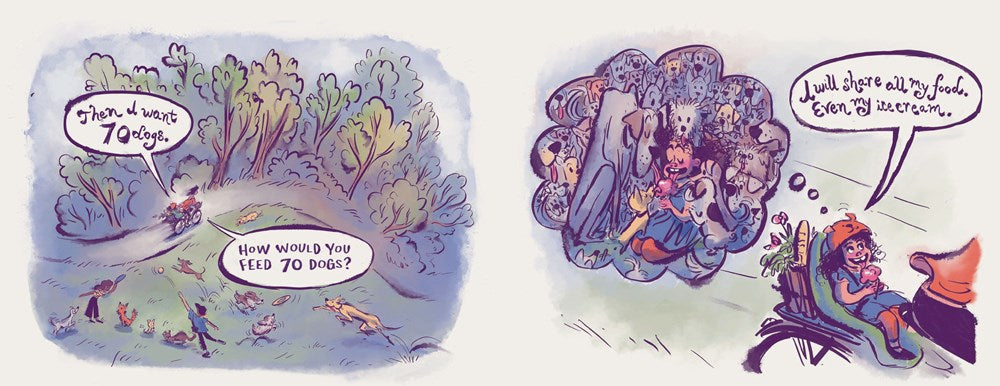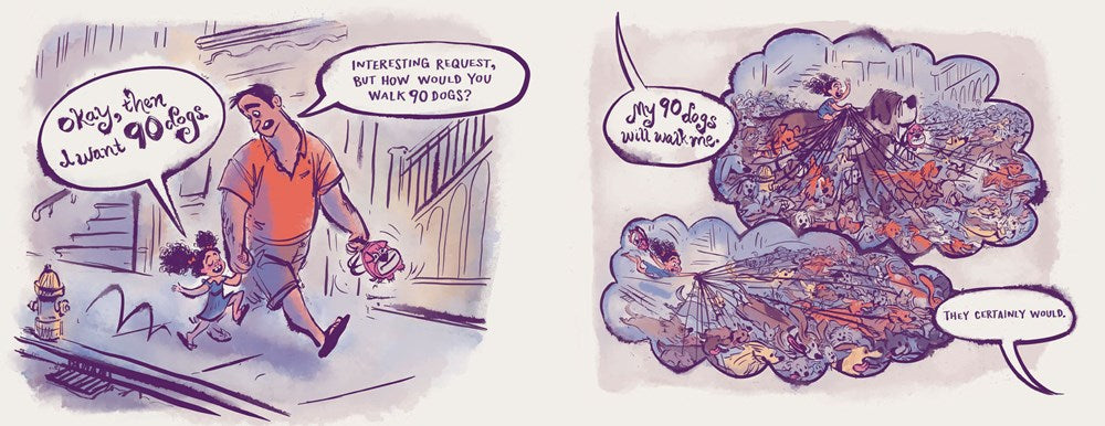 A young girl proclaims, "I want 100 dogs." In a twist, her parents agree, but they have just one question: Where will 100 dogs sleep? Our protagonist revises her request to 90 dogs. But how does one walk 90 dogs? A silly, subtractive counting tale and an over-the-top ode to the joys (and woes) of canine company, this sweet and surprising story proves that no matter how boundless your enthusiasm, when it comes to finding the perfect pet, sometimes less really is more.