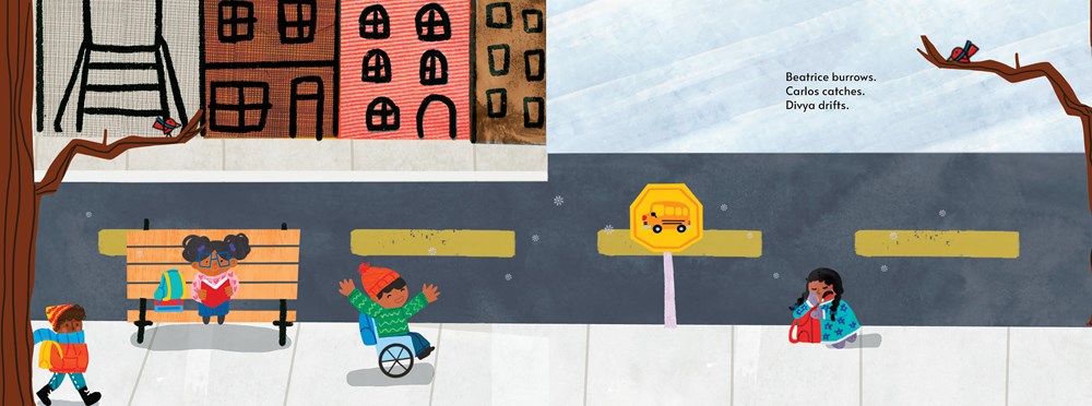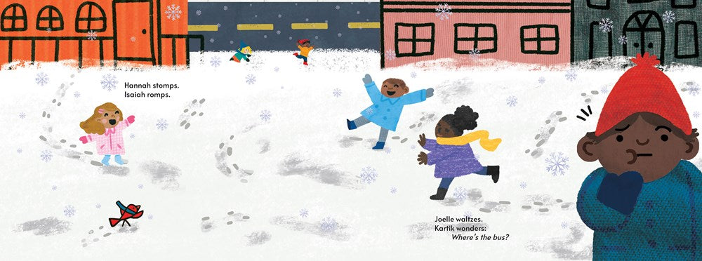 It’s time for school, and all the neighborhood kids, from Antoine to Mahmoud to Zoey, gather one by one in the frosty dawn to wait for the school bus. But something more thrilling arrives first. Snowflakes fall, transforming the bus stop into a winter wonderland—and an official snow day. No school!