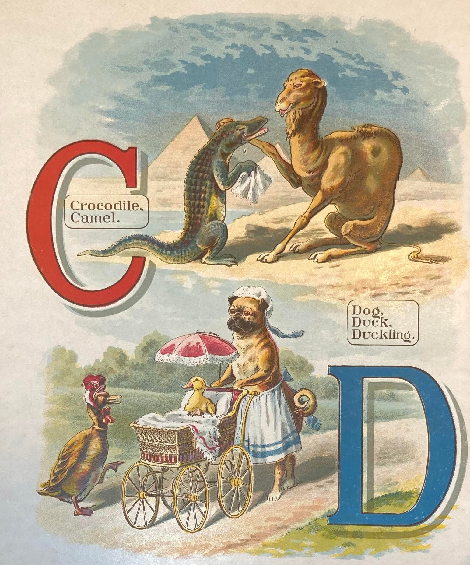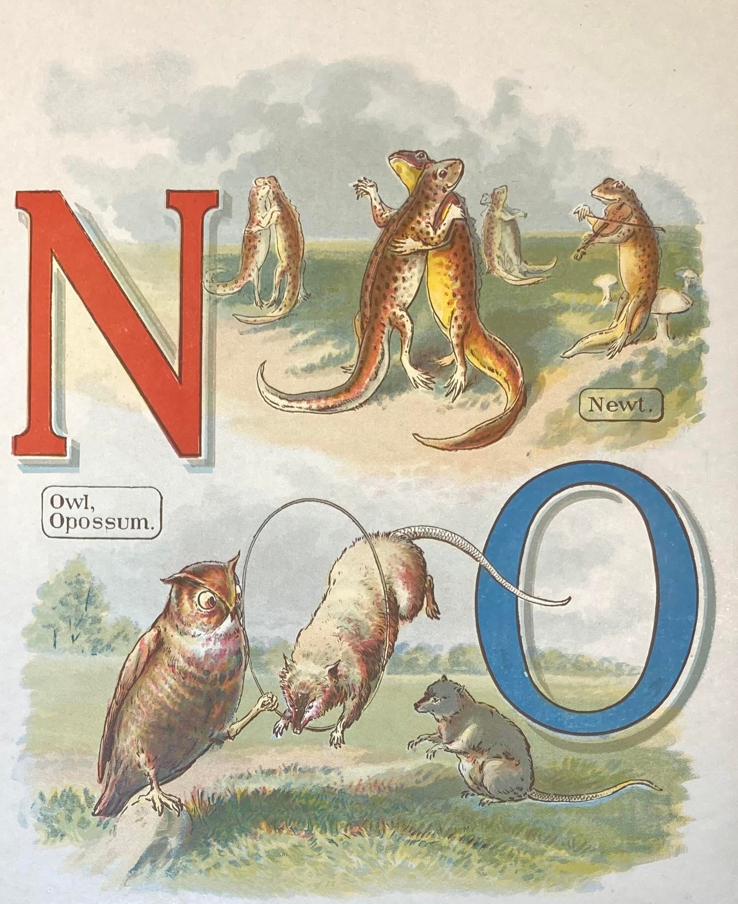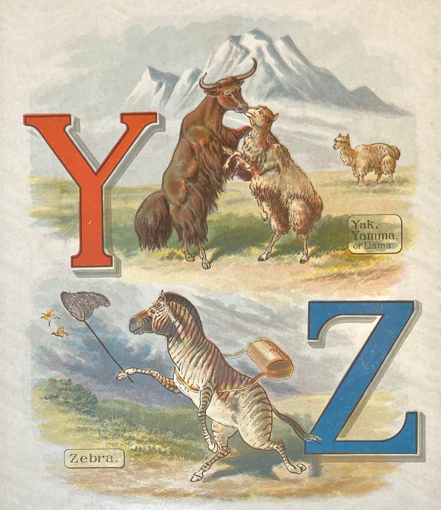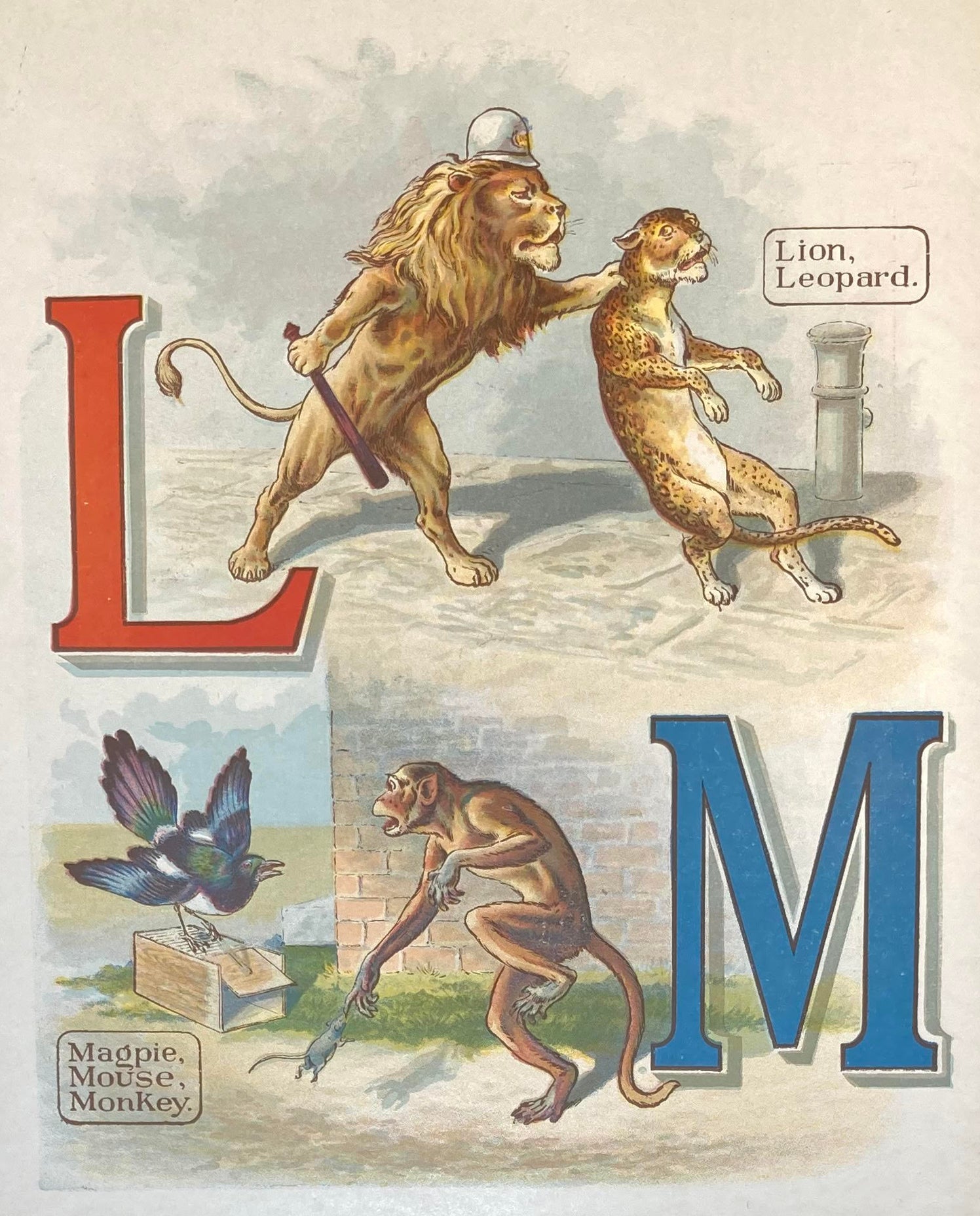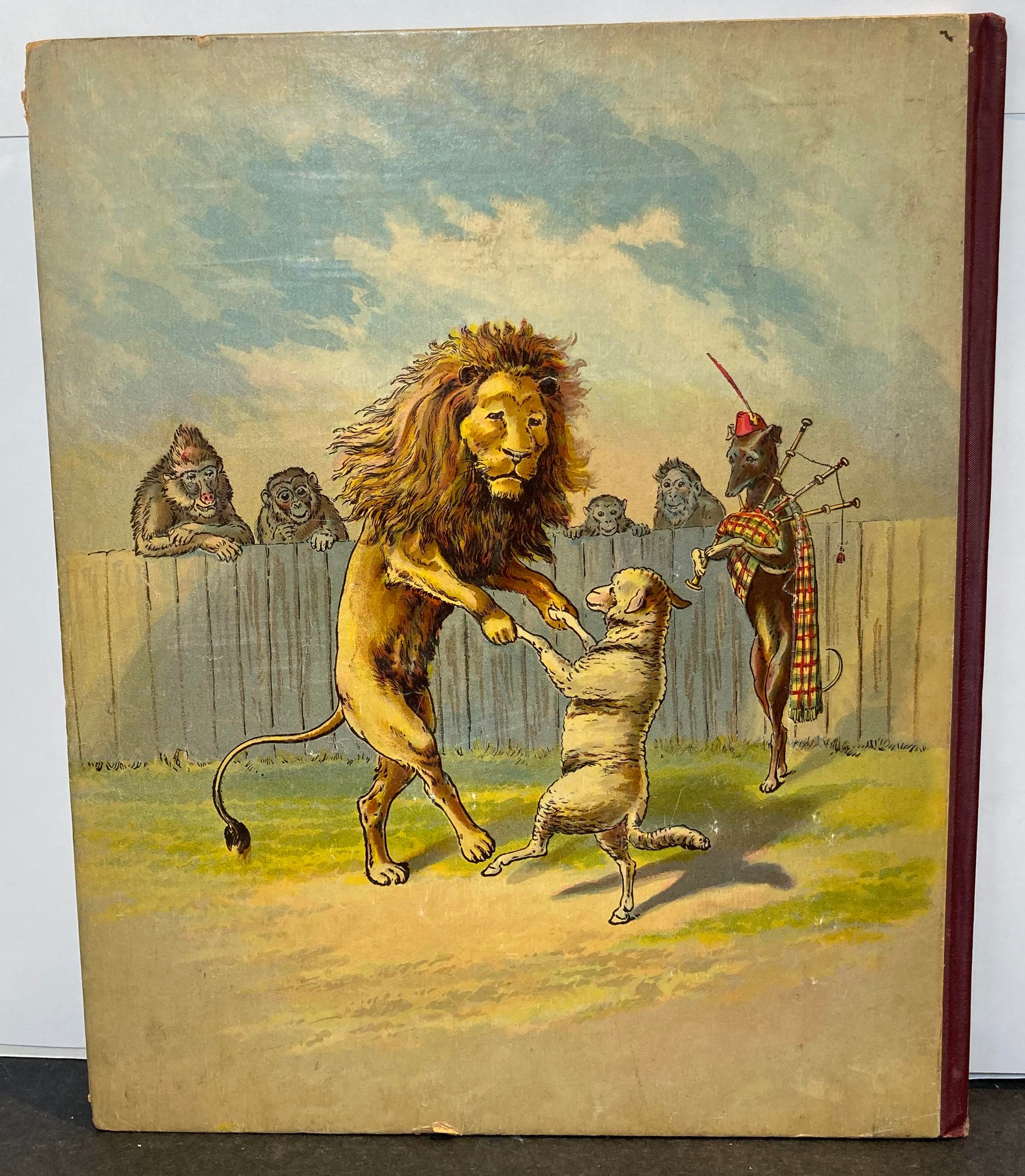 Turn-of-the-century alphabet book. An alphabet book featuring animals corresponding to each letter of the alphabet, all in humorous situations. Featuring vibrant and lush chromolithographic illustrations, this is a wonderful picture book from one of the most successful American children’s publishing companies of the era.