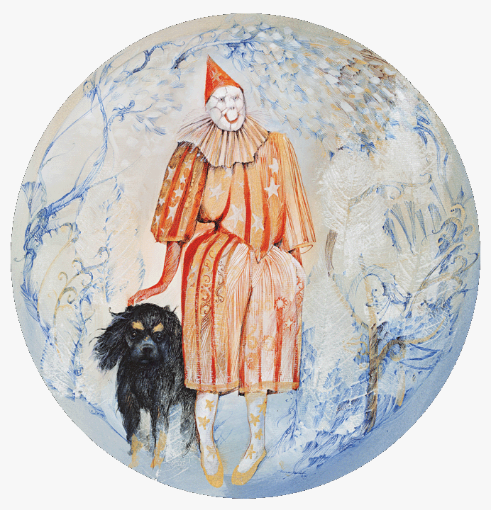 A bright and delicate mixed-media piece showing the China Clown and Toto.