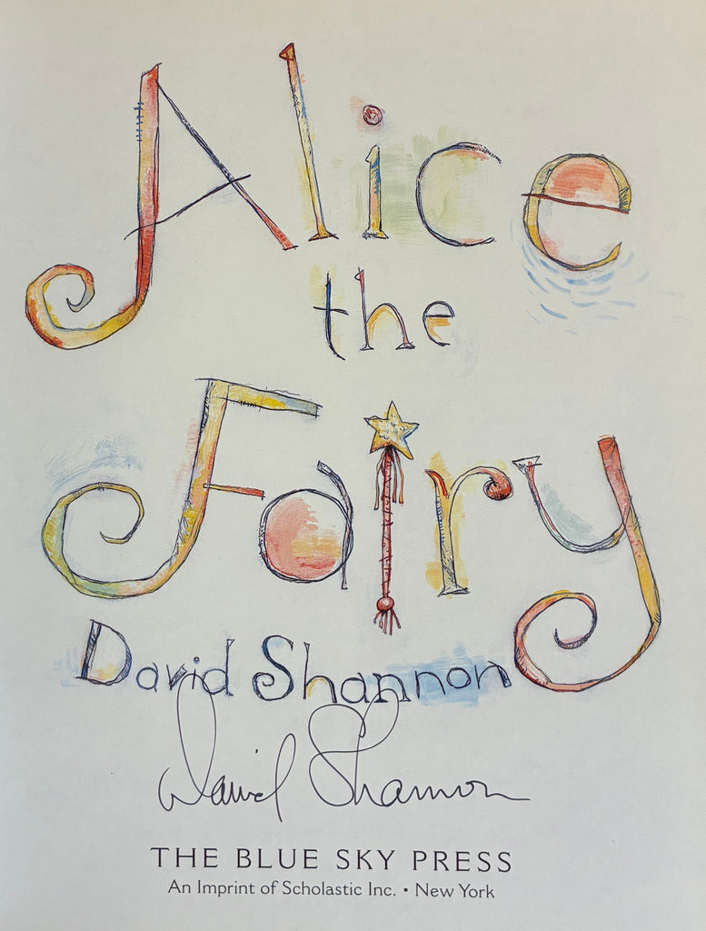 SHANNON, David. Alice the Fairy. NY: Blue Sky Press [2004]. 8vo, [32]pp. Color pictorial boards. Color pictorial endpapers; color illustrations on every page. A fine copy in original color pictorial dust jacket. Signed by the author/artist, Caldecott Honor artist David Shannon!