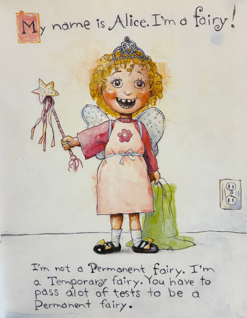 First edition. Caldecott Honor artist and bestselling author David Shannon's warm and funny picture book introduces Alice, a mischievous little girl with a nose for trouble and a magic wand. Alice is a fairy -- a Temporary Fairy. She has a magic wand, fairy wings, and a blanket, all of which she uses to disappear, to fly, to transform her dad into a horse, and to turn his cookies into her own! There are still a few things Alice needs to learn to become a Permanent Fairy, like how to float her dog on the ceiling and make her clothes put themselves away, but she's working on it... sort of.