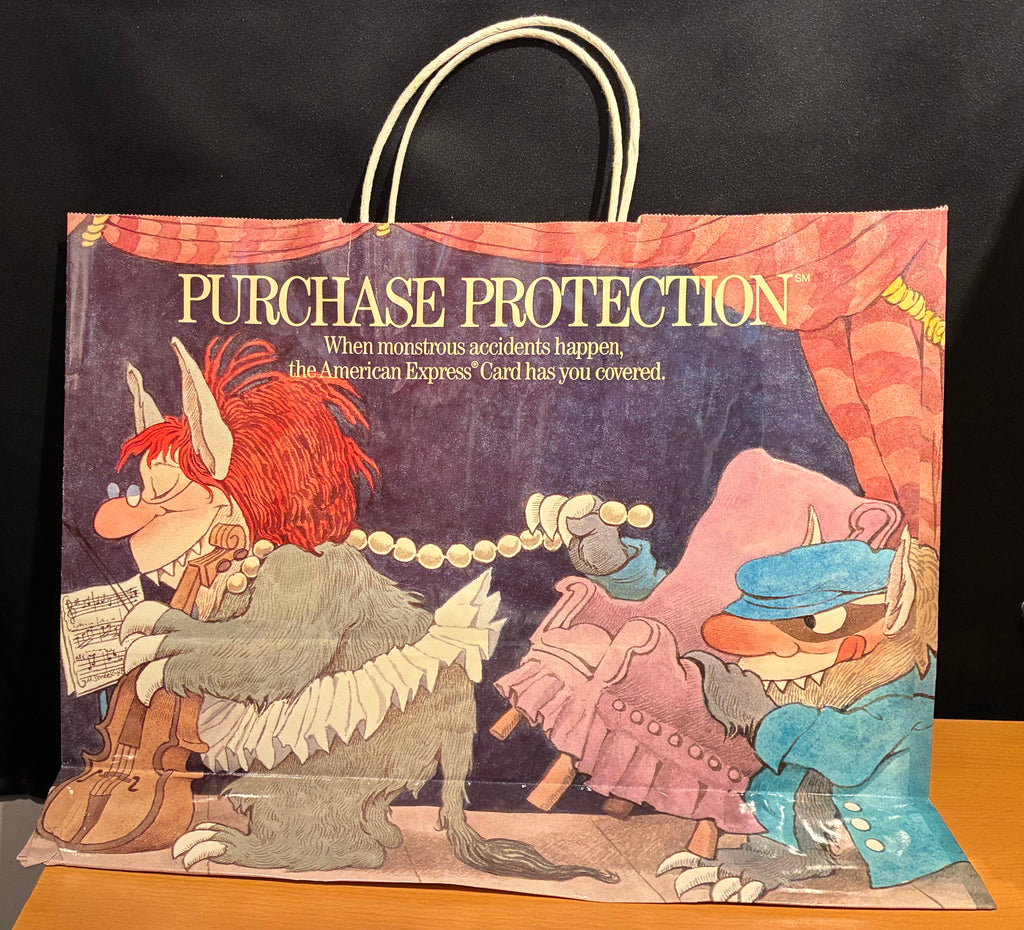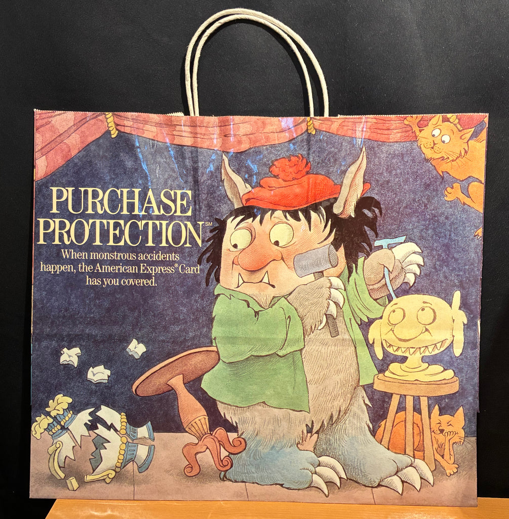1988 Holiday Shopping Bag featuring full color art by Maurice Sendak for American Express promoting its Purchase Protection program. On one side is the image of a Wild Thing-like character creating a sculpture while accidentally knocking over a vase, which lies broken beside him. One cat smirks in the corner, while another looks on in amusement from overhead where it is hanging from curtains. On the other side is the image of a Wild Thing-like character playing a cello and not noticing a masked Wild Thing-like character stealing their pearl necklace. The artwork extends onto the side panels, where there is marketing copy about the Purchase Protection program as well as an American Express card in Maurice Sendak’s name (we hope that wasn’t his real card number!) A scarce Sendak collectible.