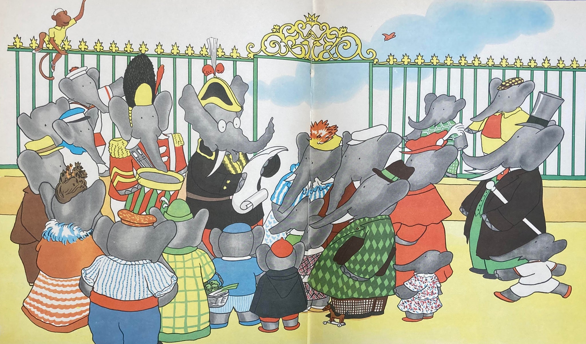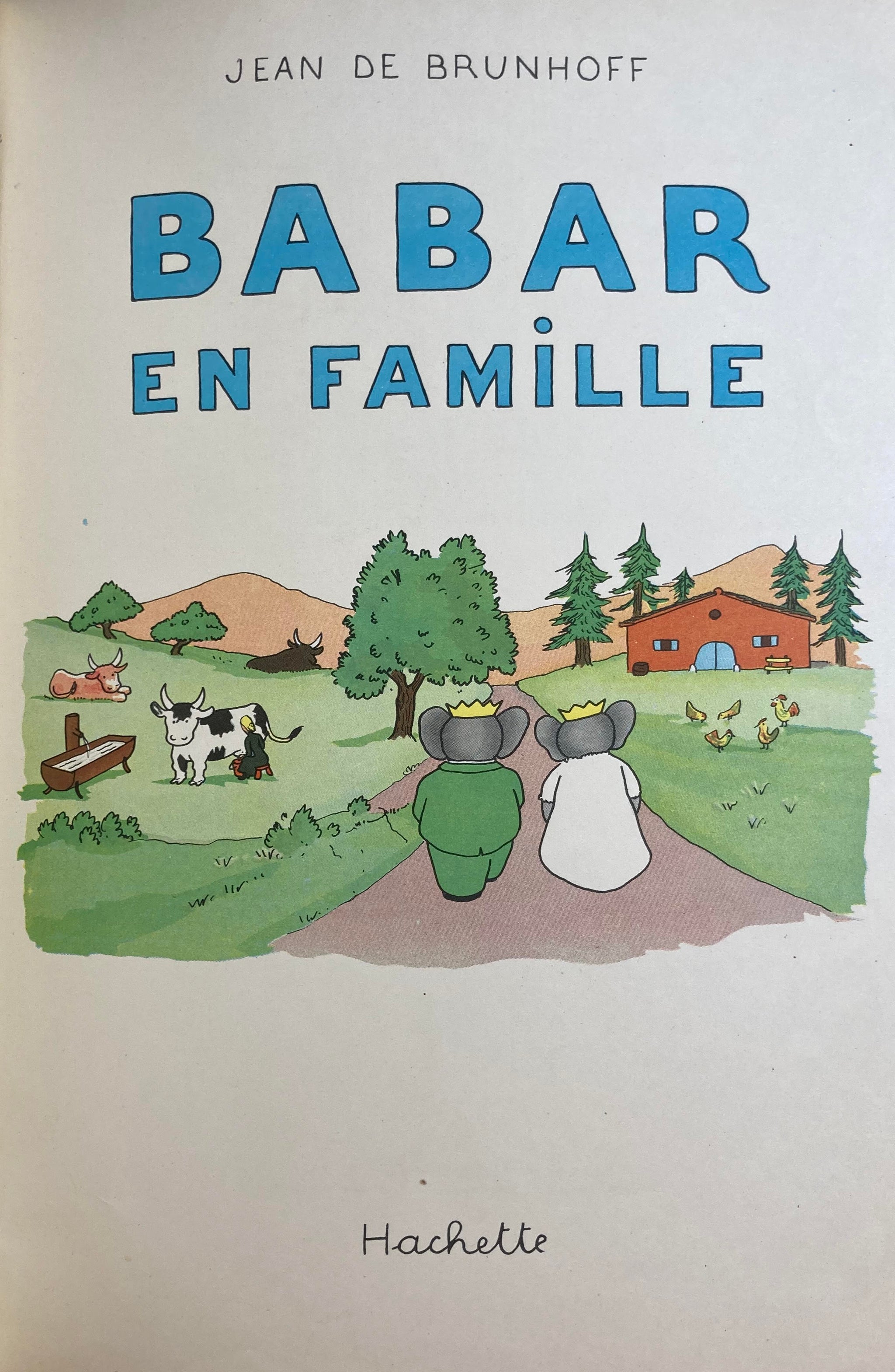 de BRUNHOFF, Jean. Babar en Famille. Paris: Hachette [1938]. 4to, [40]pp. Gray quarter-cloth with color pictorial boards. Color pictorial endpapers; color illustrations on nearly every page. Spine and edges a bit worn, corners bumped, light scratching to covers, else an internally clean, bright copy.
