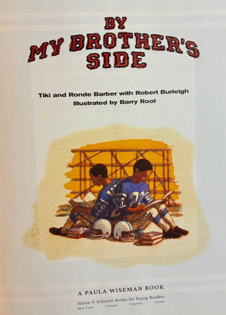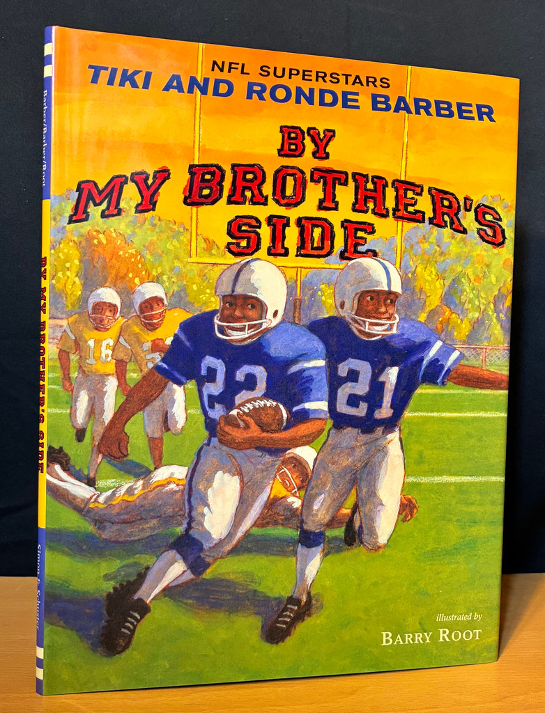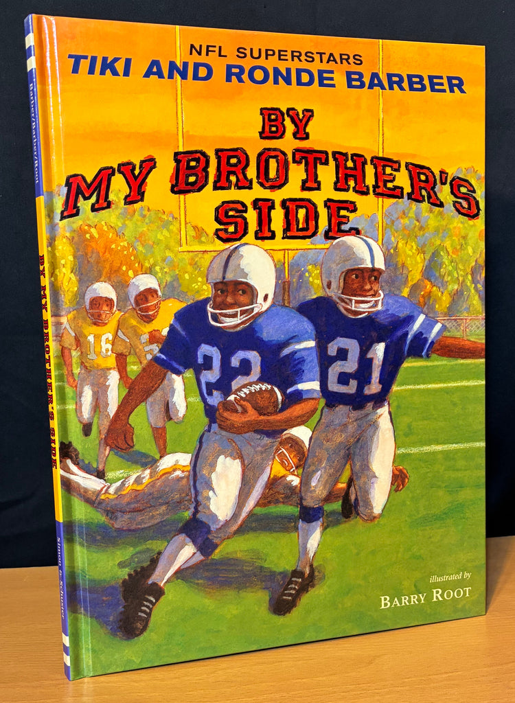 BARBER, Tiki and Ronde. By My Brother's Side. by Tiki and Ronde Barber with Robert Burleigh. Illustrated by Barry Root. NY: Simon & Schuster [2004]. 8vo, [32]pp. Color pictorial boards. Orange endpapers; color illustrations on every page. A fine copy in original color pictorial dust jacket. Signed by the authors, Tiki and Ronde Barber.