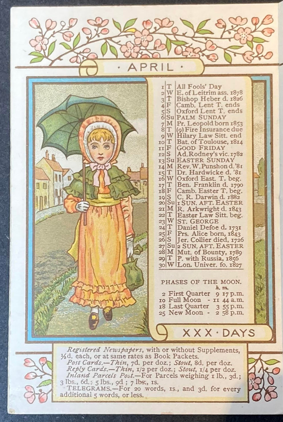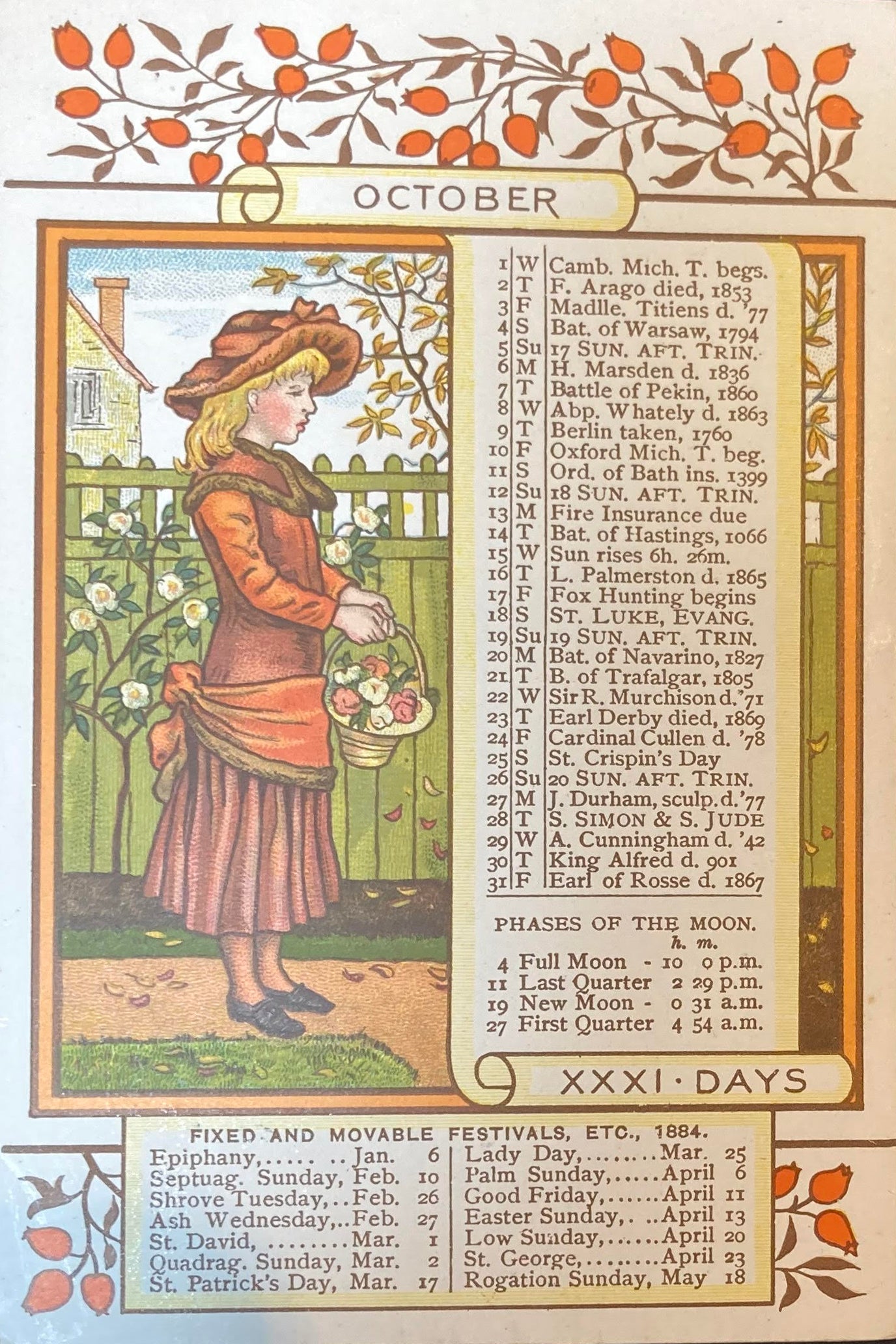 First and only edition. An illustrated calendar, each page featuring an illustration by celebrated illustrator Kate Greenaway for each of the months of the year and listing all of the important holidays and birthdays occurring on each day of the year in 1884. Kate Greenaway’s illustrations were extremely influential in the late 19th century, influencing children’s fashion trends of the time period. This charming book features wonderful examples of Greenaway’s artwork showing vintage children’s fashion. A delightful example of some of Greenaway’s most influential work.