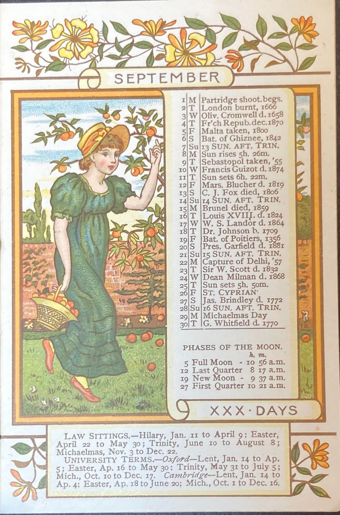 GREENAWAY, Kate. Calendar of the Months 1884. Designed by Thomas Crane. The Figures by Kate Greenaway. [London: Marcus Ward], 1884. 16mo, [12]pp. Color illustrations on every page. Slight wear around the edges, else a fine copy of this fragile booklet.