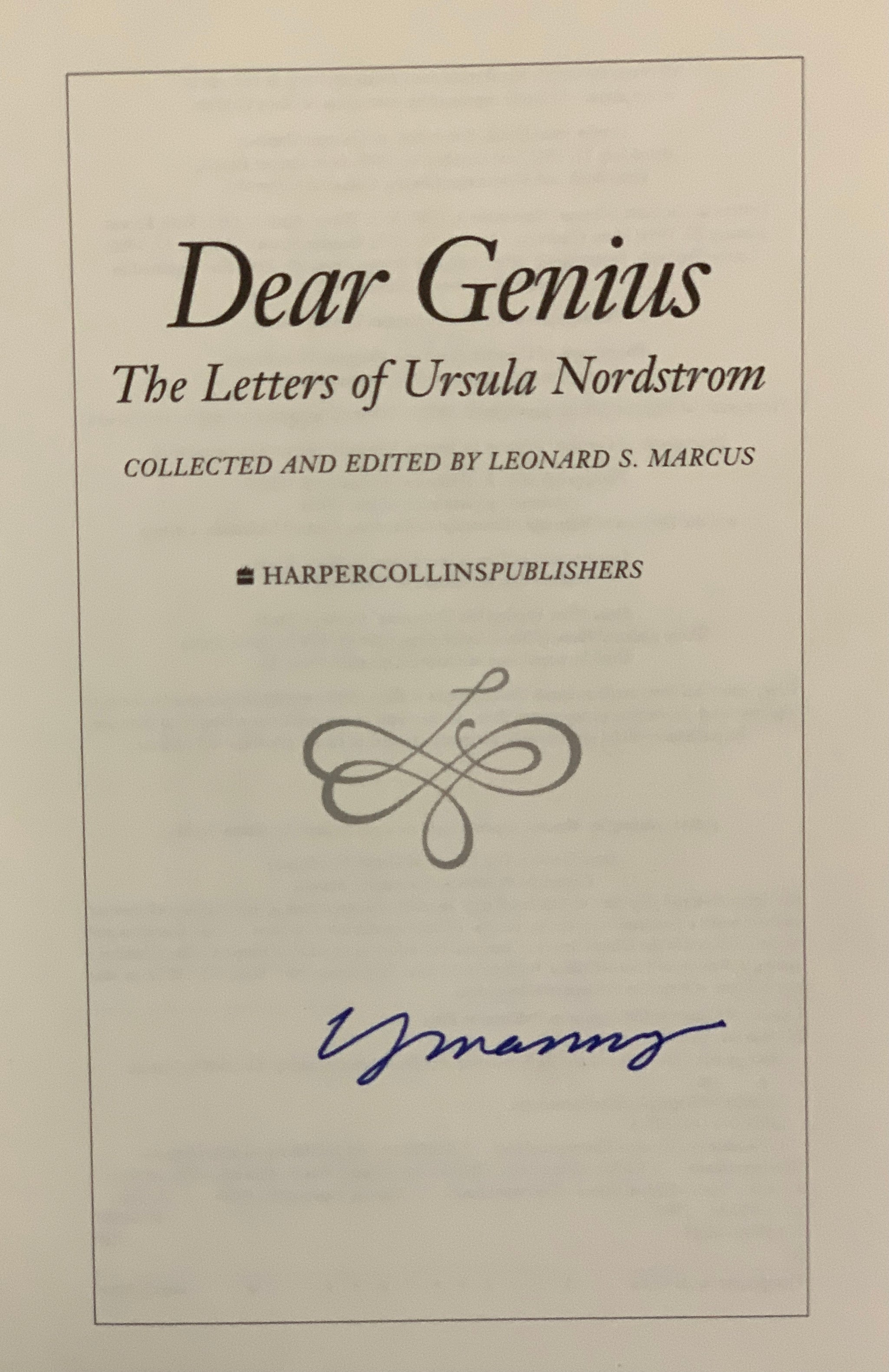 [REFERENCE]. Dear Genius. The Letters of Ursula Nordstrom. Collected and Edited by Leonard S. Marcus. [NY]: HarperCollins [1998]. 8vo, xlii 406pp. Brown quarter-cloth decoratively stamped in gold with tan boards decoratively stamped in gold. Beige endpapers; 17 pages of b&w photographs and documents. A fine copy in original color pictorial dust jacket. Signed by the editor, Leonard S. Marcus.