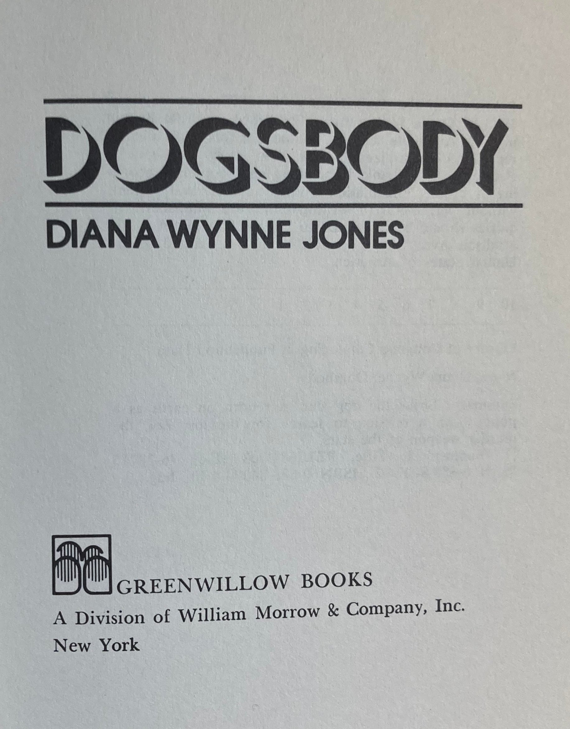 JONES, Diana Wynne. Dogsbody. NY: Greenwillow [1977]. 8vo, [x] 245pp. Orange boards stamped in black. Spine ends a tad rubbed, light foxing to top of sheets, else an internally clean, bright copy in original color pictorial dust jacket (slight wear to spine ends and corners).