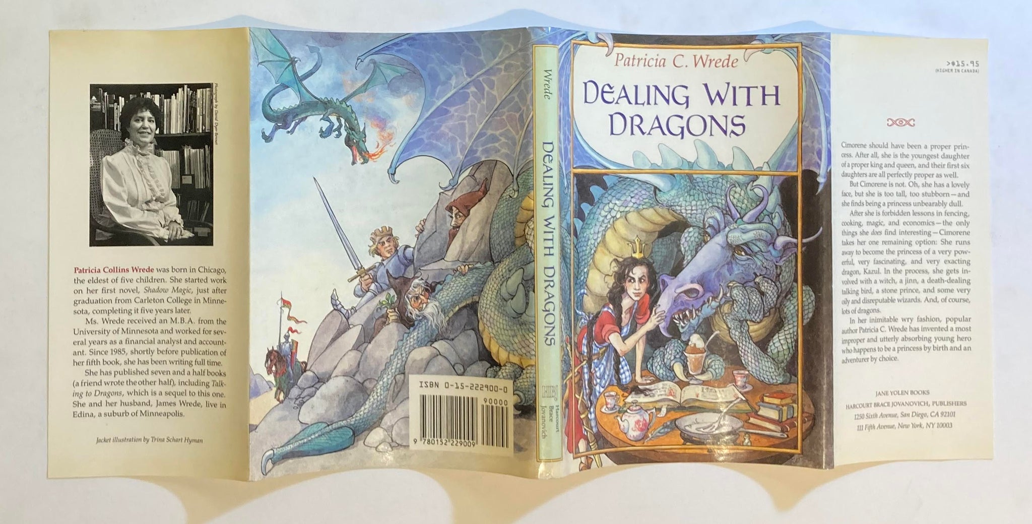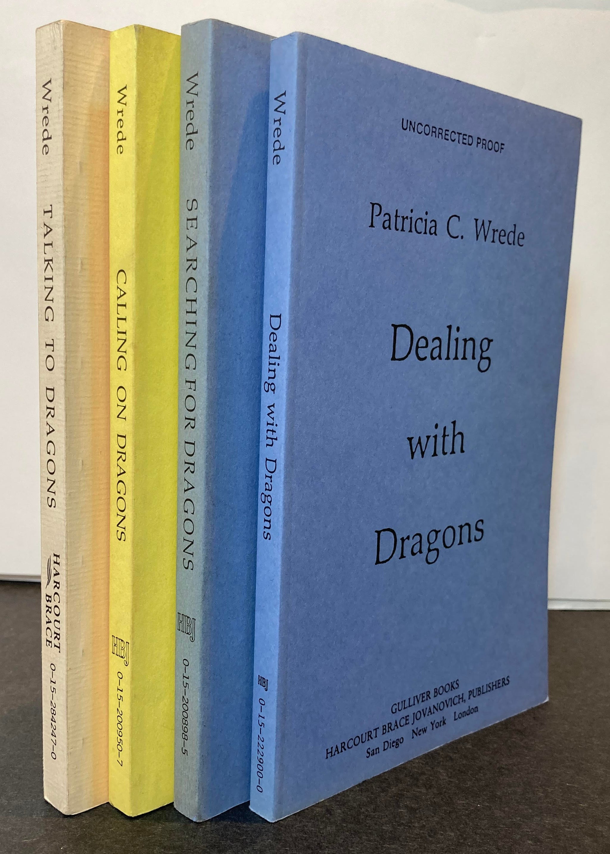 WREDE, Patricia. The Enchanted Forest Chronicles. Four volumes, being Dealing with Dragons; Searching for Dragons; Calling on Dragons; and Talking to Dragons. San Diego: Harcourt Brace Jovanovich and Harcourt Brace & Company [1990-1993]. 8vo, [x] 174pp; [xii] 200pp; [xii] 201pp; [xii] 225pp. Blue, yellow and peach paper wrappers printed in black. Spine ends of volumes 2 and 4 minutely rubbed, spine and edges of front wrapper of volume 4 sunned, else clean, sharp copies. Volume one comes with a copy of the first edition dust jacket for the hardcover that features the artwork by Caldecott Medalist Trina Schart Hyman (light edge wear).