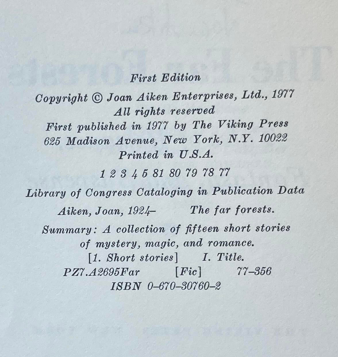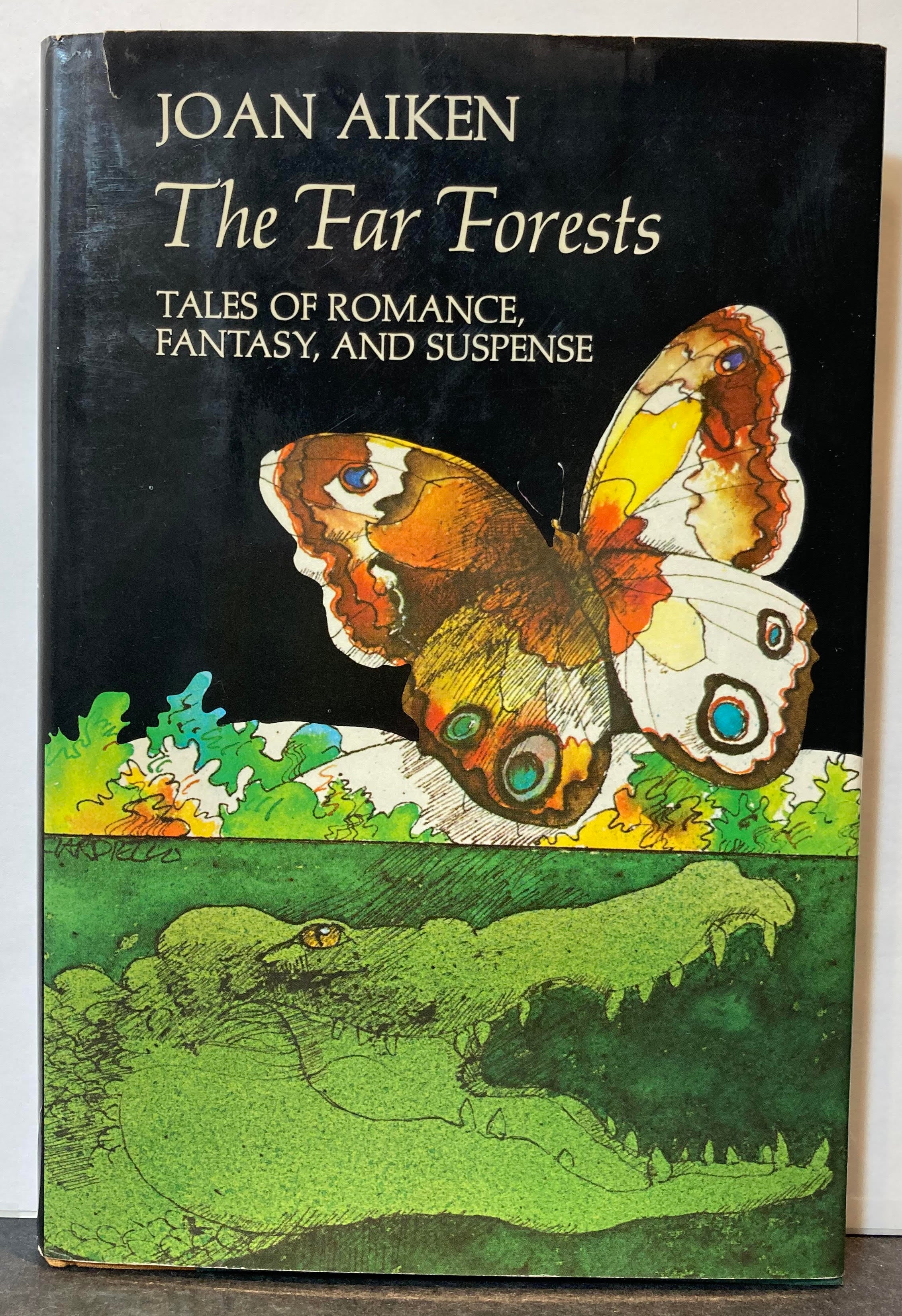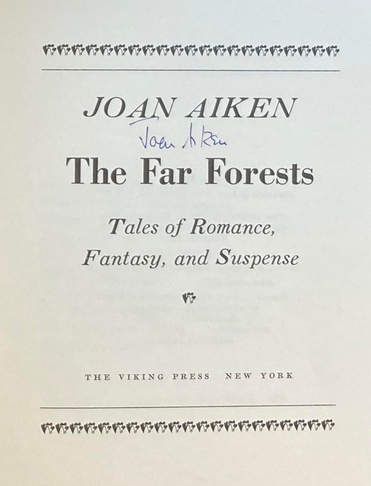 AIKEN, Joan. The Far Forests. Tales of Romance, Fantasy, and Suspense. NY: Viking [1977]. 8vo, [vi] 154pp. Orange quarter-cloth stamped in black with green boards. Orange endpapers. Spine ends a tad rubbed, else a fine copy in original color pictorial dust jacket (½” closed tear at top of front panel, spine ends minutely rubbed). Signed by the author, Joan Aiken.