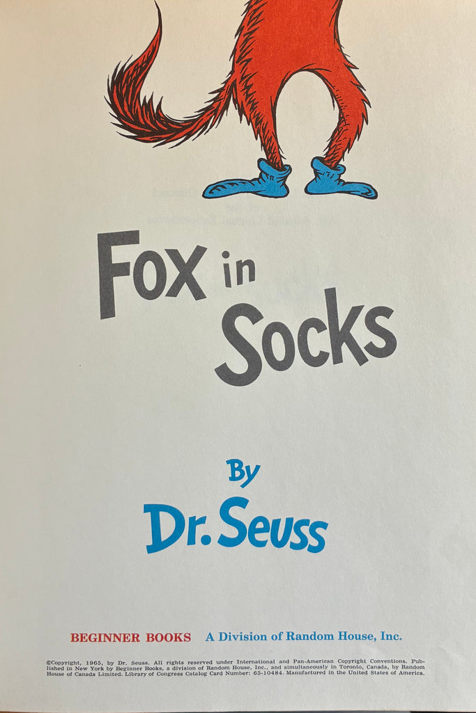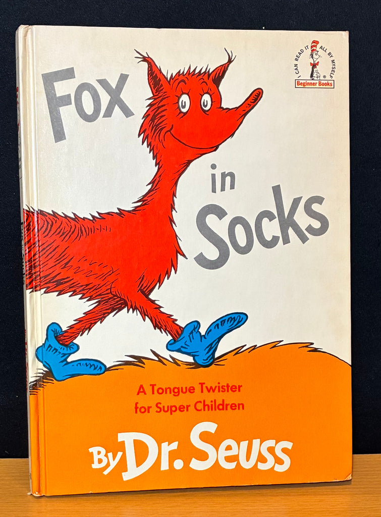 SEUSS, Dr. Fox in Socks. NY: Beginner Books, 1965. 8vo, [ii] 62pp. Glazed color pictorial boards. Color pictorial endpapers; color illustrations on every page. Lower edge a tad rubbed, blank ownership plate affixed to front fixed endpaper, previous owner’s name in ink at top of front free endpaper, slight discoloration to upper internal edge of boards from binder’s glue. Otherwise a clean, tight copy in original color pictorial dust jacket (spine ends a tad rubbed, notations in pencil on rear panel).