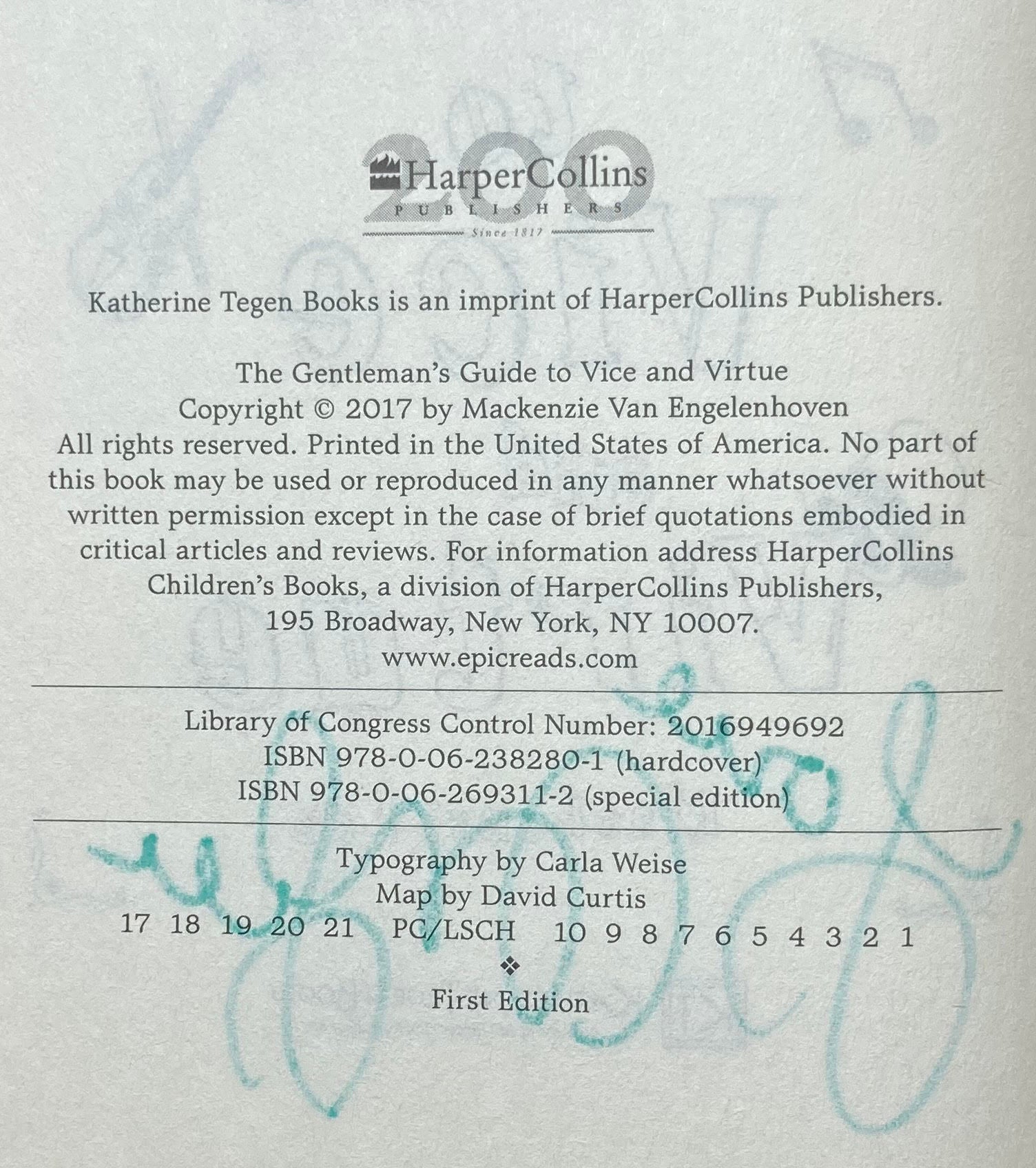 LEE, Mackenzi The Gentleman’s Guide to Vice and Virtue. [NY]: HarperCollins [2017]. 8vo, [x] 513pp. Black boards with spine stamped in yellow. Double-page map in black, white and gray. A fine copy in a fine dust jacket. Signed by the author, Mackenzi Lee.
