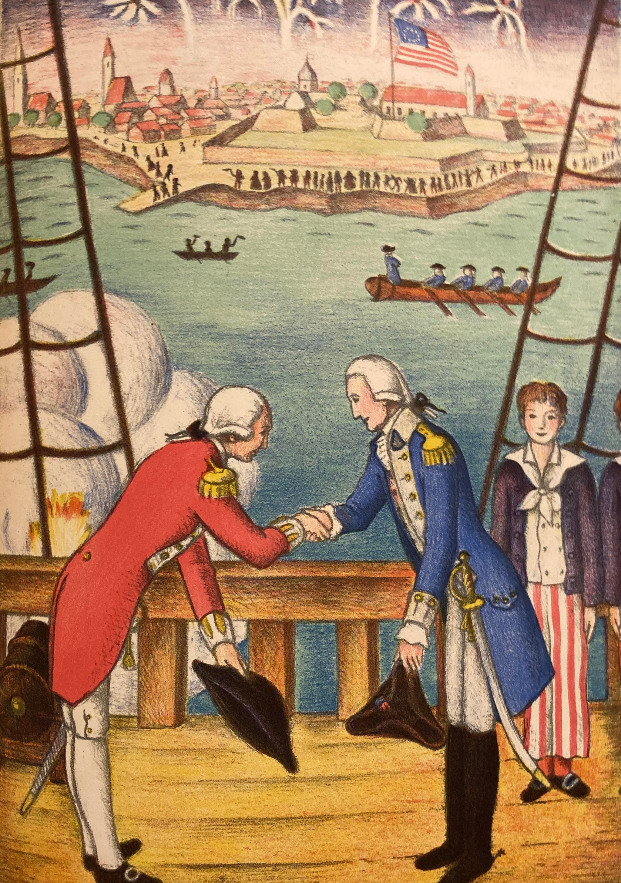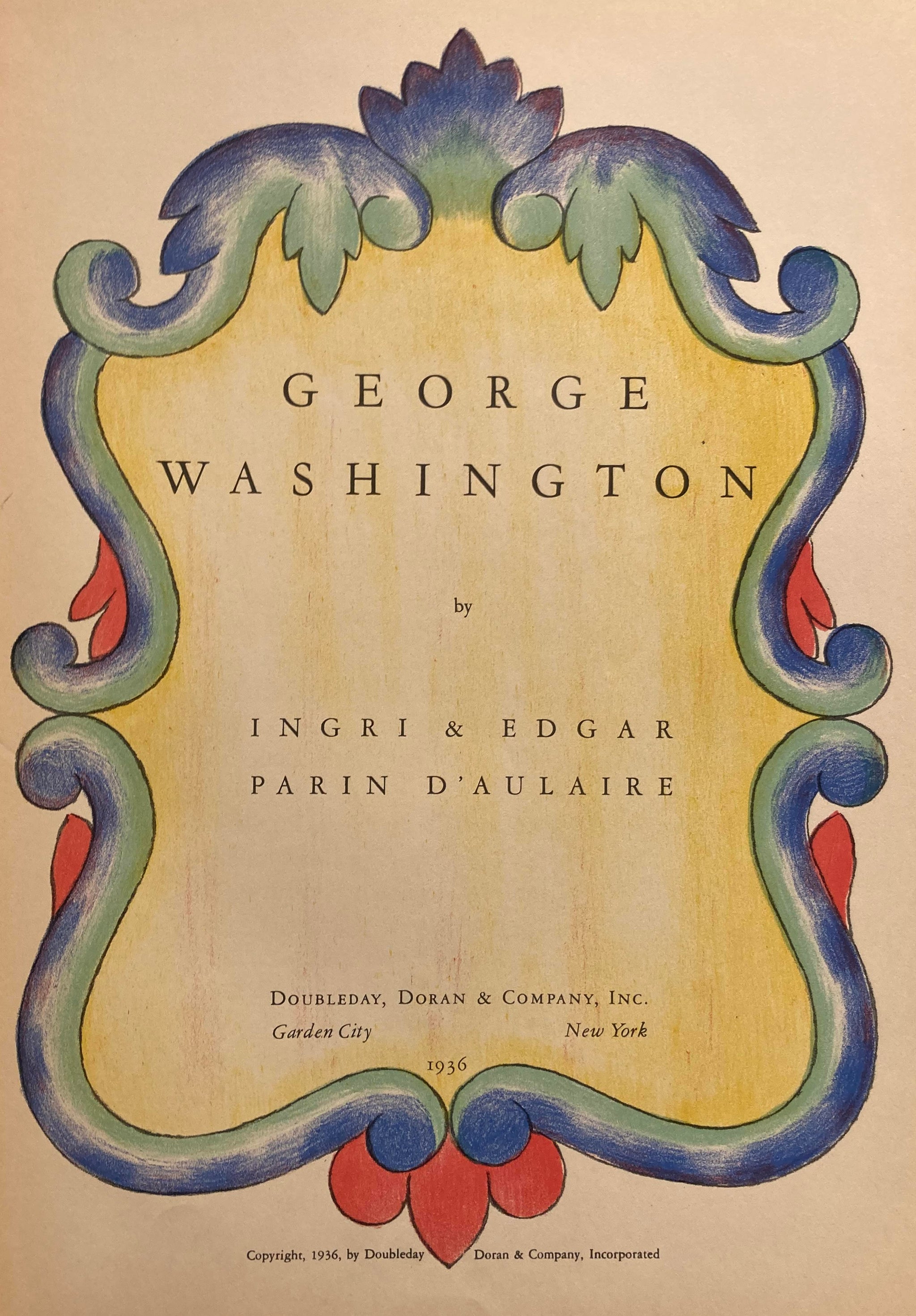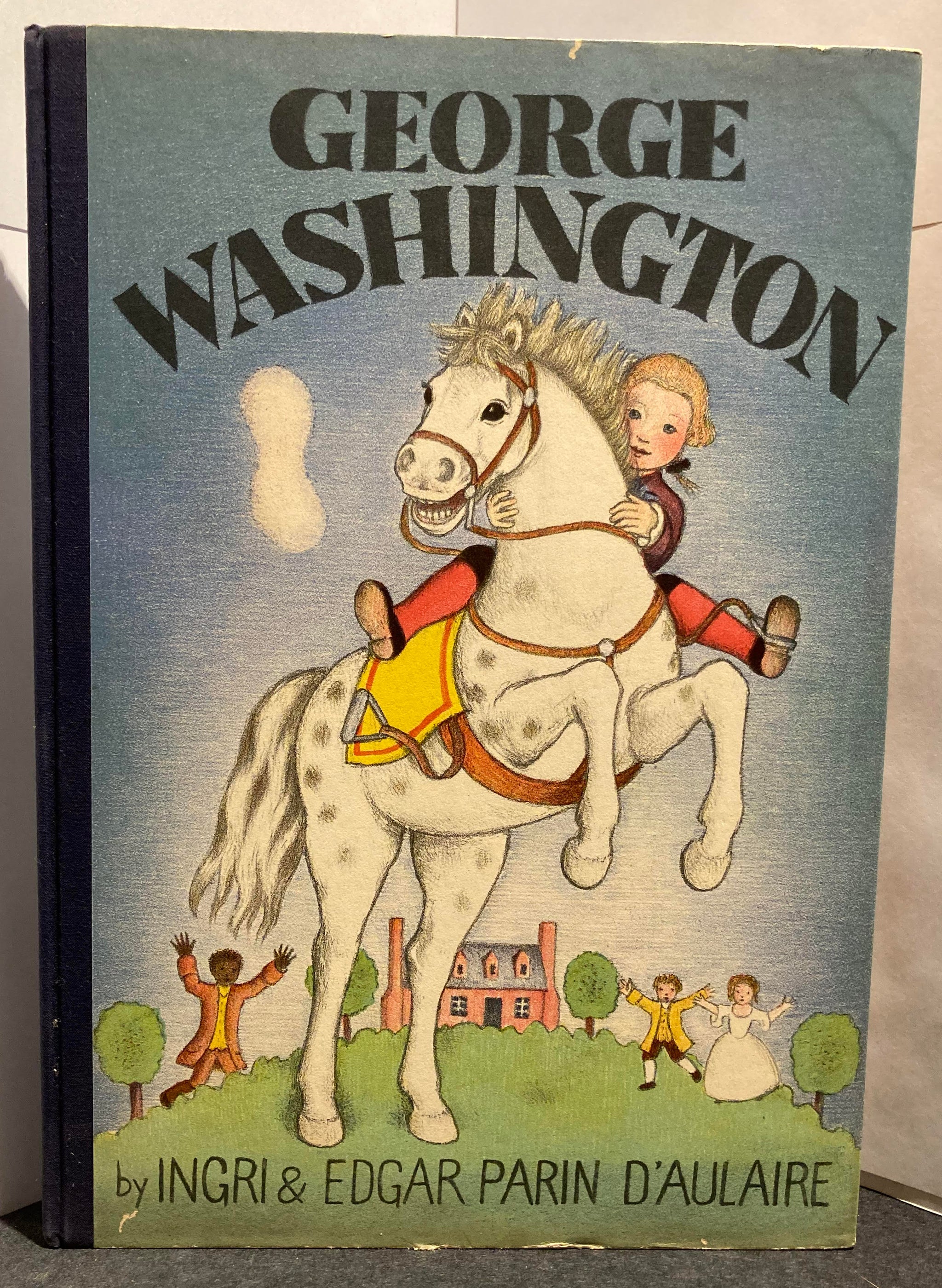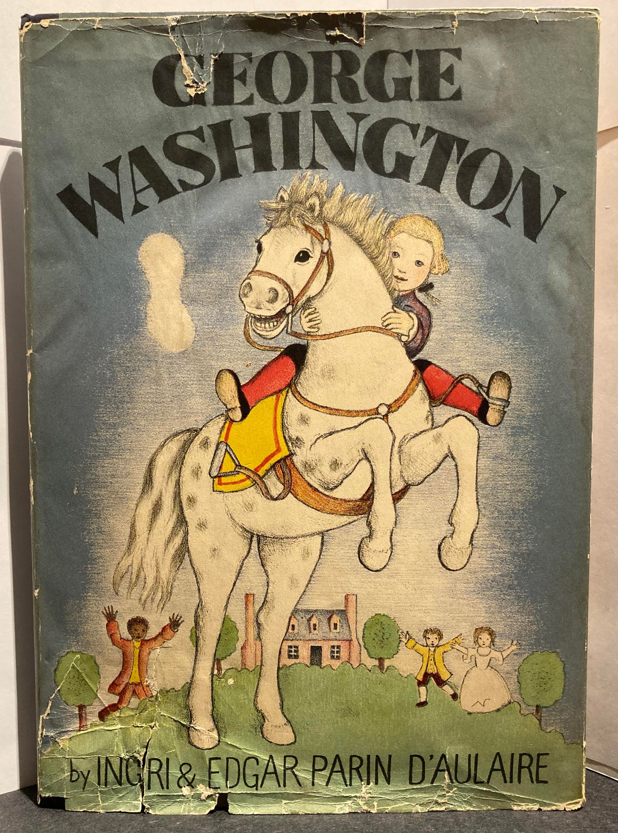 D’AULAIRE, Ingri and Edgar Parin. George Washington. Garden City: Doubleday, Doran and Co, 1936. 4to, [56]pp. Navy cloth spine with color pictorial boards. Color pictorial endpapers; 13 full-page and numerous smaller color illustrations lithographed on stone in five colors, plus 13 full-page and numerous small b&w illustrations, all from stone lithographs. Upper and lower edges of boards a bit worn, a few tiny scratches to covers, else a clean, tight copy in original color pictorial dust jacket (heavily worn with several large closed tears and some chipping).