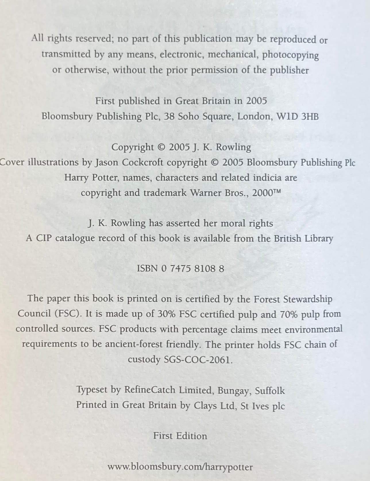 ROWLING, J[oanne] K[athleen]. Harry Potter and the Half-Blood Prince. [London]: Bloomsbury, [2005]. 12mo, 607pp. Color pictorial boards. A fine copy, with expected page yellowing, in original pictorial dust jacket.