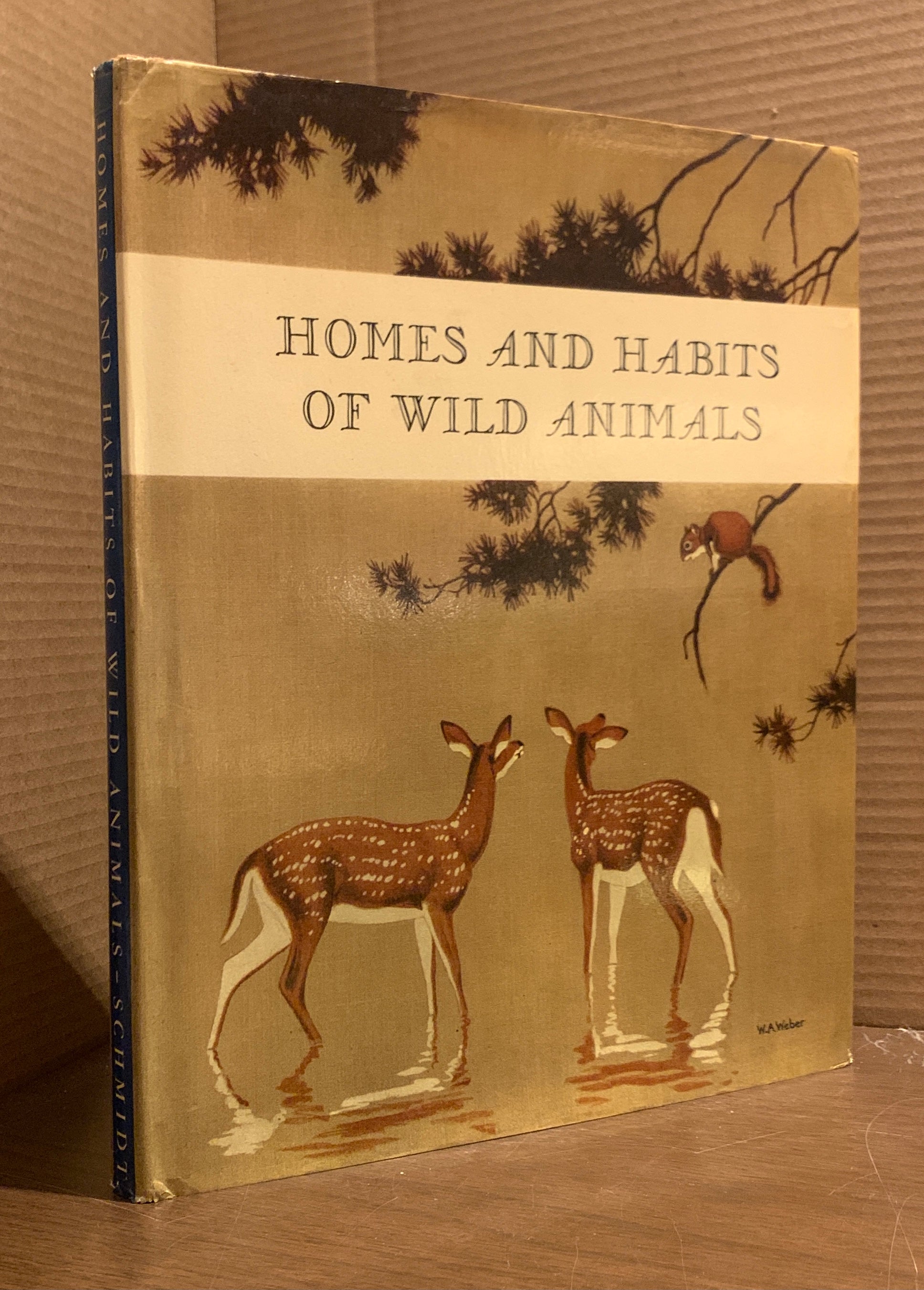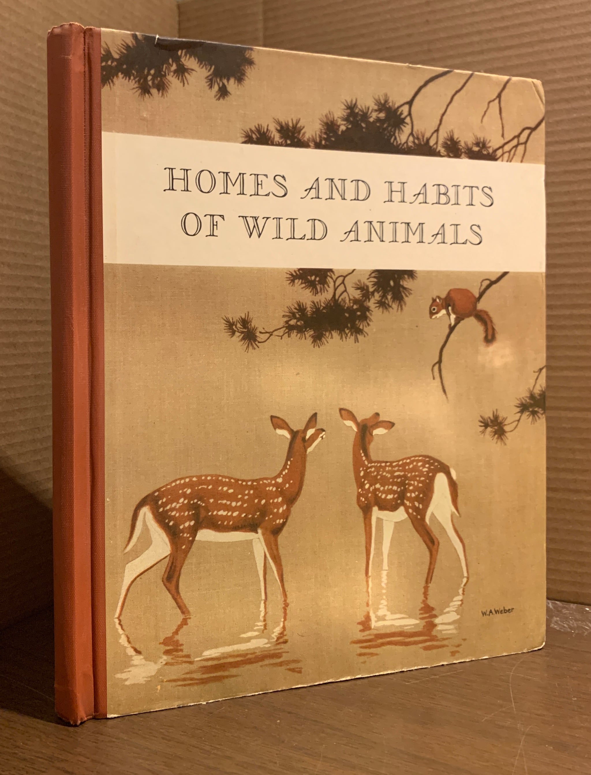SCHMIDT, Karl Patterson. Homes and Habits of Wild Animals. North American Mammals. Illustrated by Walter Alois Weber. Chicago: M.A. Donohue & Company [1934]. 4to, 64pp. Brown quarter-cloth with color pictorial boards. Pictorial endpapers in brown ink; 12 color plates plus b&w illustrations in the margins of every page. Spine ends, lower edges, and corners worn, upper corners bumped, upper Spine ends and lower edge rubbed, upper corners lightly bumped, bump at top of front board near spine, nonetheless an internally clean, bright copy in original color pictorial dust jacket (some light general edge wear).