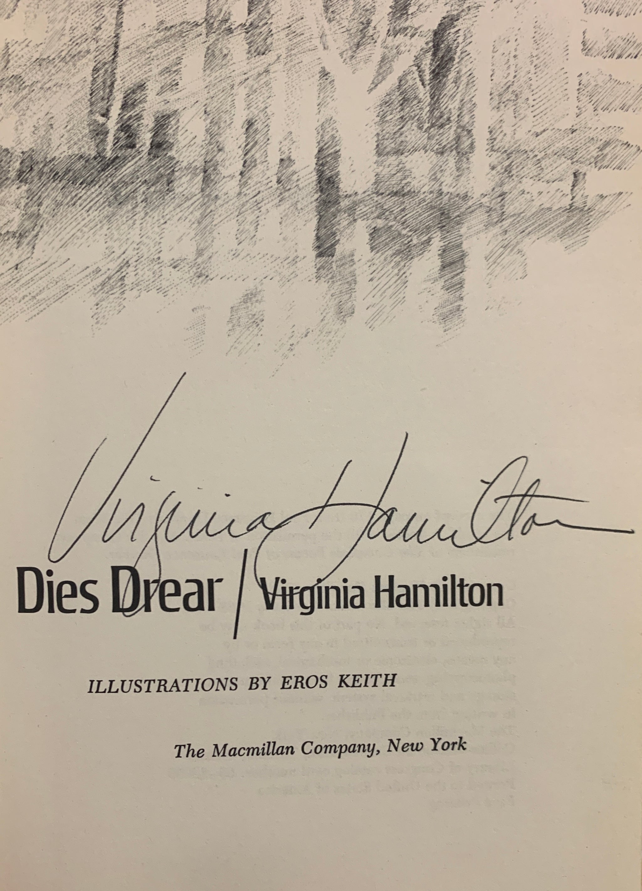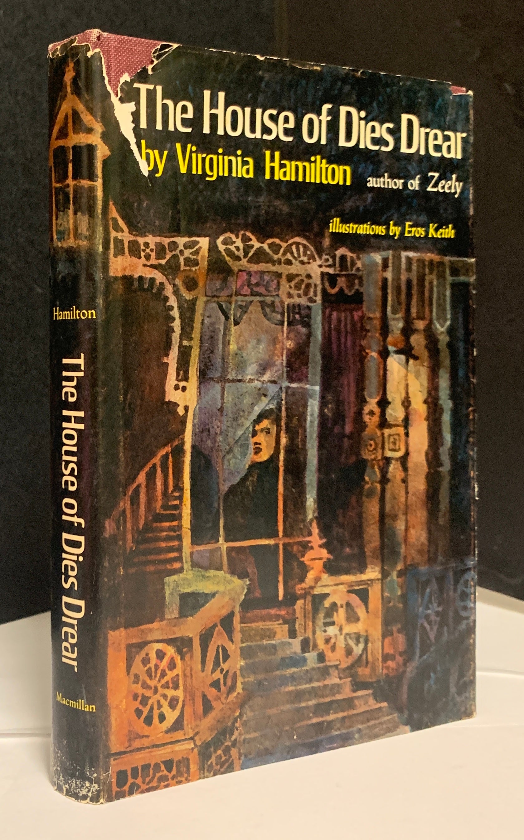 HAMILTON, Virginia. The House of Dies Drear. Illustrations by Eros Keith. NY: Macmillan [1968]. 8vo, [vi] 247pp. Dark purple cloth stamped in gold. 5 one-page and one two-page b&w illustrations. Spine ends and corners slightly rubbed, else a clean, bright copy in original color pictorial dust jacket (some chips and tears, but printed matter mostly unaffected). Signed by the author, Newbery Medalist Virginia Hamilton.