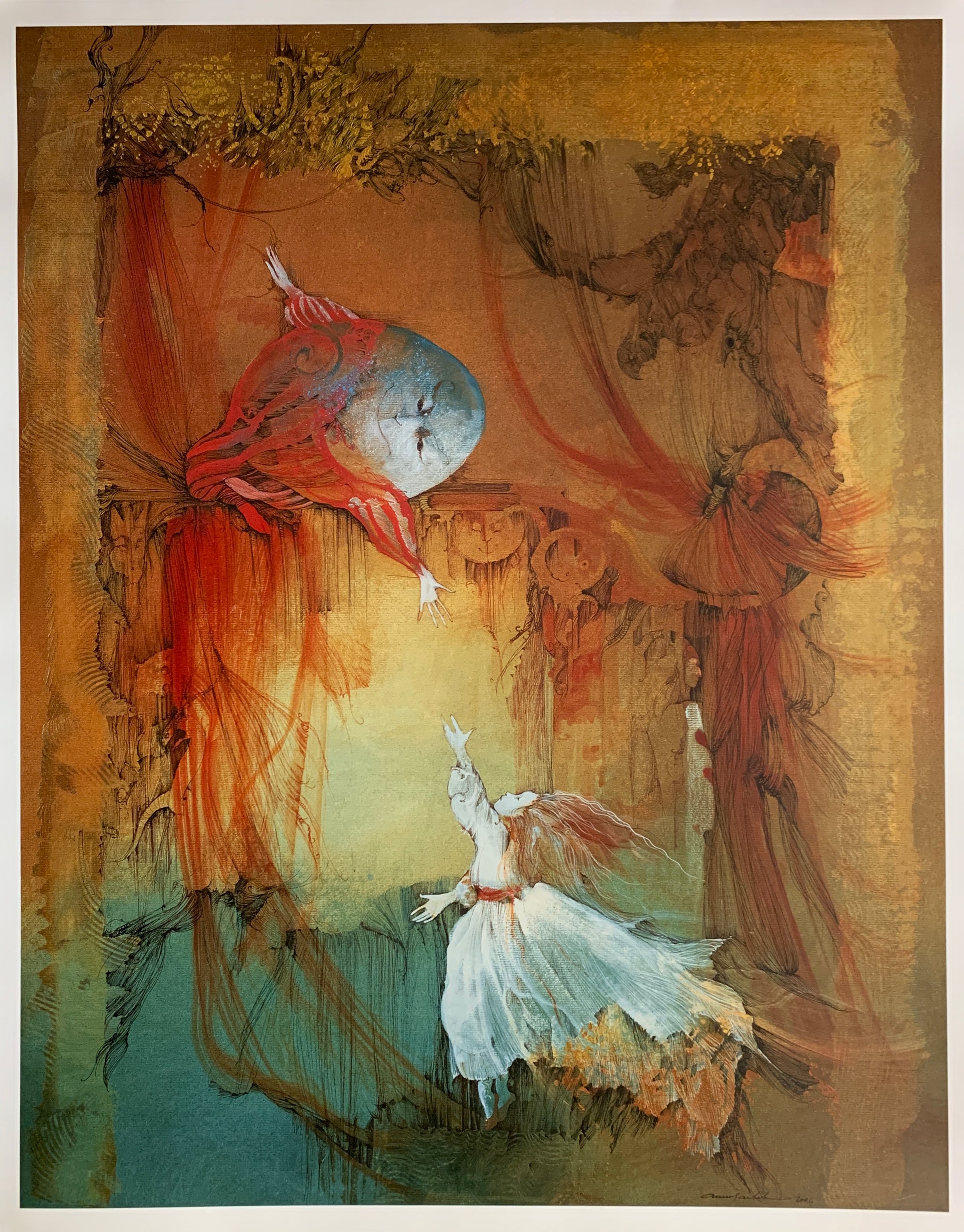 A poster created to celebrate the 2005 publication of Anne Bachelier's illustrated edition of Alice's Adventures in Wonderland and Through the Looking-glass and What Alice Found There. The image shows Alice meeting Humpty Dumpty from page 57 of Through the Looking-glass and What Alice Found There. The image measures 18.5" x 23.5" on a 19.75" x 25" poster.