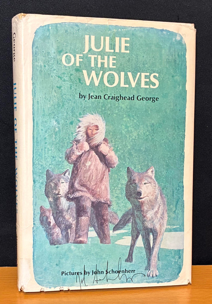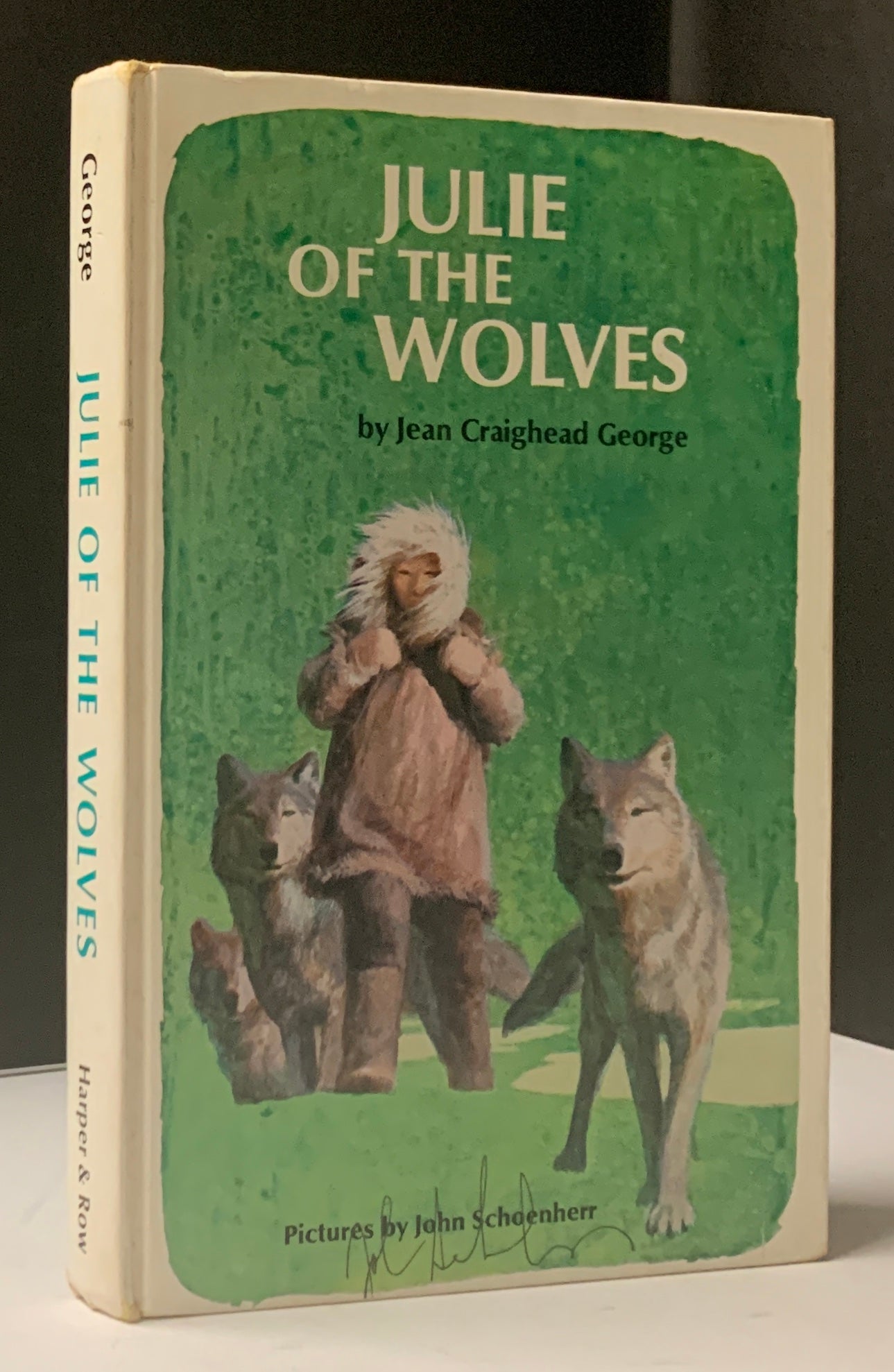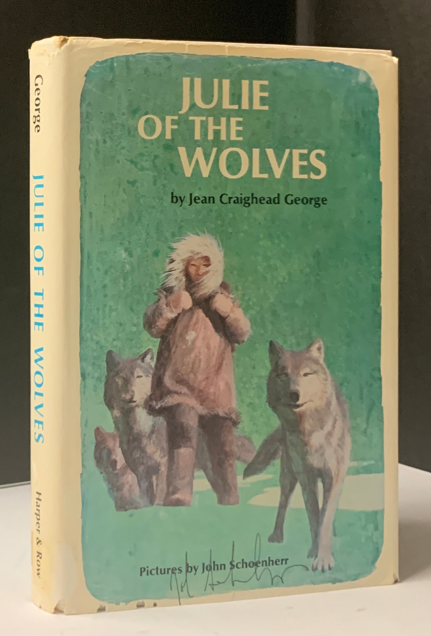 GEORGE, Jean Craighead. Julie of the Wolves. Pictures by John Schoenherr. NY: Harper & Row [1972]. 8vo, [xiv] 173pp. Color pictorial boards. Illustrated throughout in b&w. An internally clean, bright copy with spine ends rubbed and other edges showing light wear, in original color pictorial dust jacket (chipped at edges, rear panel damp-stained, some light soiling and wear, and evidence of tape removed from bottom of spine). Inscribed by the author, Jean Craighead George, and the artist, John Schoenherr, on the dedication page, and signed by the artist, John Schoenherr, on the jacket and the front cover of the book.
