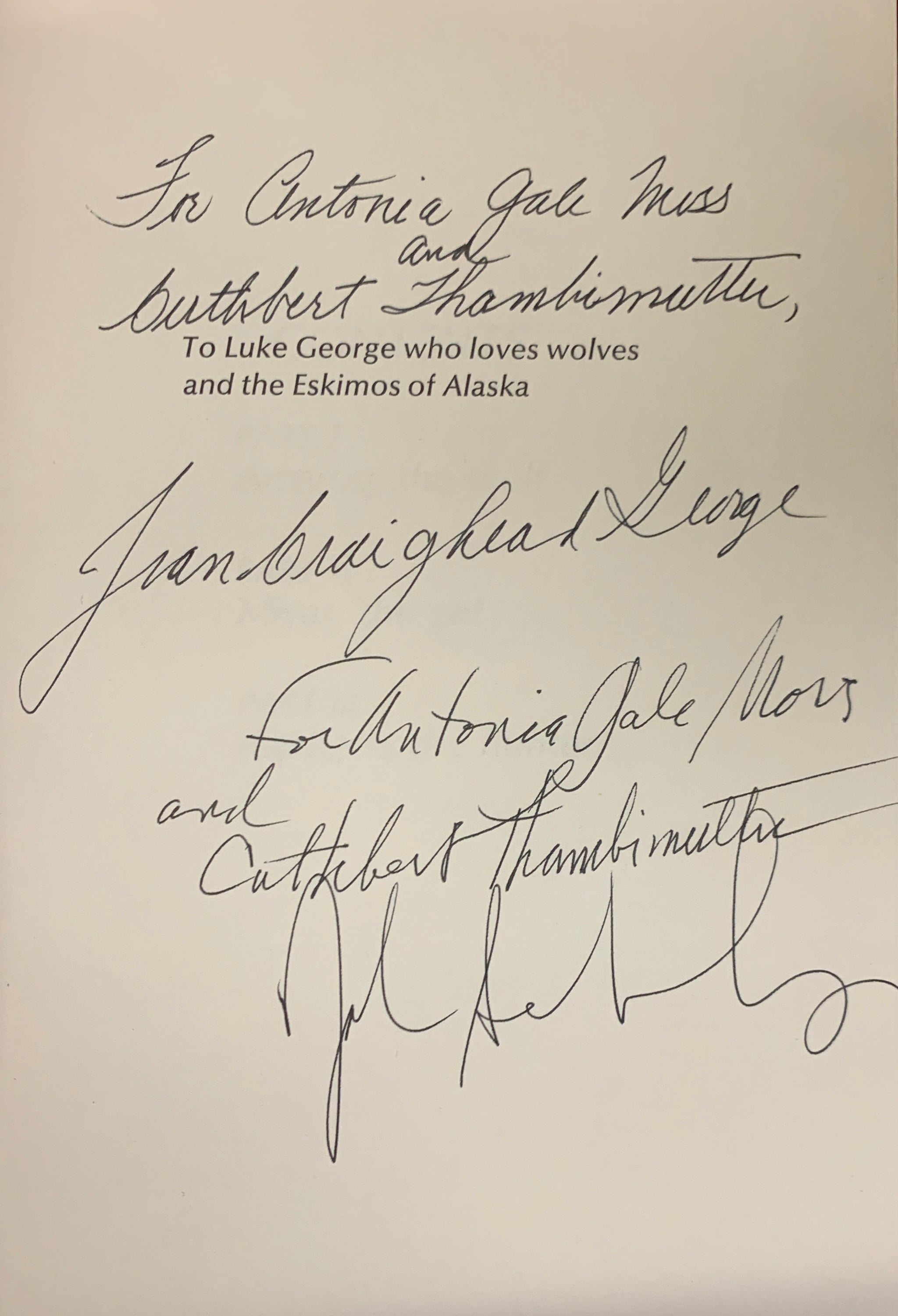 First edition. 1973 Newbery Medal Winner! To her small Eskimo village, she is known as Miyax; to her pen-pal in San Francisco, she is Julie. When her home life becomes intolerable, Miyax runs away and finds herself lost in the Alaskan wilderness. Adopted by a pack of wolves, Miyax struggles to survive by copying the ways of the pack, soon growing to love her new wolf family. But when she finds her way back to civilization, Miyax is torn between her old and new lives: is she Miyax of the Eskimos — or Julie of the wolves?