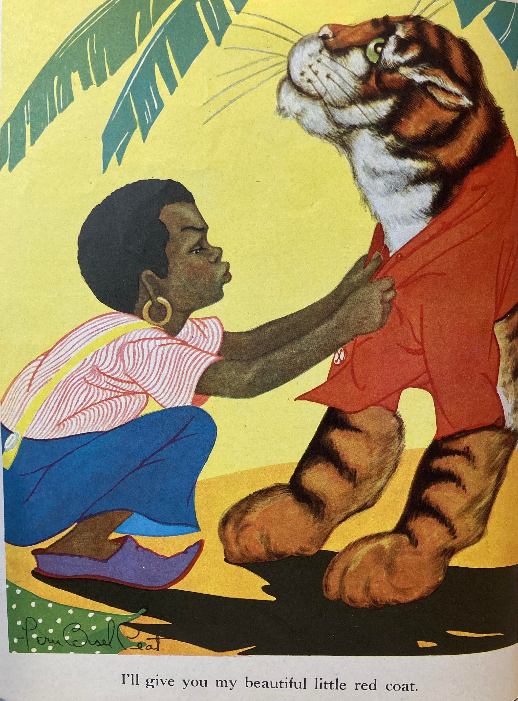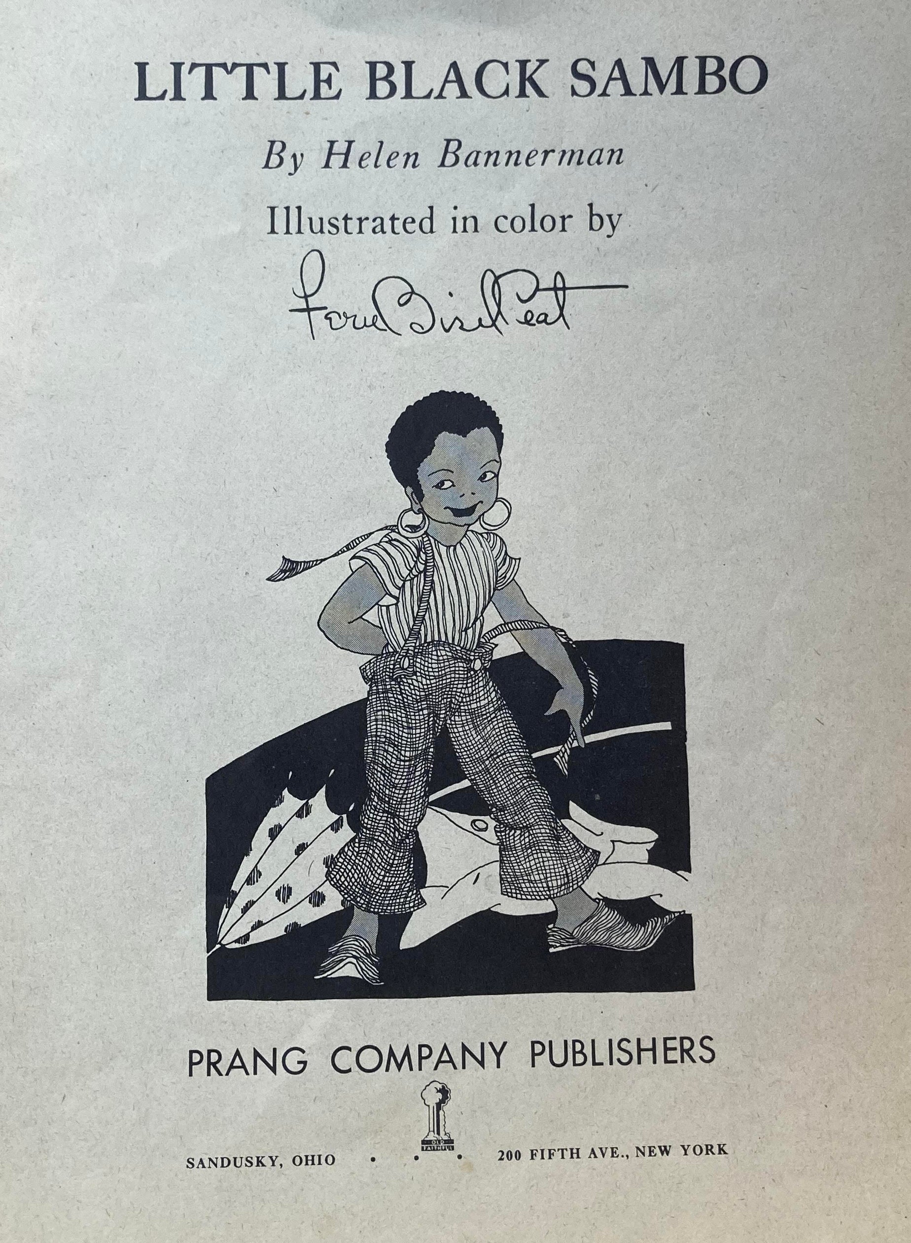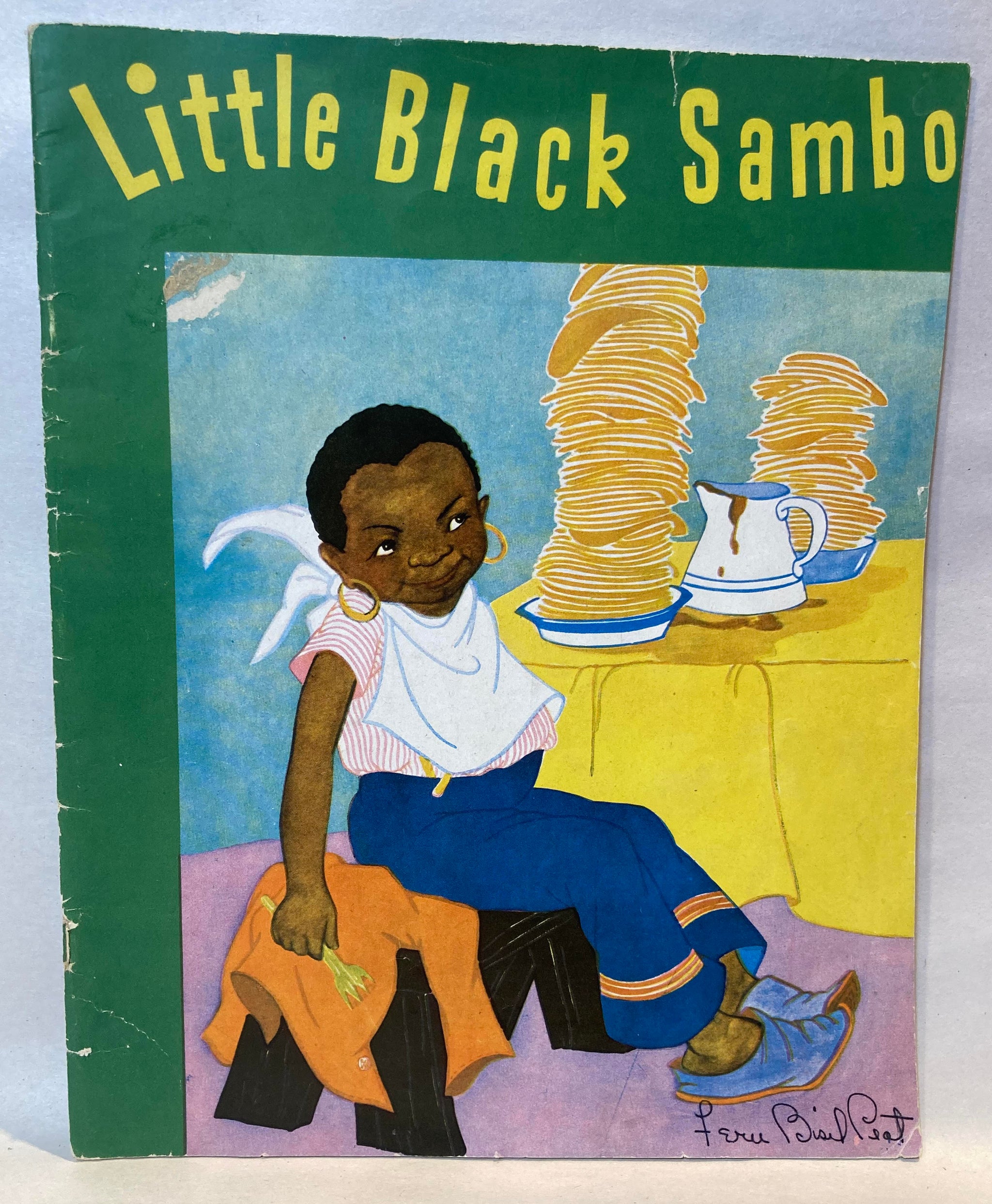 BANNERMAN, Helen. Little Black Sambo. Illustrated in color by Fern Bisel Peat. Sandusky, OH: Prang Company [1946]. 4to, [20]pp. Color pictorial wrappers. 5 full-page color lithographs and b&w illustrations on all other pages. All edges lightly worn, ½” closed tear at top of front, else an internally clean, bright copy of this fragile book.