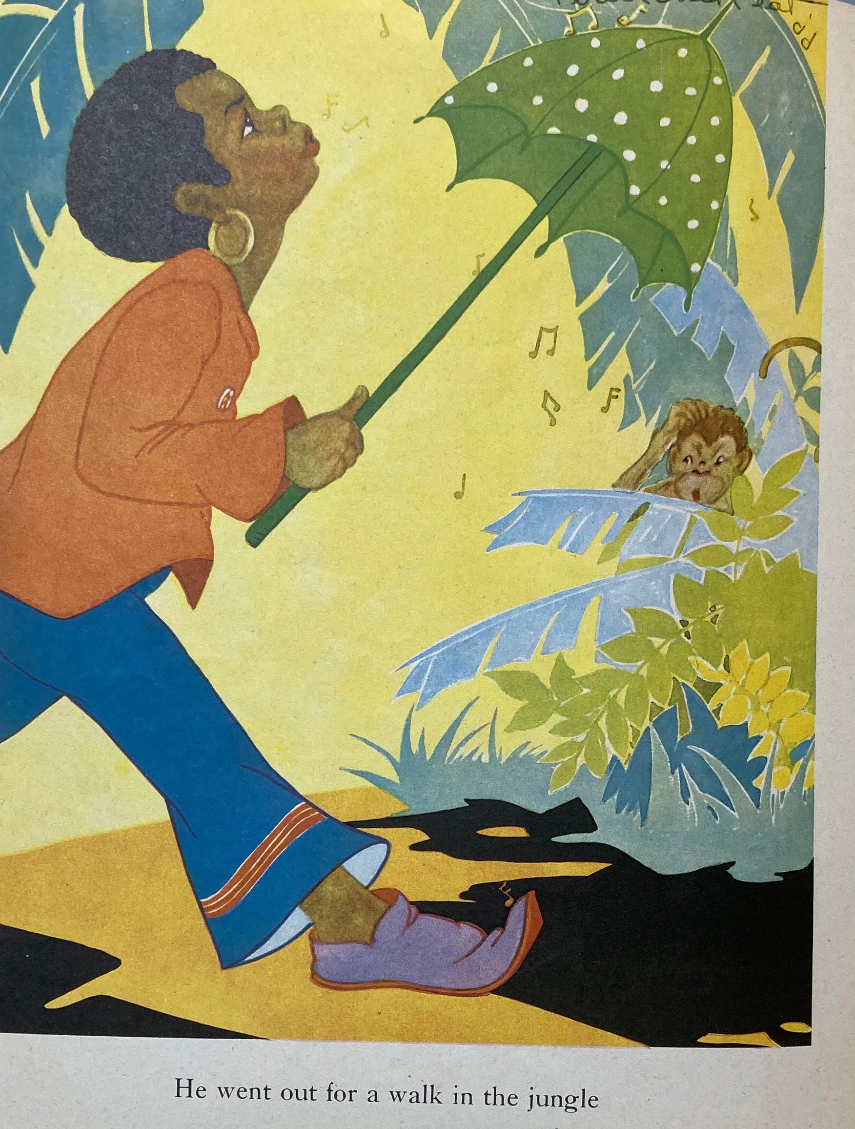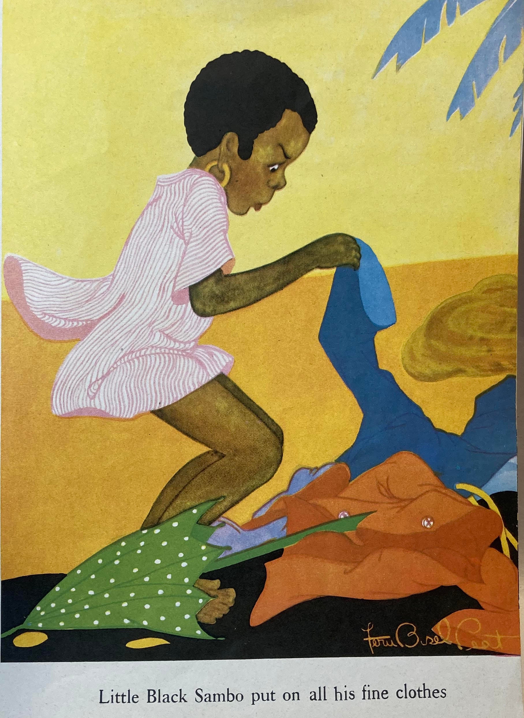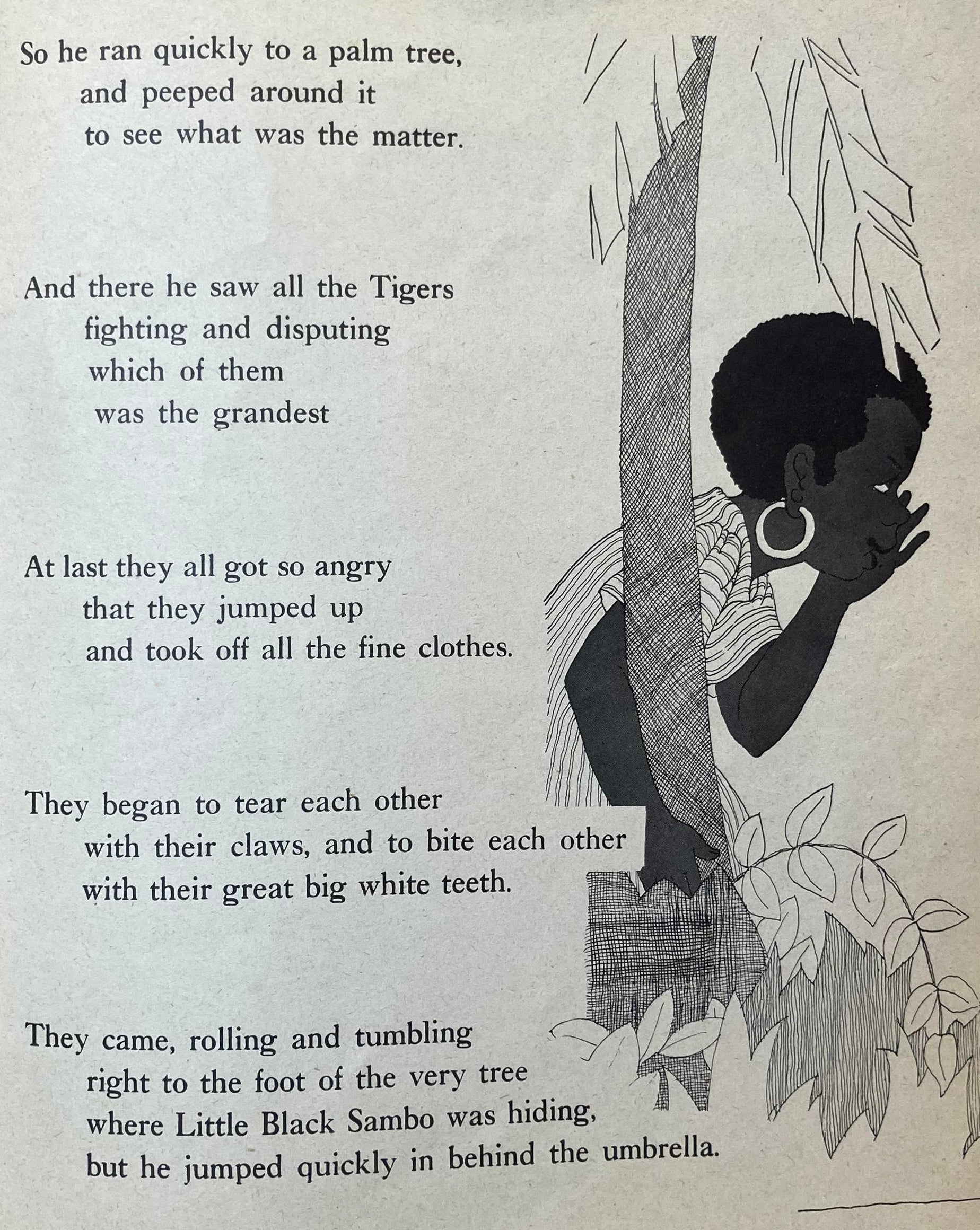 BANNERMAN, Helen. Little Black Sambo. Illustrated in color by Fern Bisel Peat. Sandusky, OH: Prang Company [1946]. 4to, [20]pp. Color pictorial wrappers. 5 full-page color lithographs and b&w illustrations on all other pages. All edges lightly worn, ½” closed tear at top of front, else an internally clean, bright copy of this fragile book.