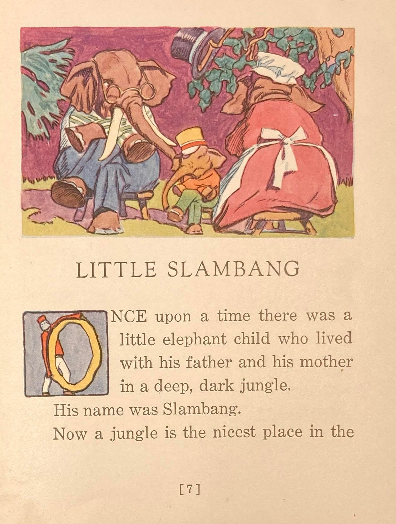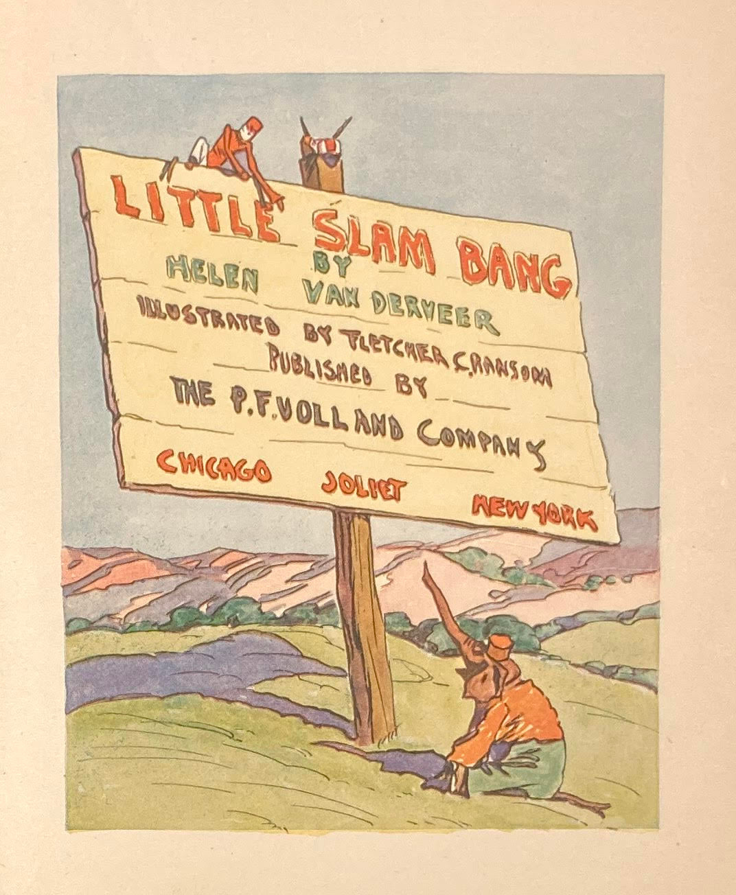VANDERVEER, Helen. Little Slam Bang. Illustrated by Fletcher Cransom. Chicago: P.F. Volland [1928]. 12mo, 38pp + 1 advt. Light green cloth spine with color pictorial boards. Color pictorial endpapers; color illustrations throughout. Light rubbing to spine ends and edges, boards lightly soiled, else an internally clean, bright copy.