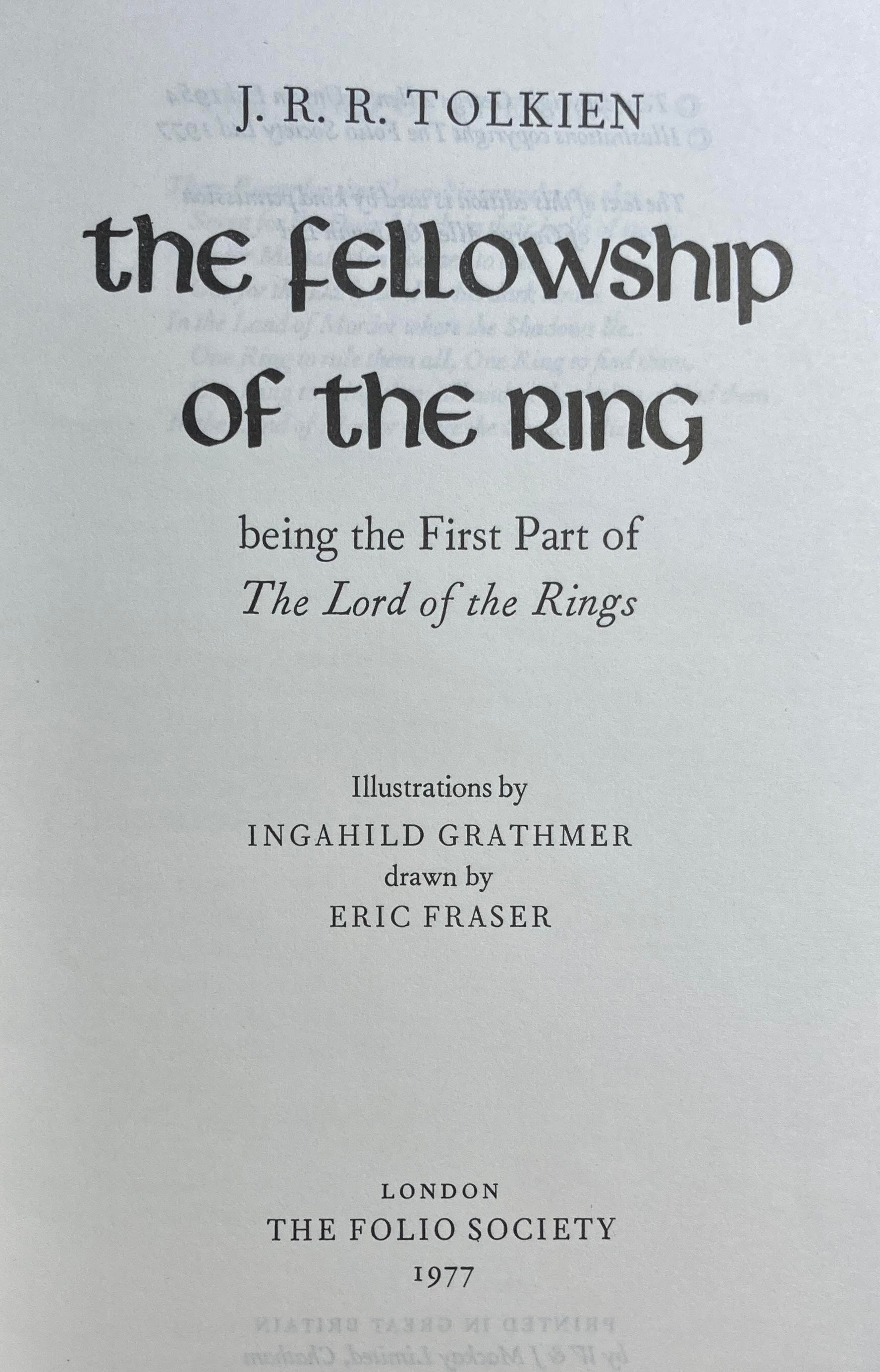 TOLKIEN, J[ohn] R[onald] R[euel]. The Lord of the Rings. Illustrations by Ingahild Grathmer. Drawn by Eric Fraser. London: The Folio Society, 1977. 8vos: 460pp, 373pp, & 488pp. Pale gray quarter-basil leather stamped in gold with gray cloth decoratively stamped in gold, all housed in a slipcase. Map endpapers; b&w frontispieces and illustrated chapter headings in each volume. A near fine set with spines a tad soiled and volume three bearing a tiny scratch at the front external hinge, housed in original cardboard slipcase (lightest edge wear, a bit rubbed at opening).