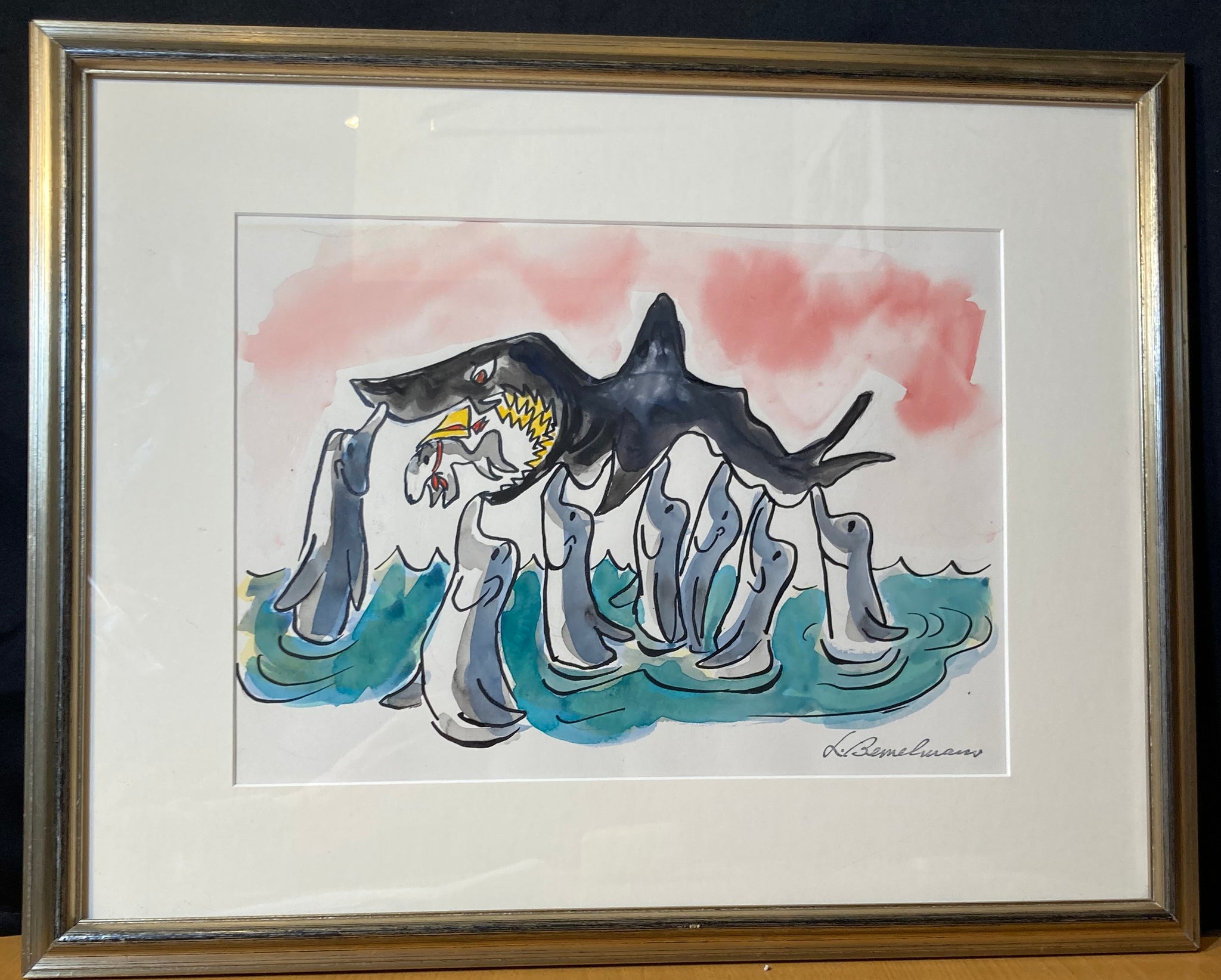Marina (1962). Bemelmans' final picture book was published posthumously in 1962, and the artwork was displayed after his death by the Hammer Gallery. When displaying the artwork, Hammer Gallery created a stamp of the author/artist's signature with which they stamped his unsigned original artwork for this book, and you can see the stamped signature at the bottom of this piece of art. The image measures 13" x 9 1/2" and in housed in a 19 1/2" x 15 1/2" frame.