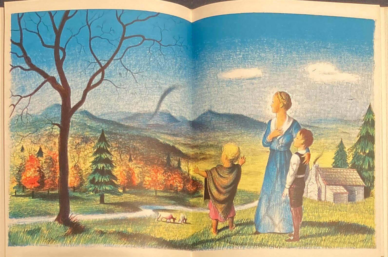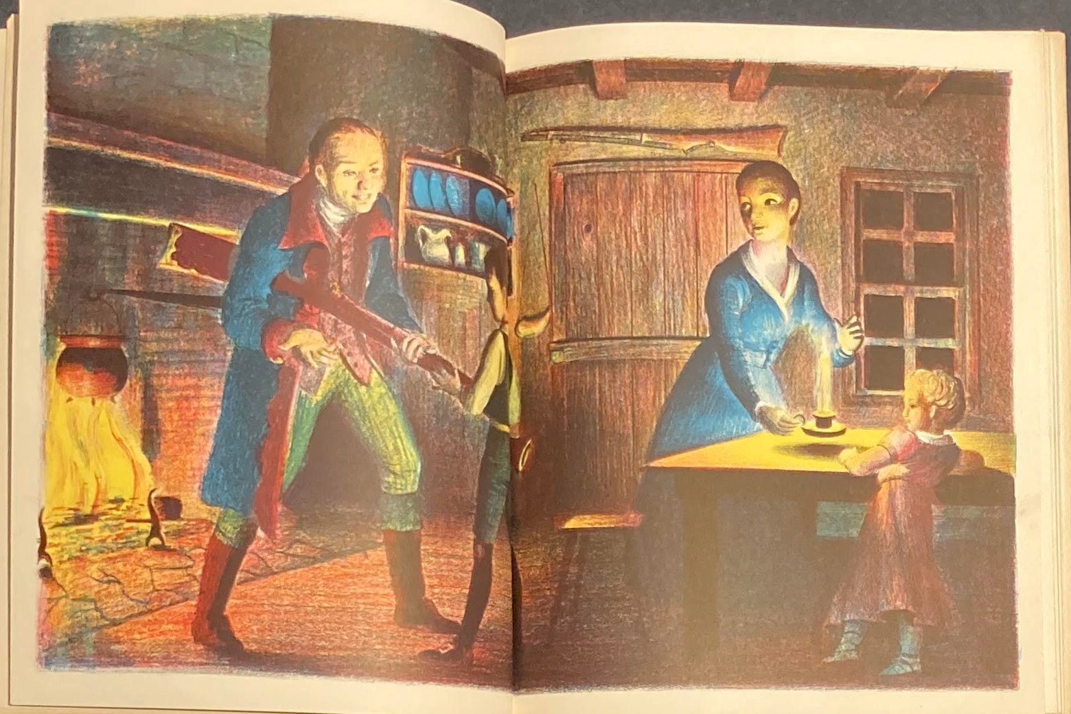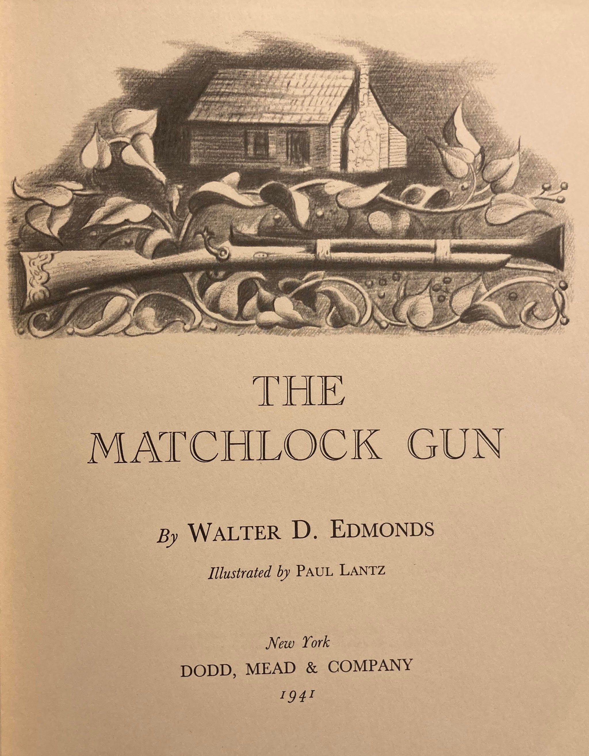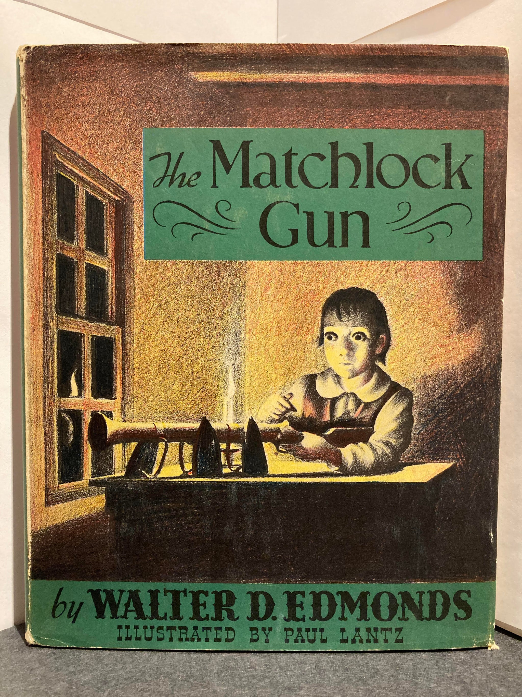 EDMONDS, Walter D[umaux]. The Matchlock Gun. Illustrated by Paul Lantz. NY: Dodd, Mead, 1941. 8vo, xiv 50pp. Beige buckram cloth stamped in brown. Pictorial endpapers; 6 double-page color spreads, 6 full-page and numerous textual b&w illustrations. Light rubbing to lower spine end and corners, else a fine copy in original color pictorial dust jacket (light edge wear, slight chipping to spine ends and corners, lightly sunned).