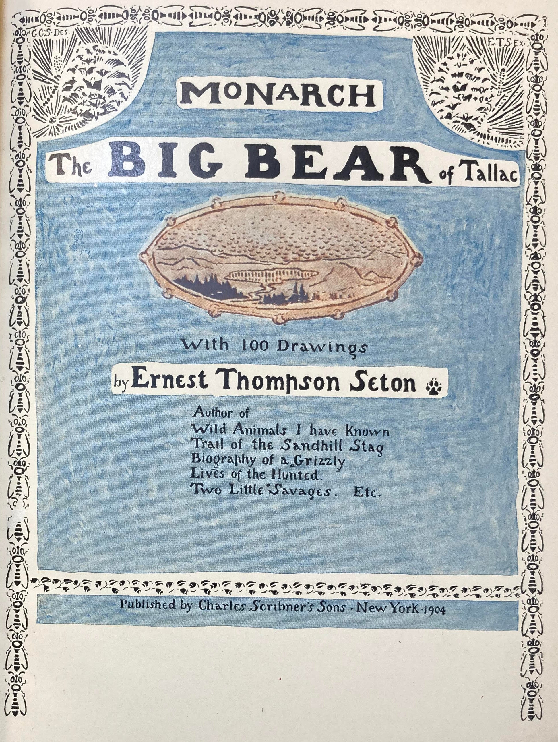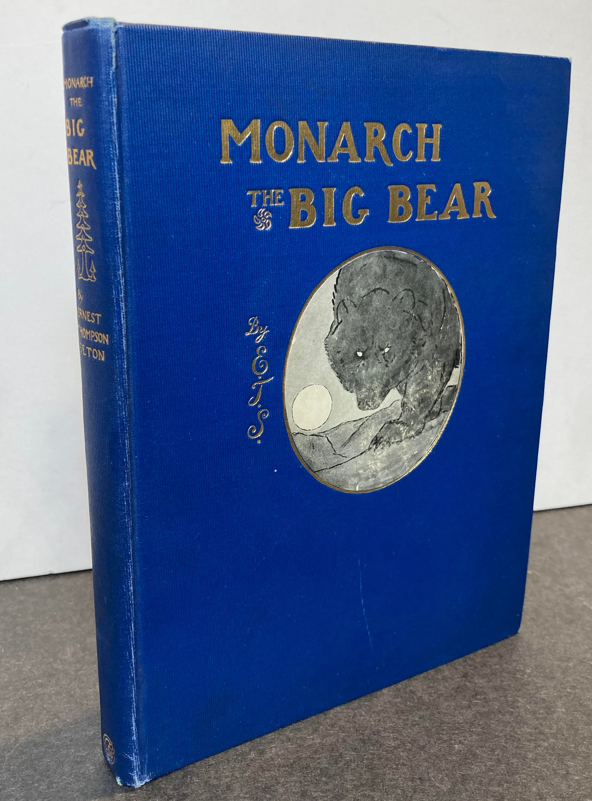 SETON, Ernest Thompson. Monarch the Big Bear of Tallac. With 100 Drawings. NY: Charles Scribner’s Sons, 1904. 8vo, [iv] 215pp. Navy cloth stamped in gilt with pictorial label affixed to front. Marbled blue endpapers; color pictorial title, 8 half-tone plates and numerous b&w illustrations. Spine ends and corners lightly rubbed, cover label a bit scratched, else a clean, tight copy.