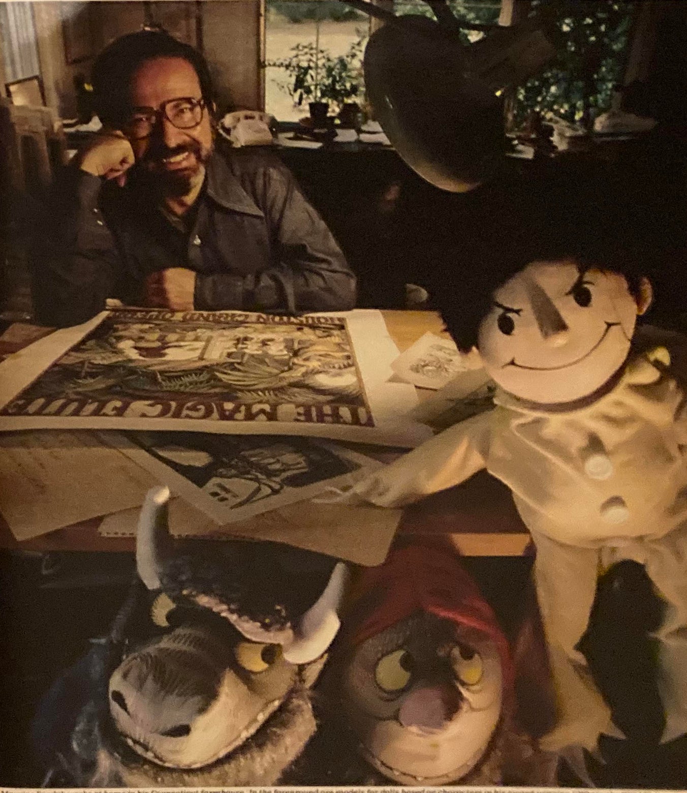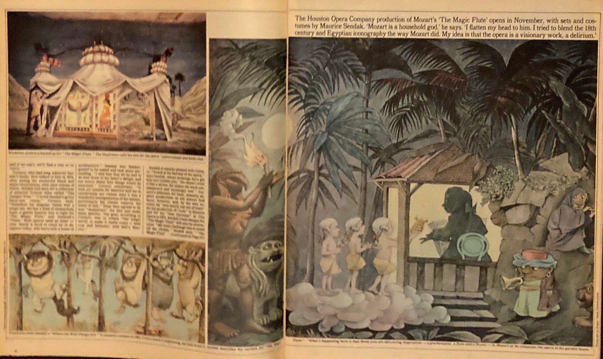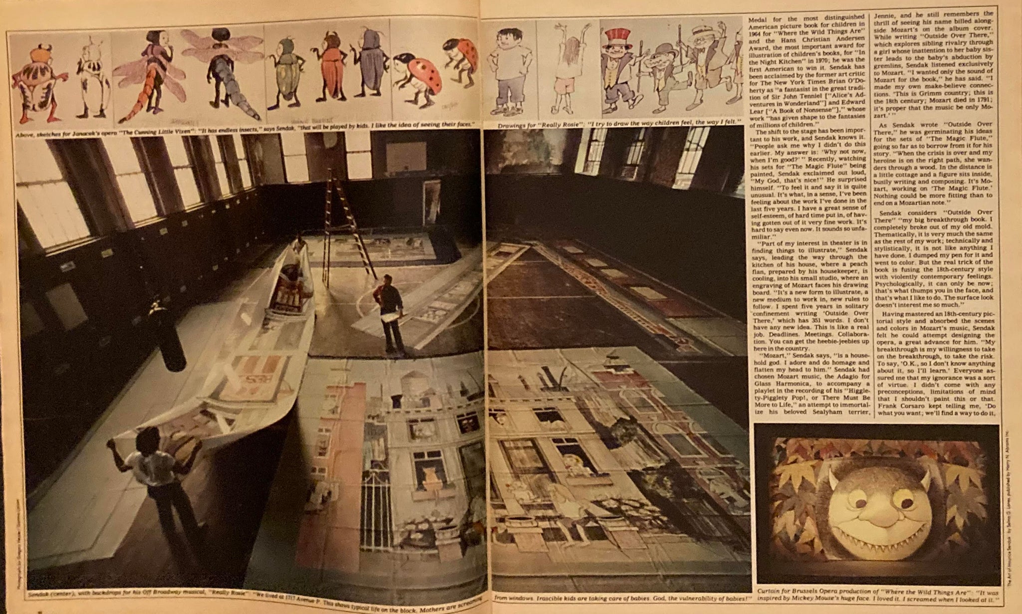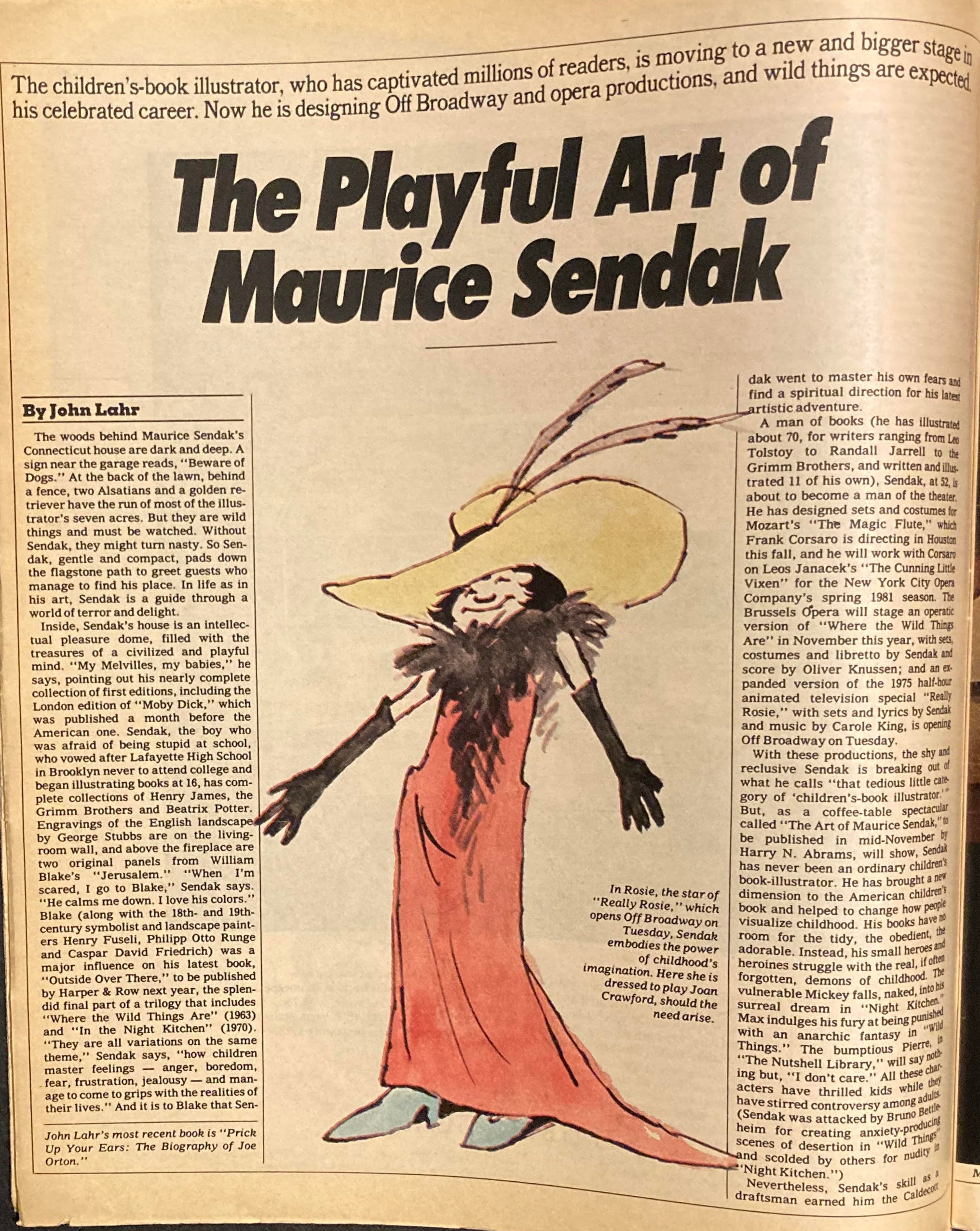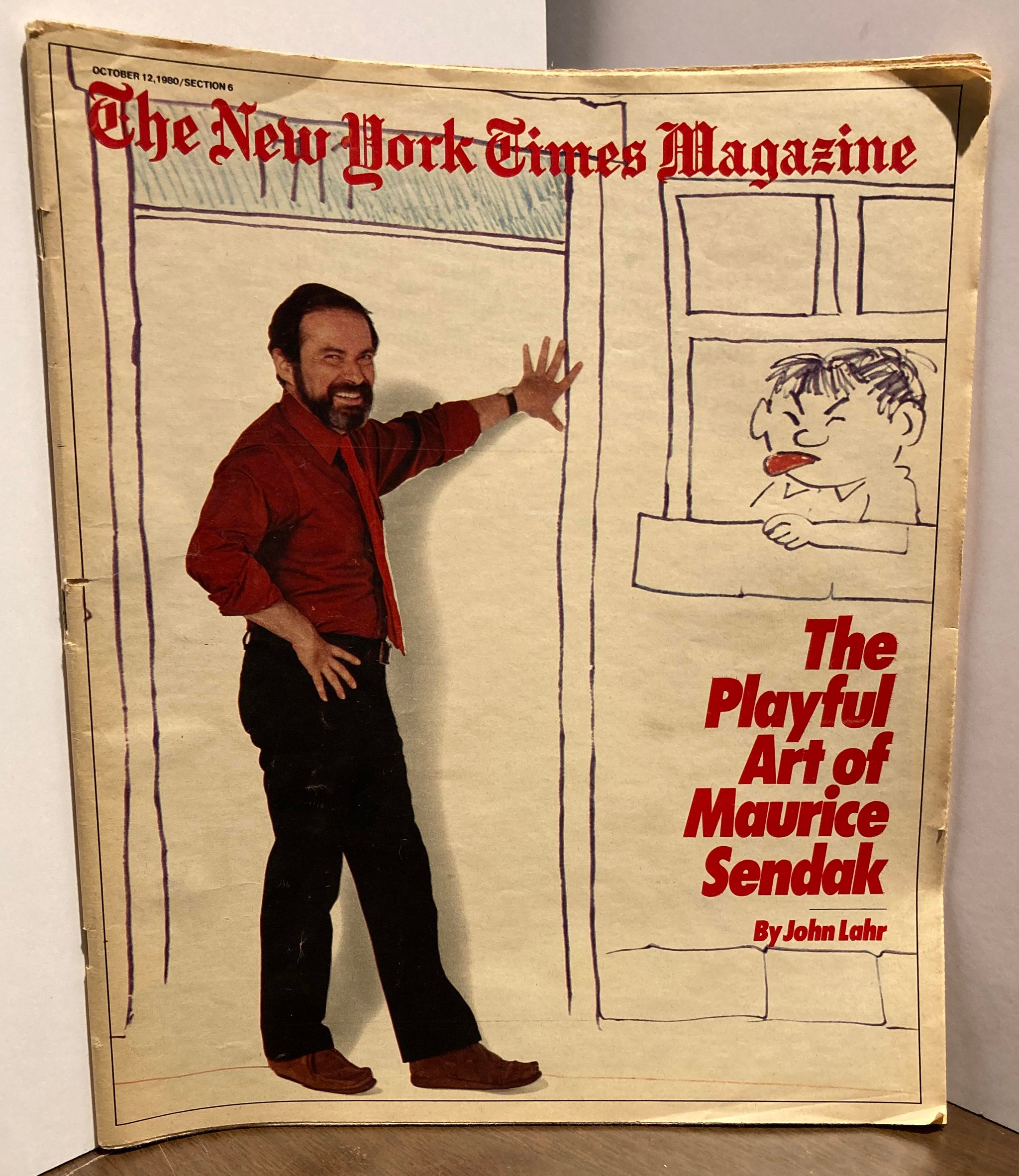 First and only edition. A copy of The New York Times Magazine from October 12th 1980, featuring a cover story titled “The Playful Art of Maurice Sendak” with a cover featuring a picture of the artist posed in front of scenery he designed. The period from fall of 1980 to the spring of 1981 was a particularly busy period in the career of this celebrated Caldecott Medalist. Four separate theater and opera productions related to his work were produced during this period, including the wildly successful Houston Grand Opera run of The Magic Flute, as well as the publication of his Caldecott Honor winning book Outside Over There in the spring of 1981, and the release of the retrospective The Art of Maurice Sendak in November of 1980. The article spans 14 pages of the magazine and touches on a variety of aspects of Sendak’s work including his transition into working on more theater related artwork as well as the critical reception to some of his previous picture books. A fascinating glimpse into the life of this giant of children’s books during one of his most productive periods of his stellar career and featuring wonderful photographs of Sendak at work, as well as images of some of the intricate theater pieces he was creating during this period.