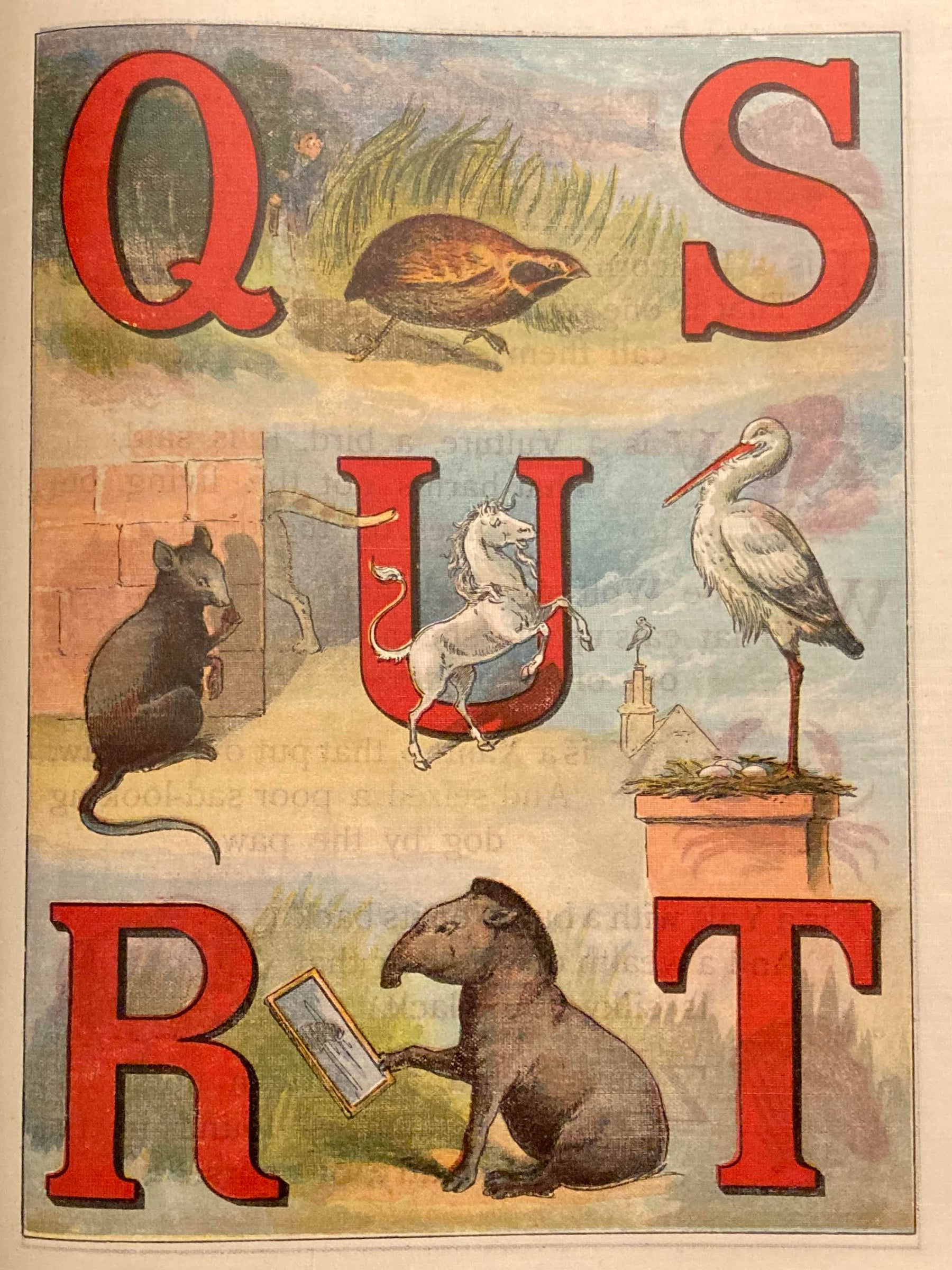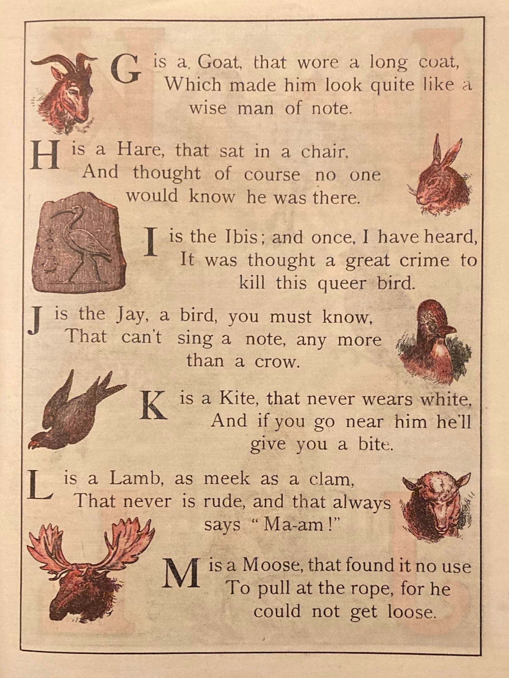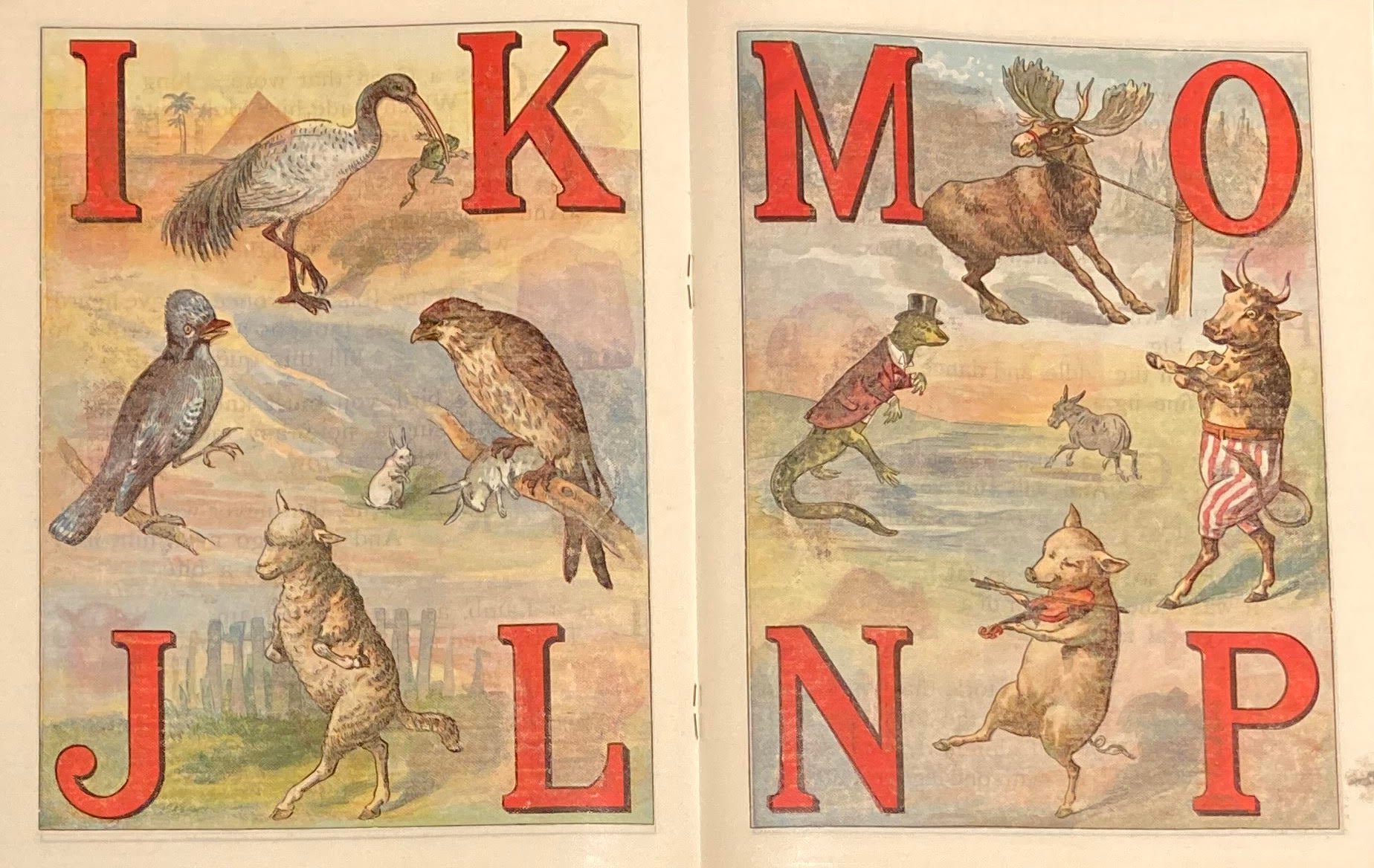 Early printing. A wonderful linen picture book from the renowned publishing firm McLoughlin Brothers, a leading publisher in children’s books from the mid-nineteenth through early twentieth century. This early alphabet book features wonderful, humorous rhyming couplets highlighting a different animal for each letter, all printed on glossy linen sheets.