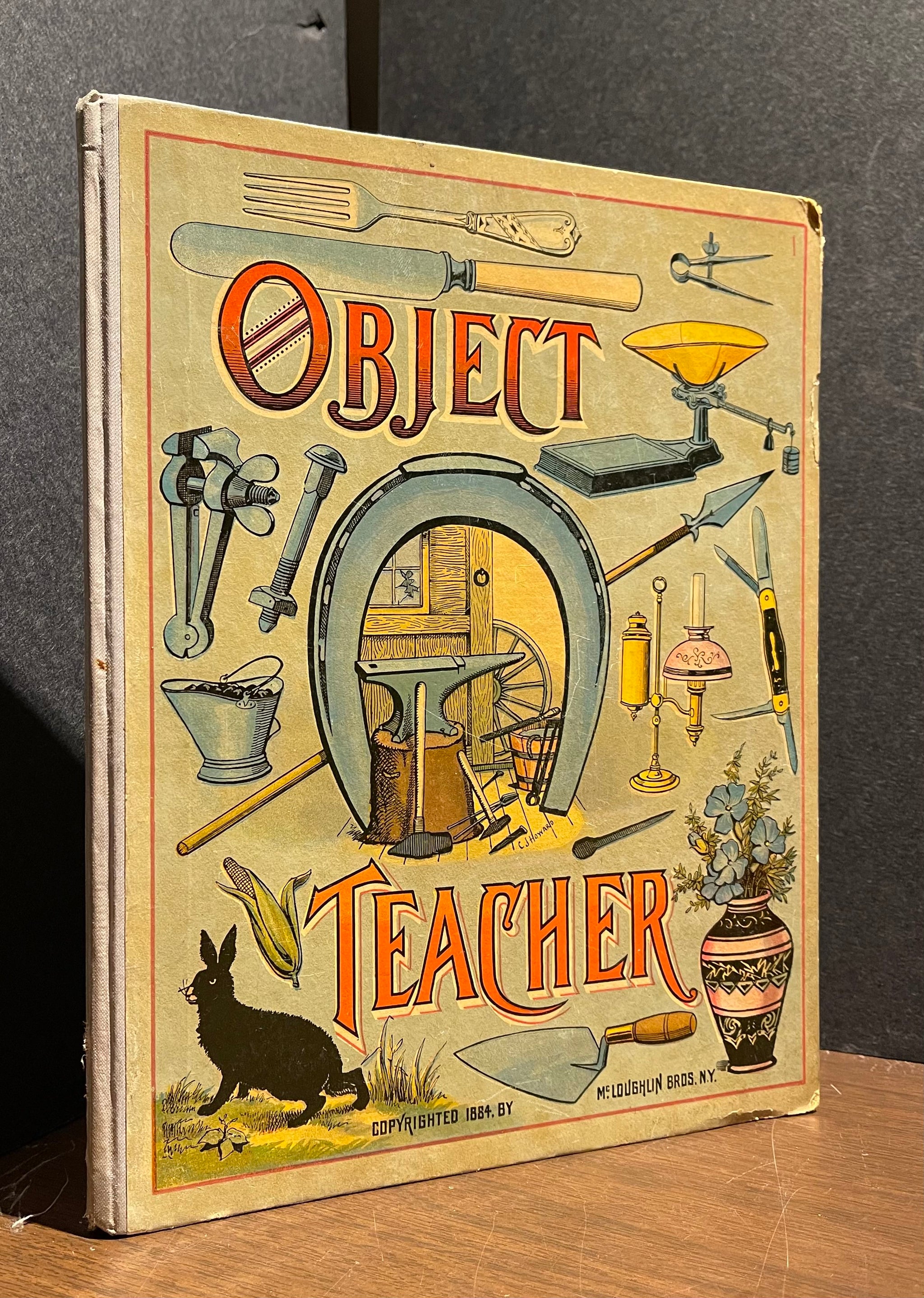 [HOWARD, C.J.] Object Teacher. NY: McLoughlin Bros. (ca. 1884). 4to, 12pp. Gray cloth spine with color pictorial boards. Color illustrations on every page. Edges worn, particularly at corners, front cover lightly soiled, rear cover more so, two small puncture holes to cloth spine, else an internally clean, bright copy.