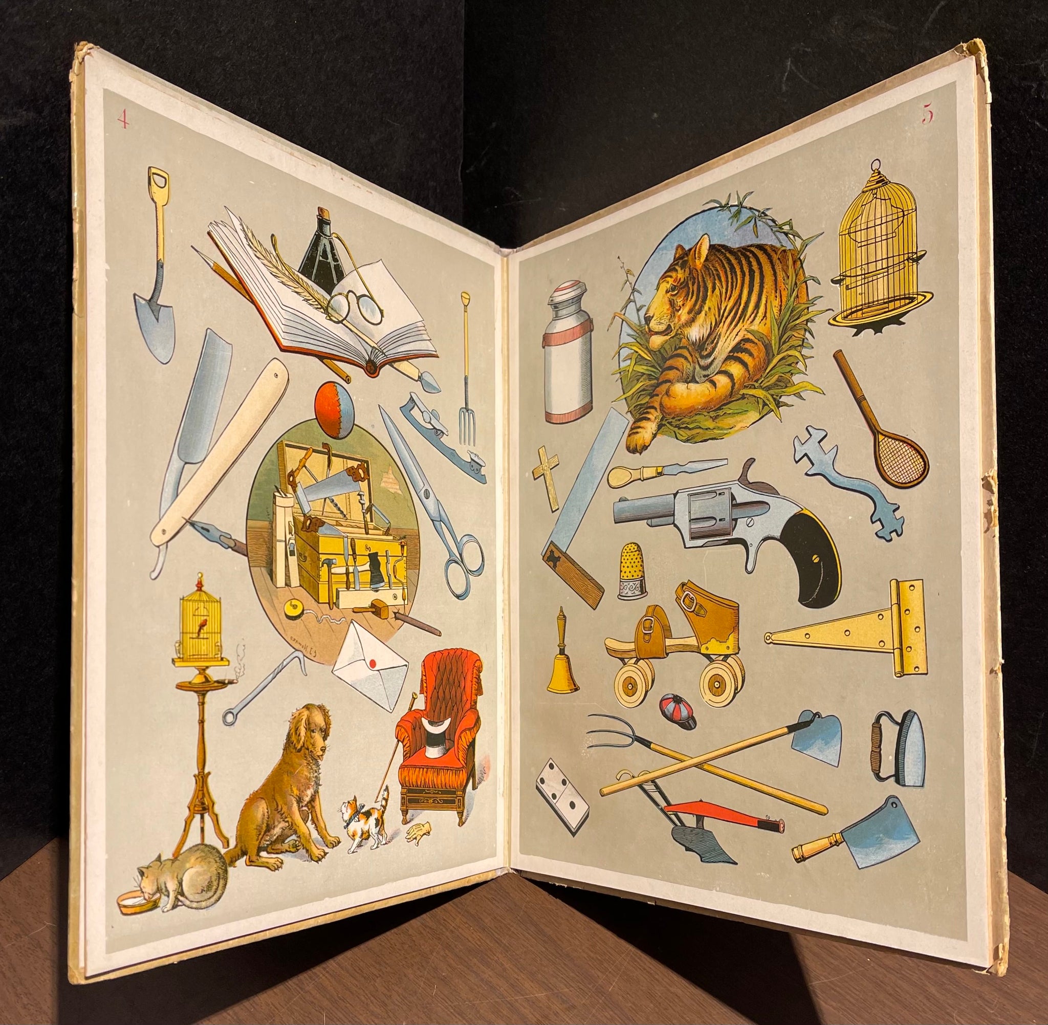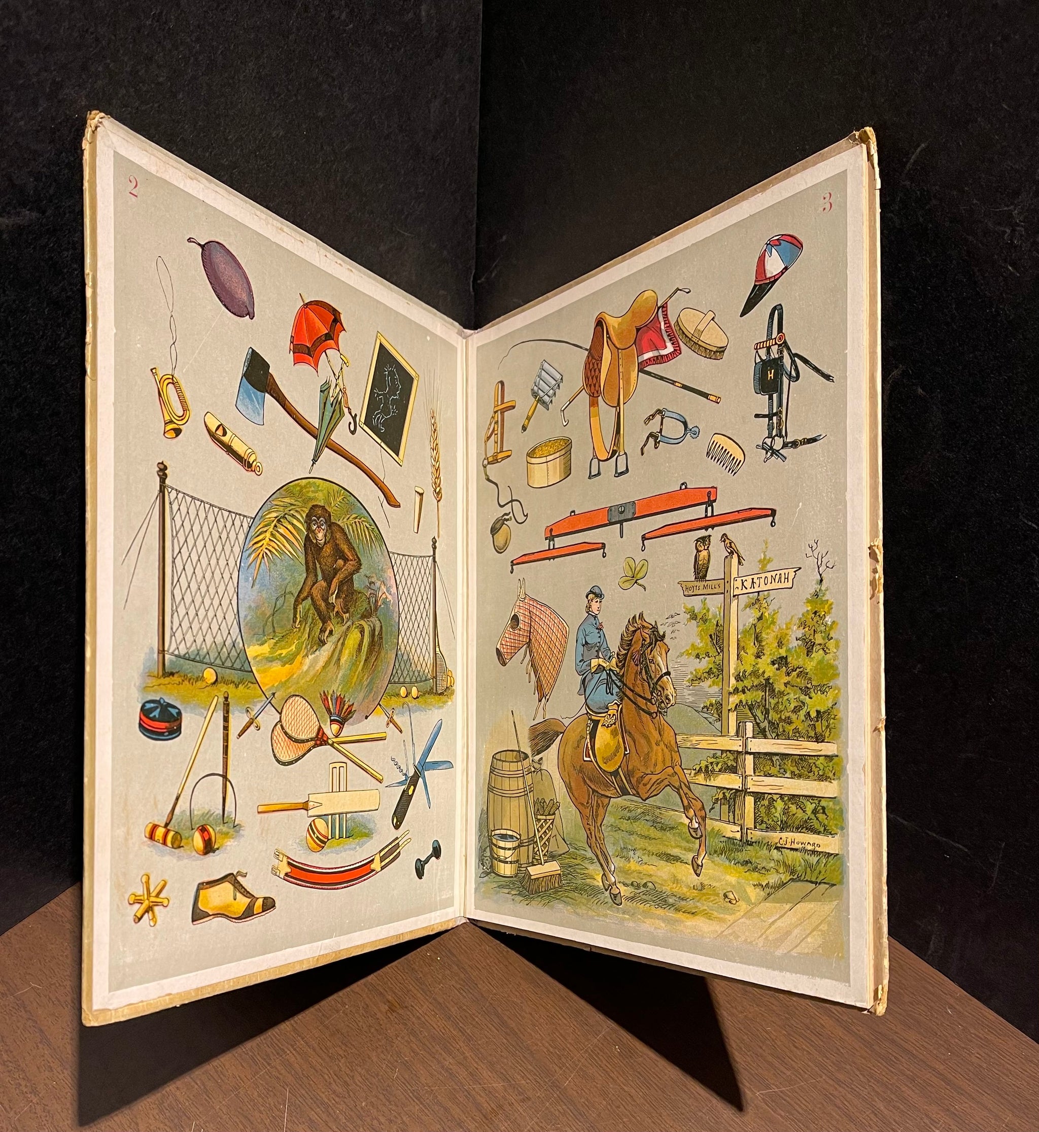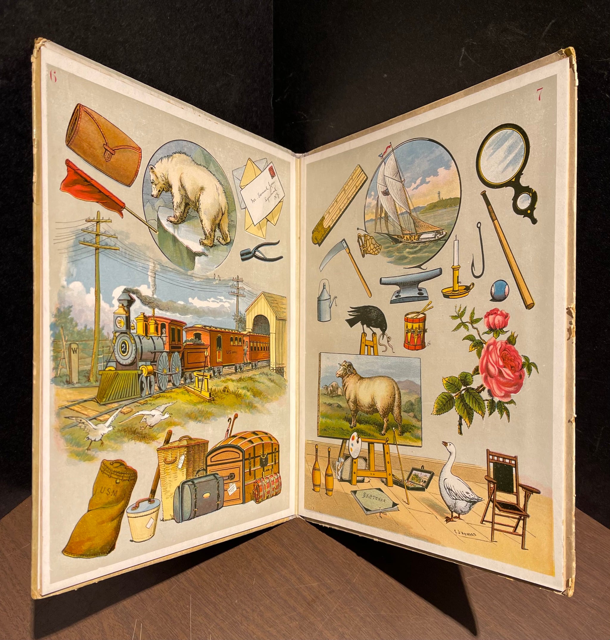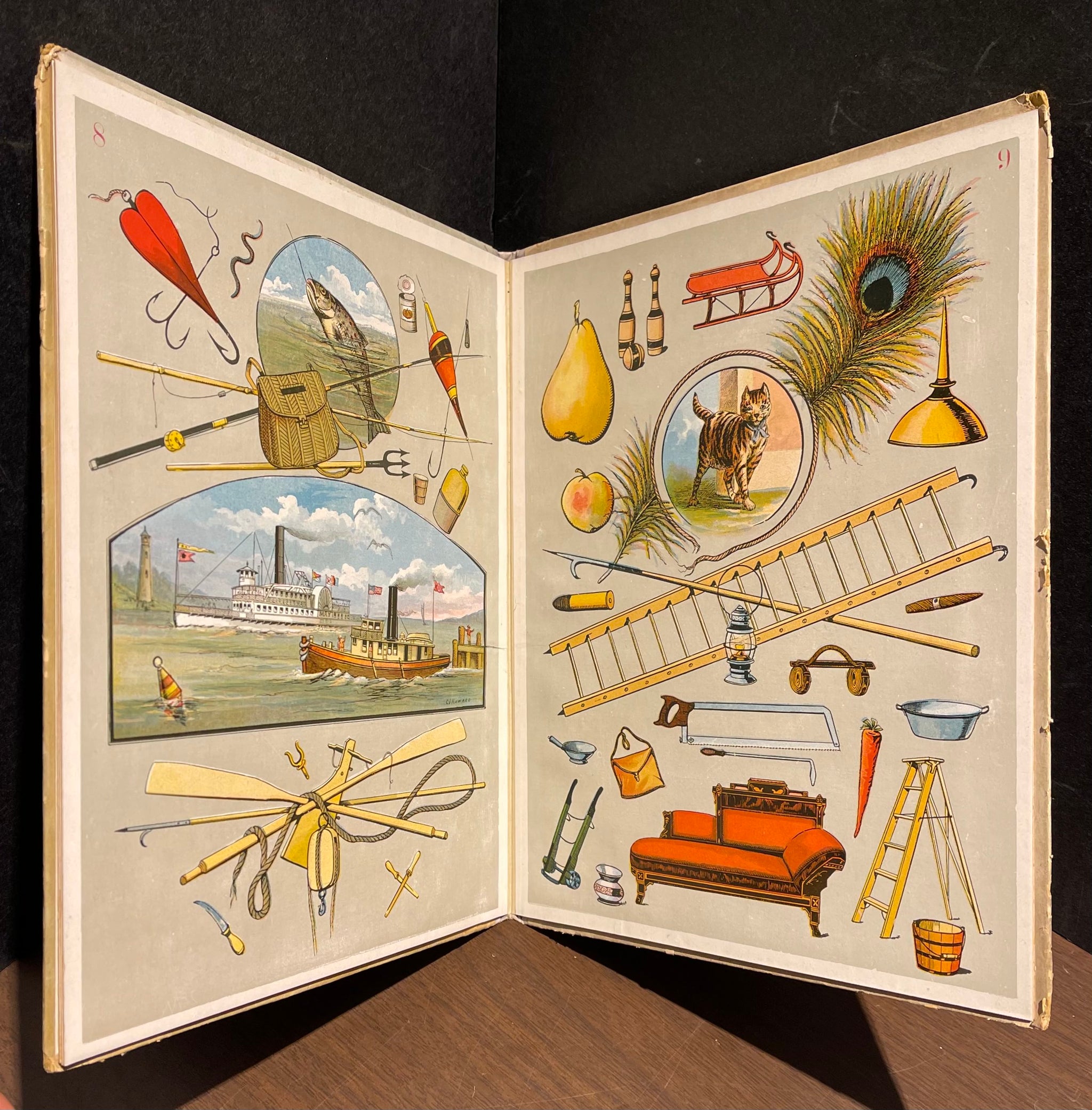 Early printing (possibly first?). An instructive, wordless book filled with pictures of every day objects for children to learn their correct names. With stunning full-color illustrations and a glossary of terms at the rear, this early example of a teaching picture book from one of the pioneering American publishing firms in the use of color printing for children’s picture books.