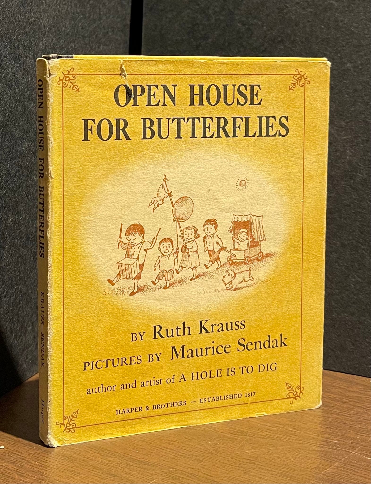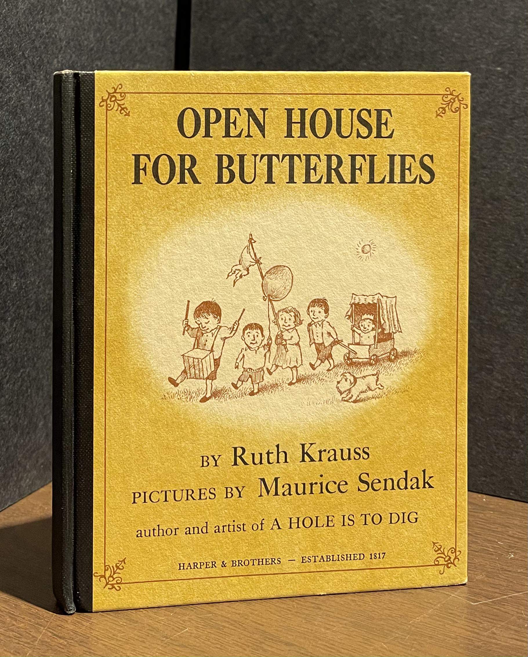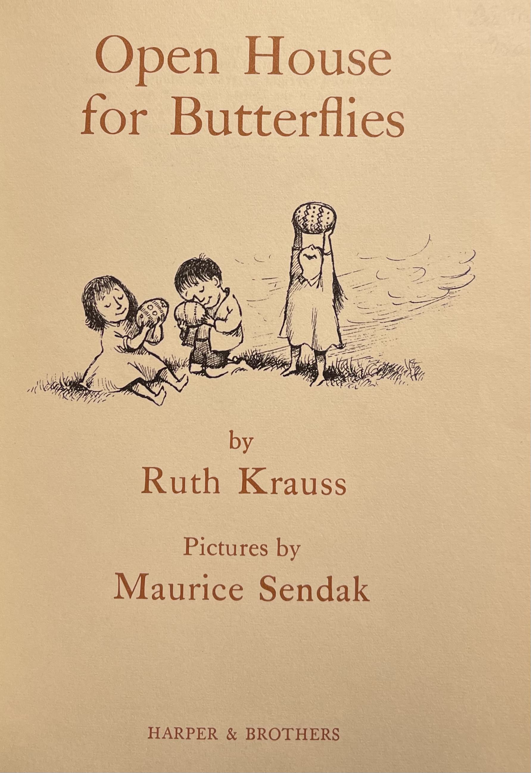 KRAUSS, Ruth. Open House for Butterflies. Pictures by Maurice Sendak. [NY]: Harper & Brothers [1960]. 12mo, [48]pp. Black cloth spine with color pictorial boards. Pictorial endpapers; b&w illustrations on every page. Light rubbing to spine ends and lower edge, else a clean, bright copy in original color pictorial dust jacket (a bit rubbed at folds and edges, ¾” closed tear at top of front panel, spine lightly sunned; price-clipped).