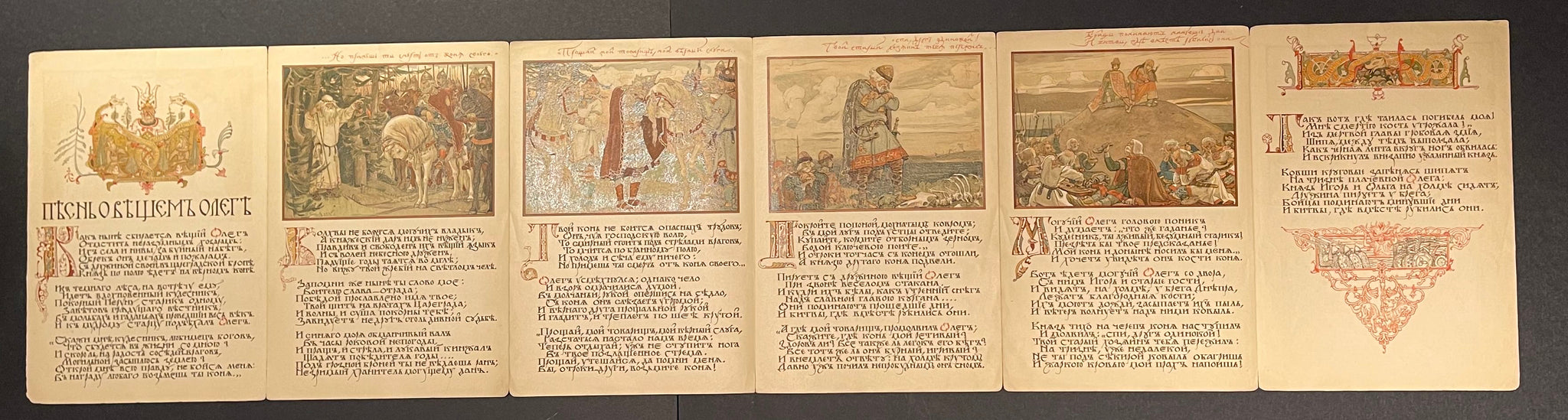 St. Petersburg: Ekspeditsii Zagotovlenya Gosudarstvennykh Bumag, 1899. 4to, 8pp. Single sheet, accordion folded into 6 leaves, [leporello style] with a printed page as front cover and another as rear cover. Four lush color chromolithographs, decorative initials, and full-color head- and tail-pieces by Vasnetsov. Corners a bit worn, edges lightly so, covers lightly soiled, else internally a sharp, bright copy. Rare.