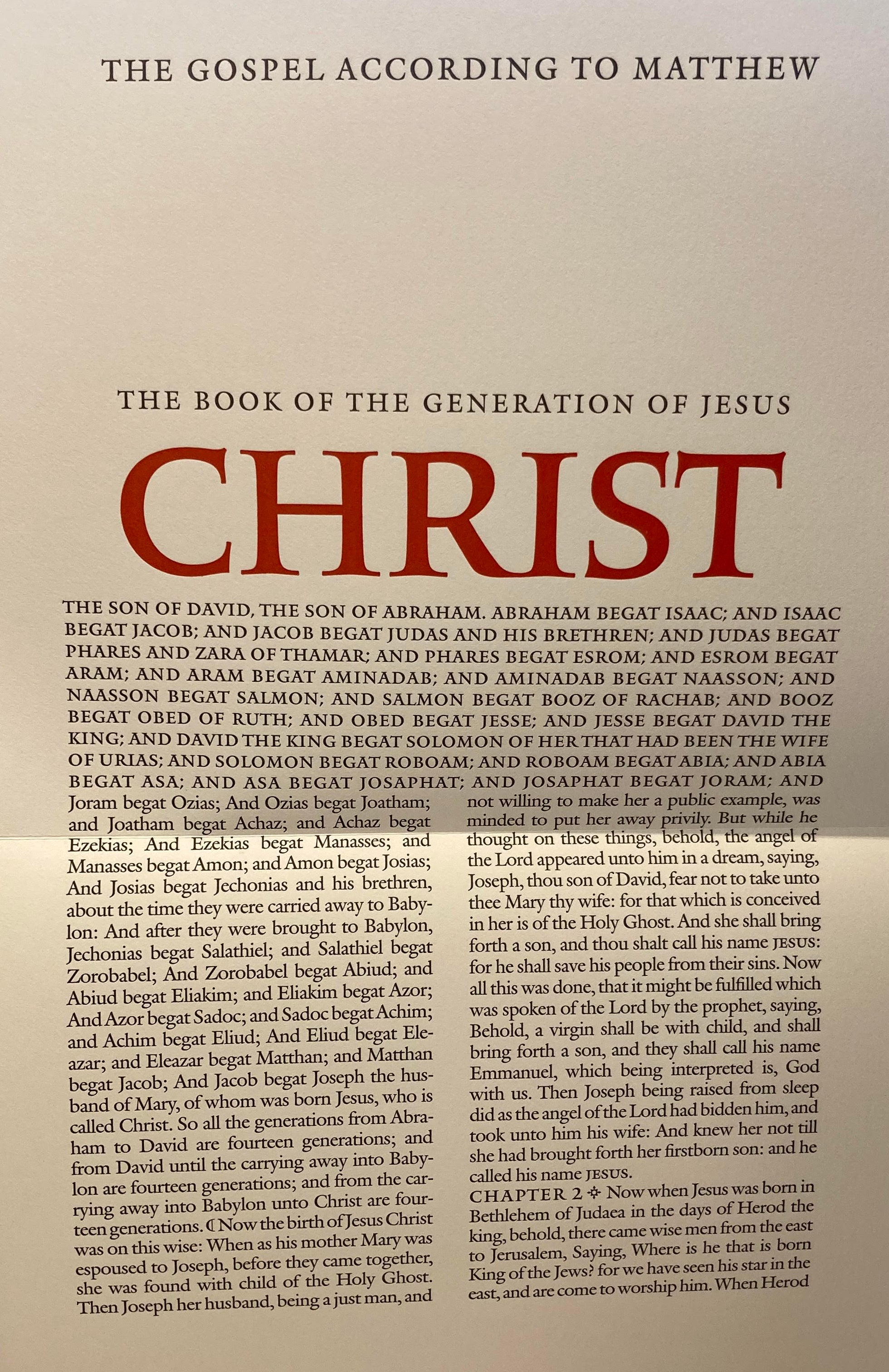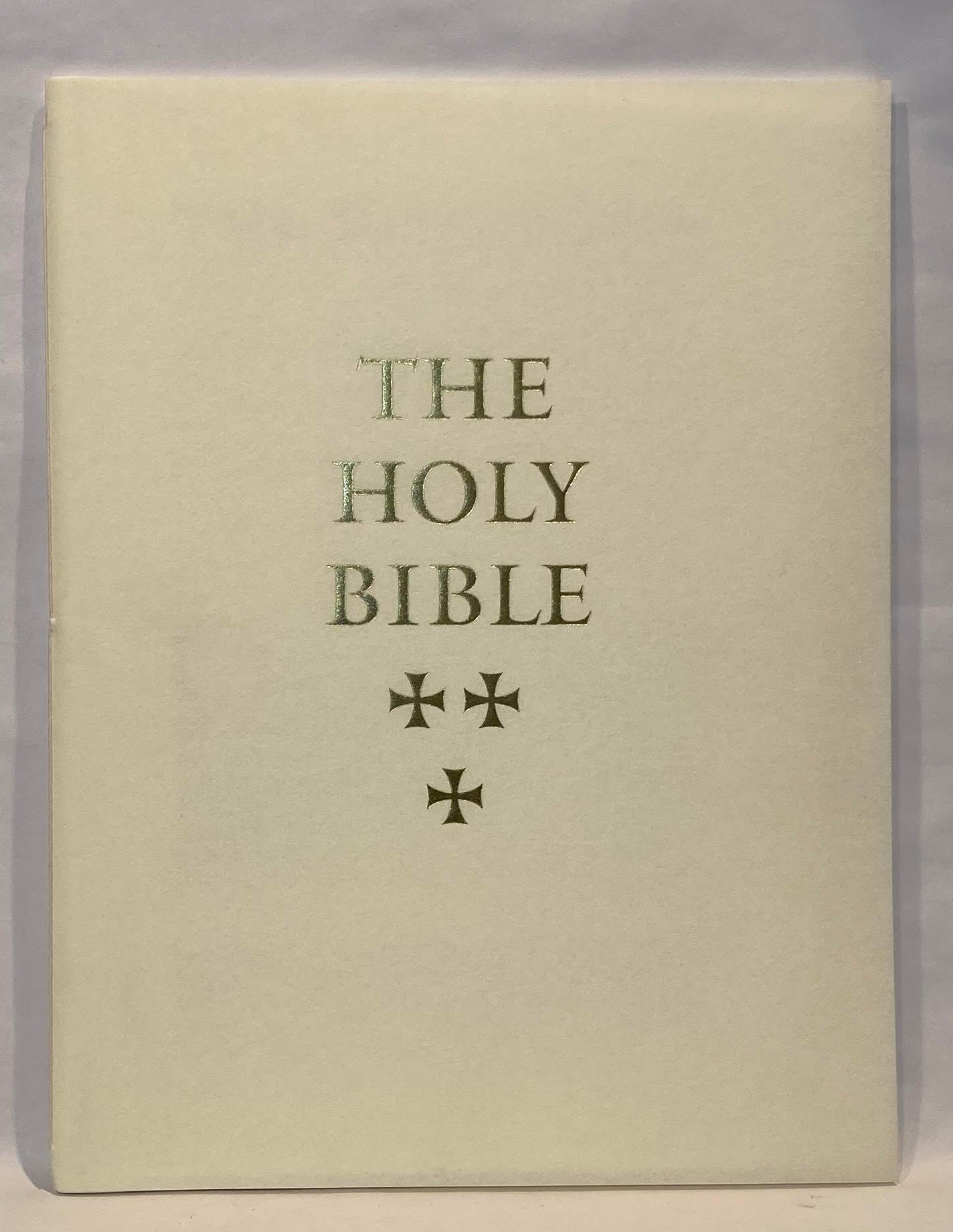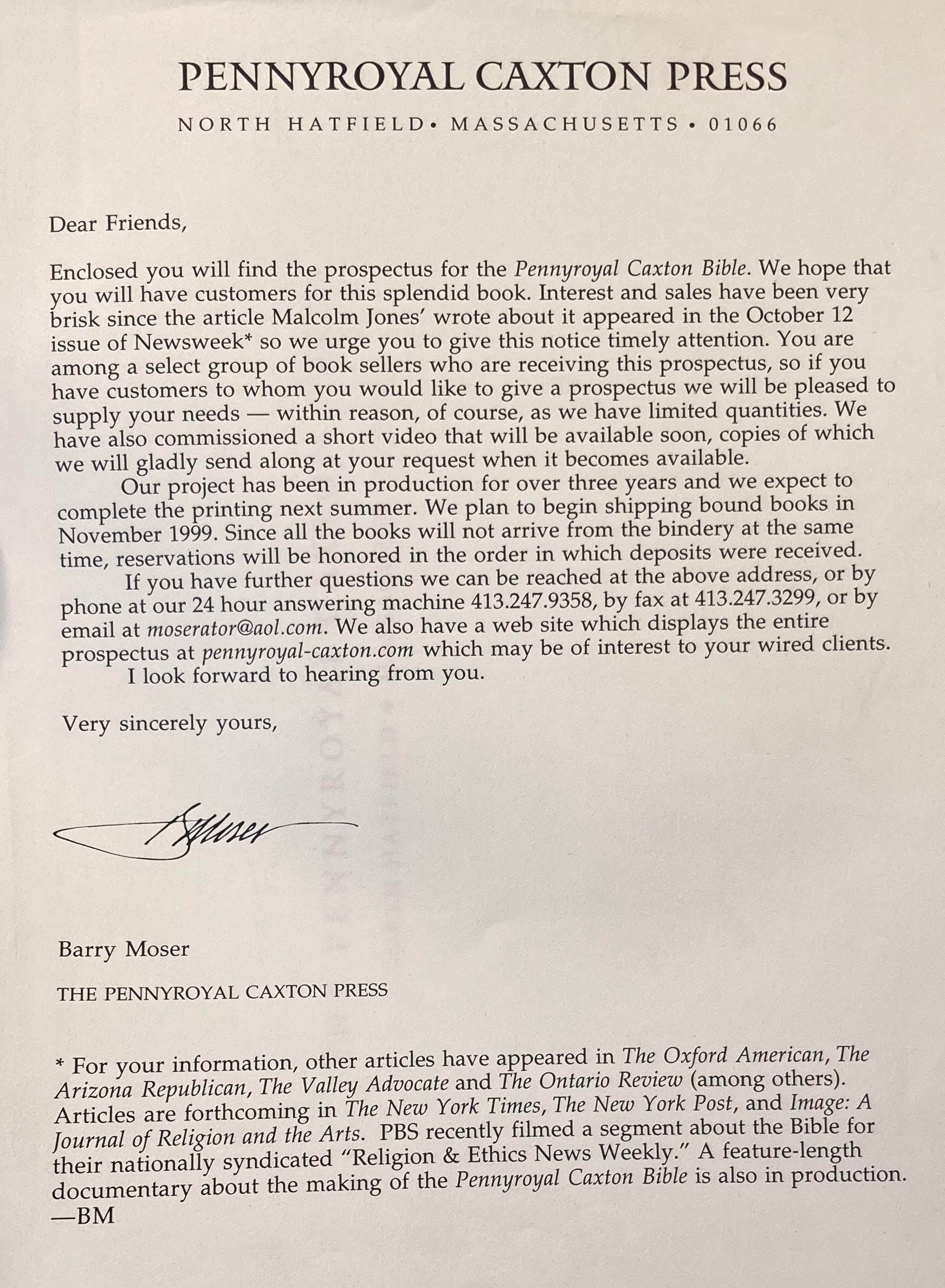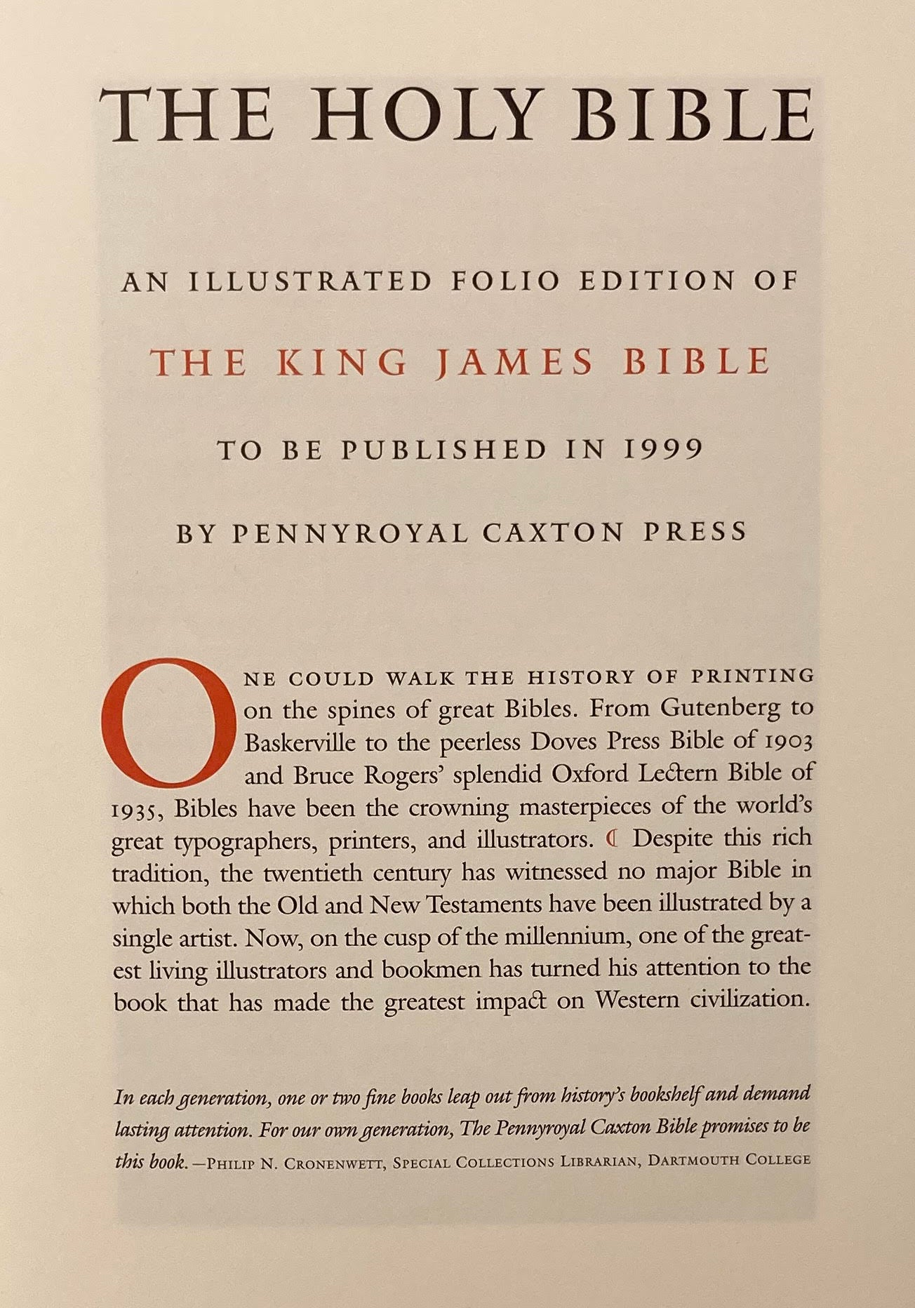 Prospectus for Barry Moser’s The Holy Bible issued to collectors prior to the release of the first edition. A 16-page prospectus detailing the production and features of the lavishly crafted bible by noted engraver and printer Barry Moser. The prospectus goes into great detail about the printing and engraving process, the design, paper, and history of the press as well as featuring 7 of the engravings that would appear in the finished book. There is also a fold-out sheet printed in letterpress on the fine linen paper described in the prospectus, featuring one of the display words created by letter cutter John Benson (most famous for his lettering on the Vietnam Veterans Memorial) for this bible. An elaborate prospectus highlighting the lavish crafting and incredible workmanship that went into the Pennyroyal Bible, which had a primary edition published at $10,000, and a deluxe edition at $30,000.