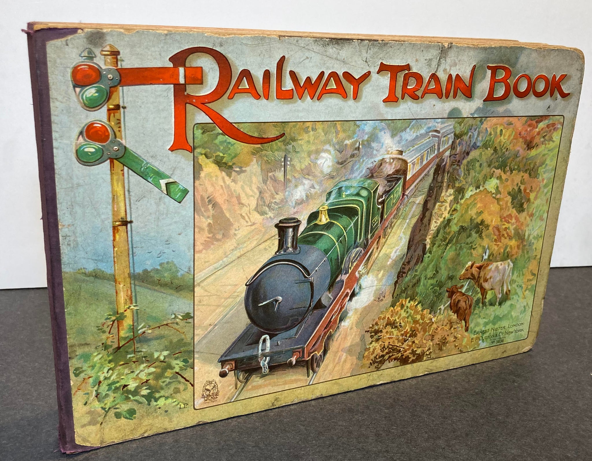 [ERNEST NISTER]. Railway Train Book. (No artist credited). London: Ernest Nister (ca. 1900). Oblong 4to, [16]pp (all printed on extra-thick cardboard stock). Maroon cloth spine with color pictorial front board and glazed rear board. Color illustrations on every page. Edges worn, cover scratched and soiled, portion at top center of front board appears to have been reaffixed, internal pages aged – particularly at edges, with some light traces of hand-soiling in the margins. Nonetheless, an attractive copy of this extremely scarce, somewhat fragile book.