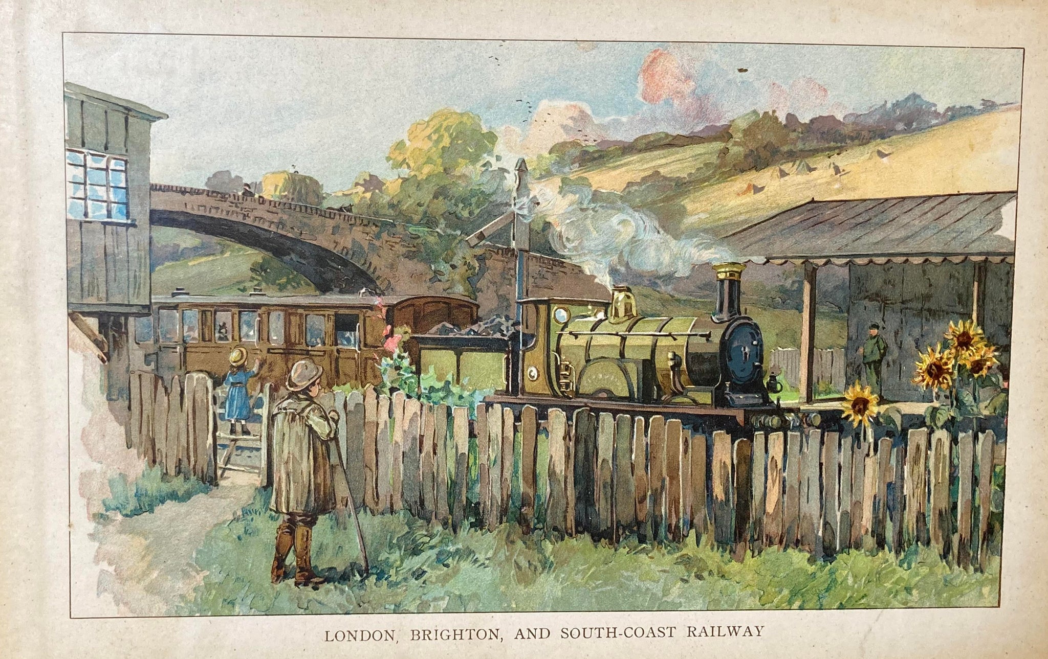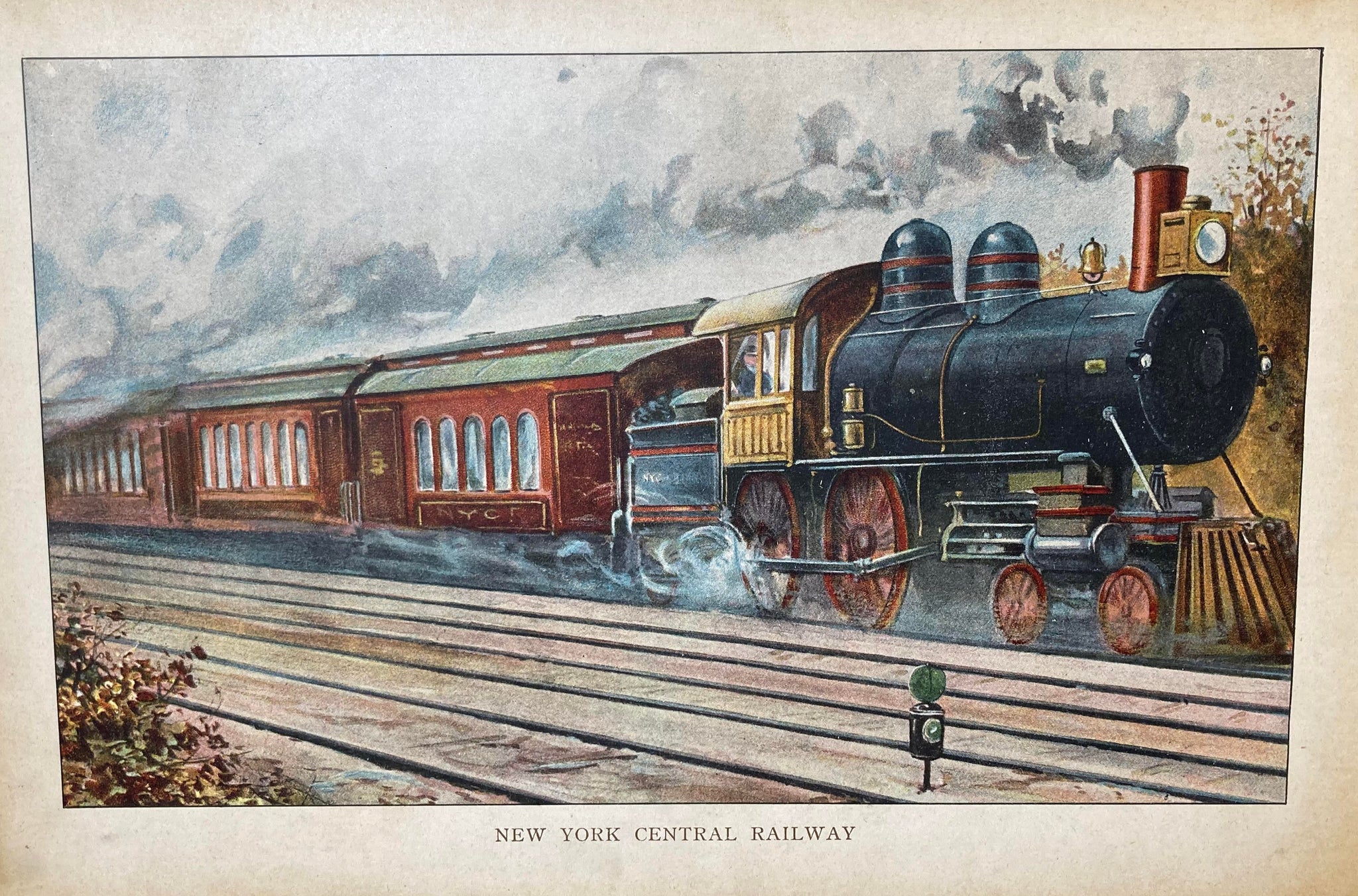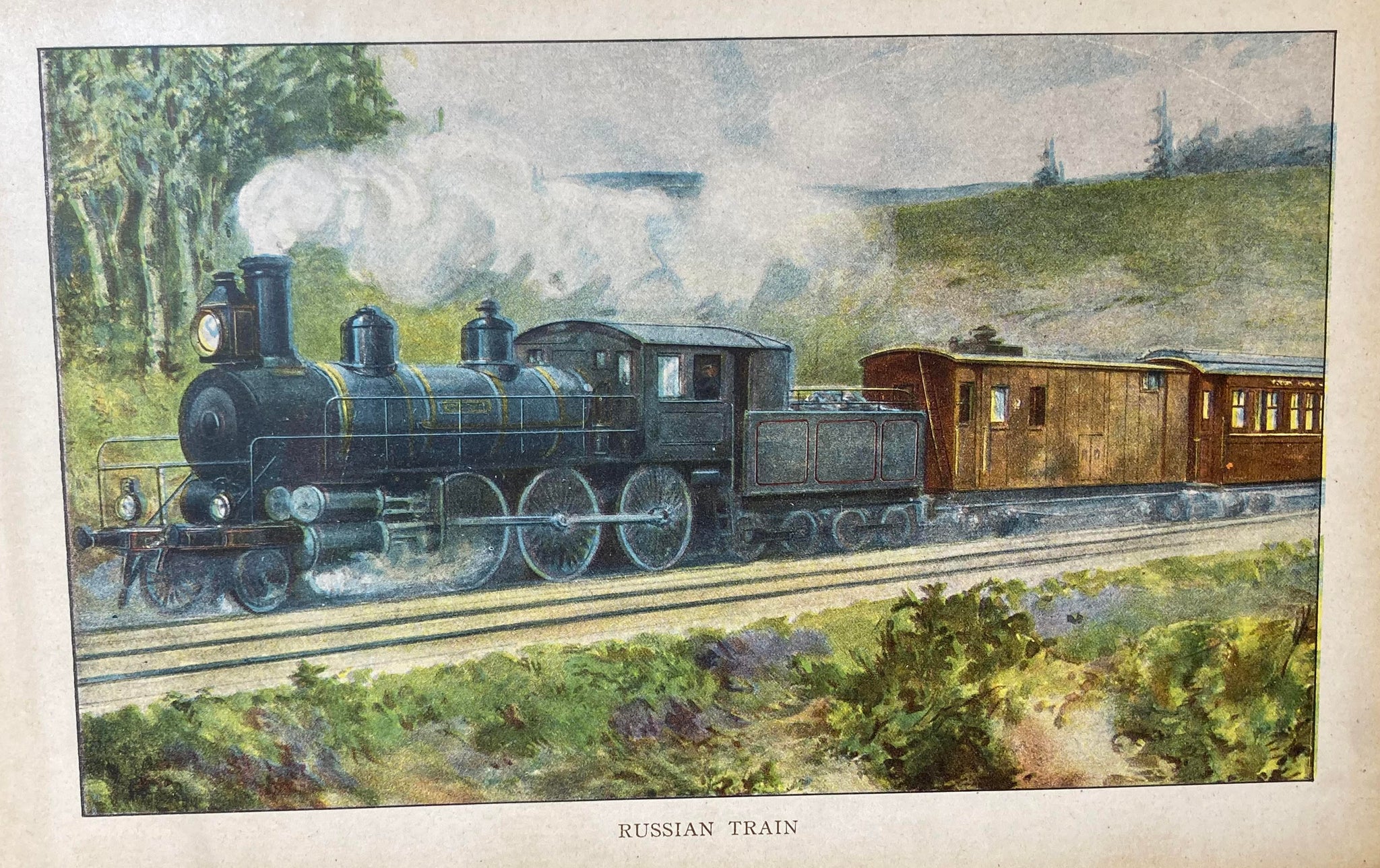 Turn of the century train book. Featuring wonderful full-color illustrations on every page of trains from around the world, this delightful picture book (printed on thick cardboard) is a lovely addition to any collection of books about railroads. With trains from France, Britain, South Africa, Canada, and all across the United States, these charming illustrations capture the history of trains at the turn of the 20th century.