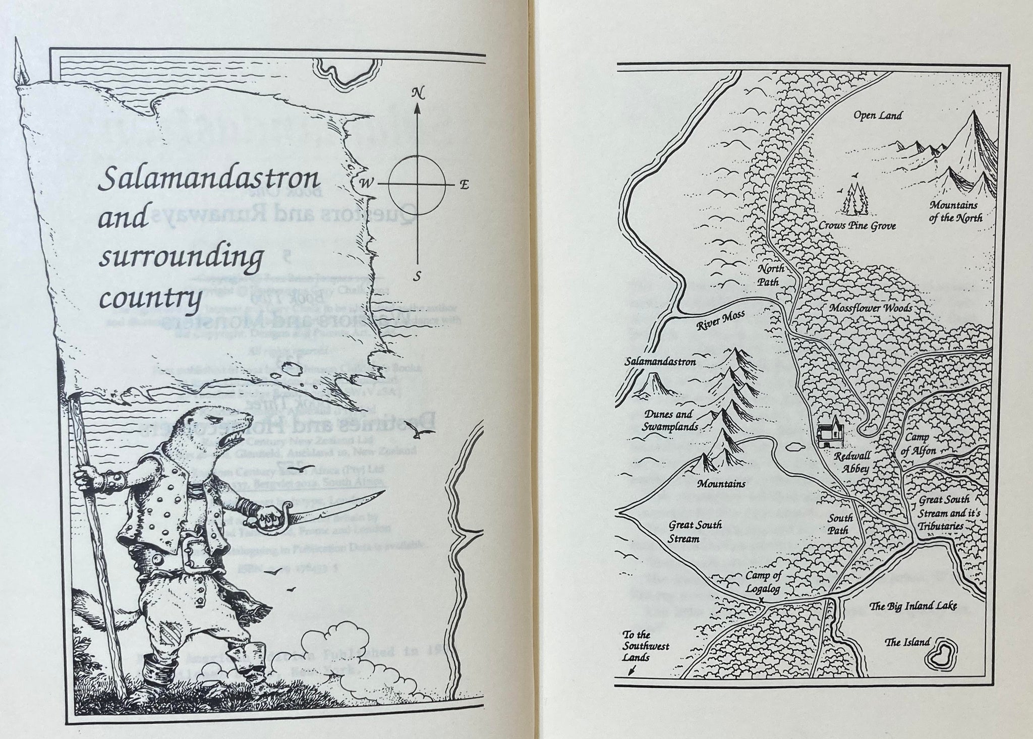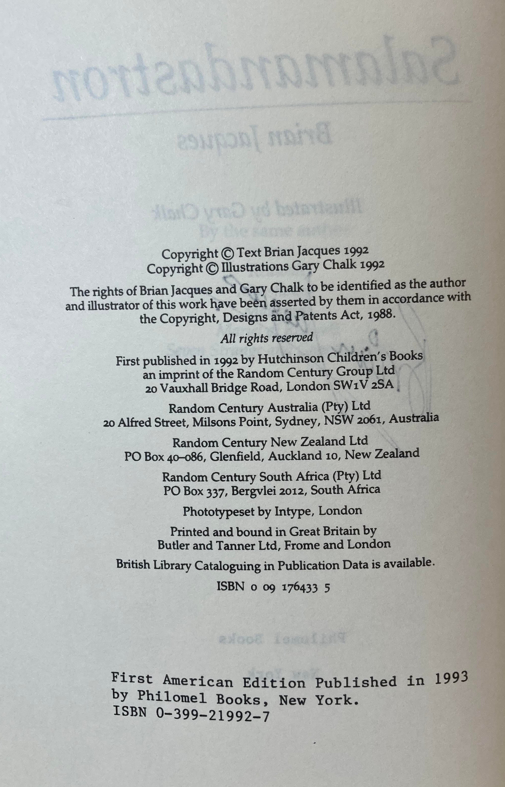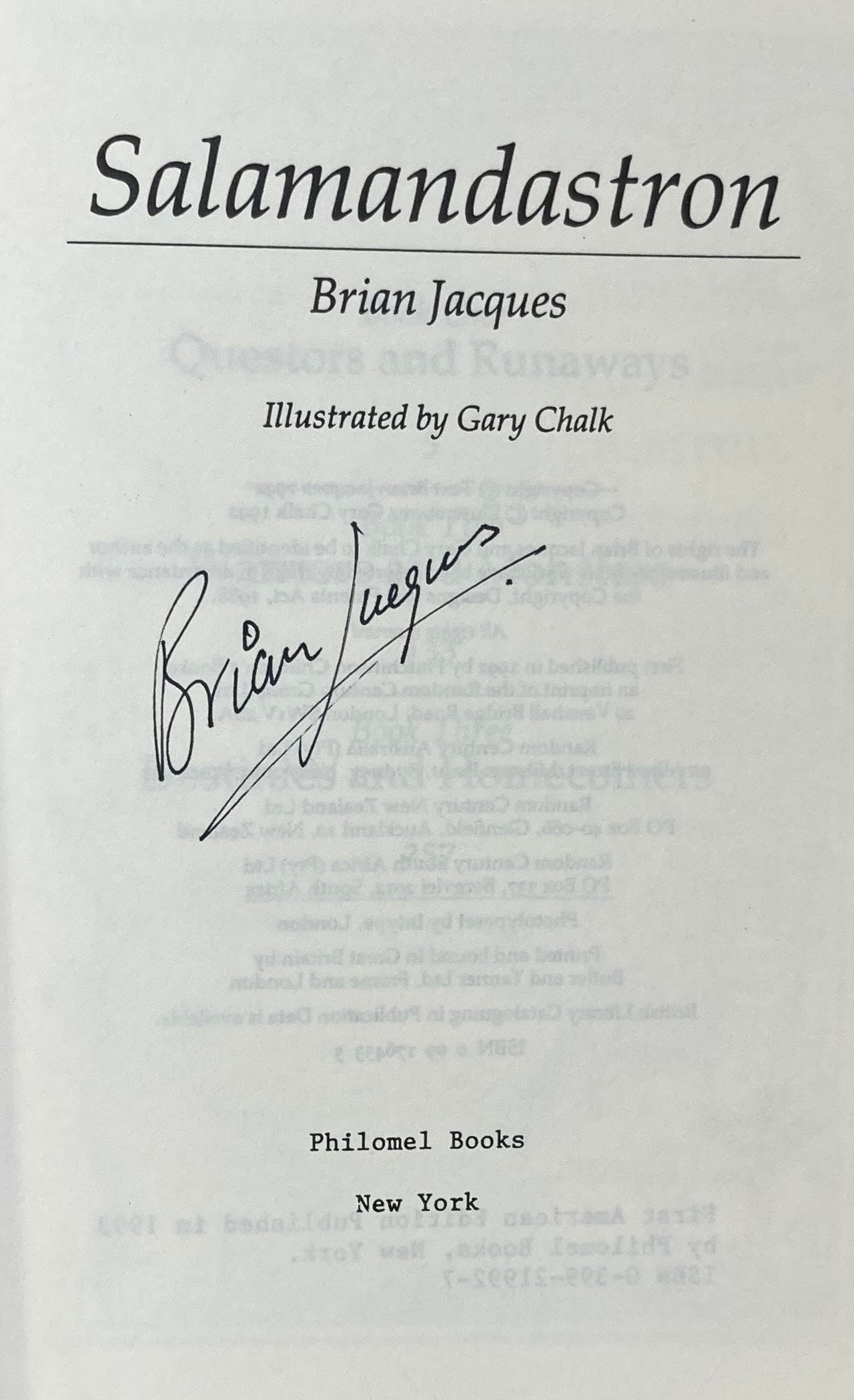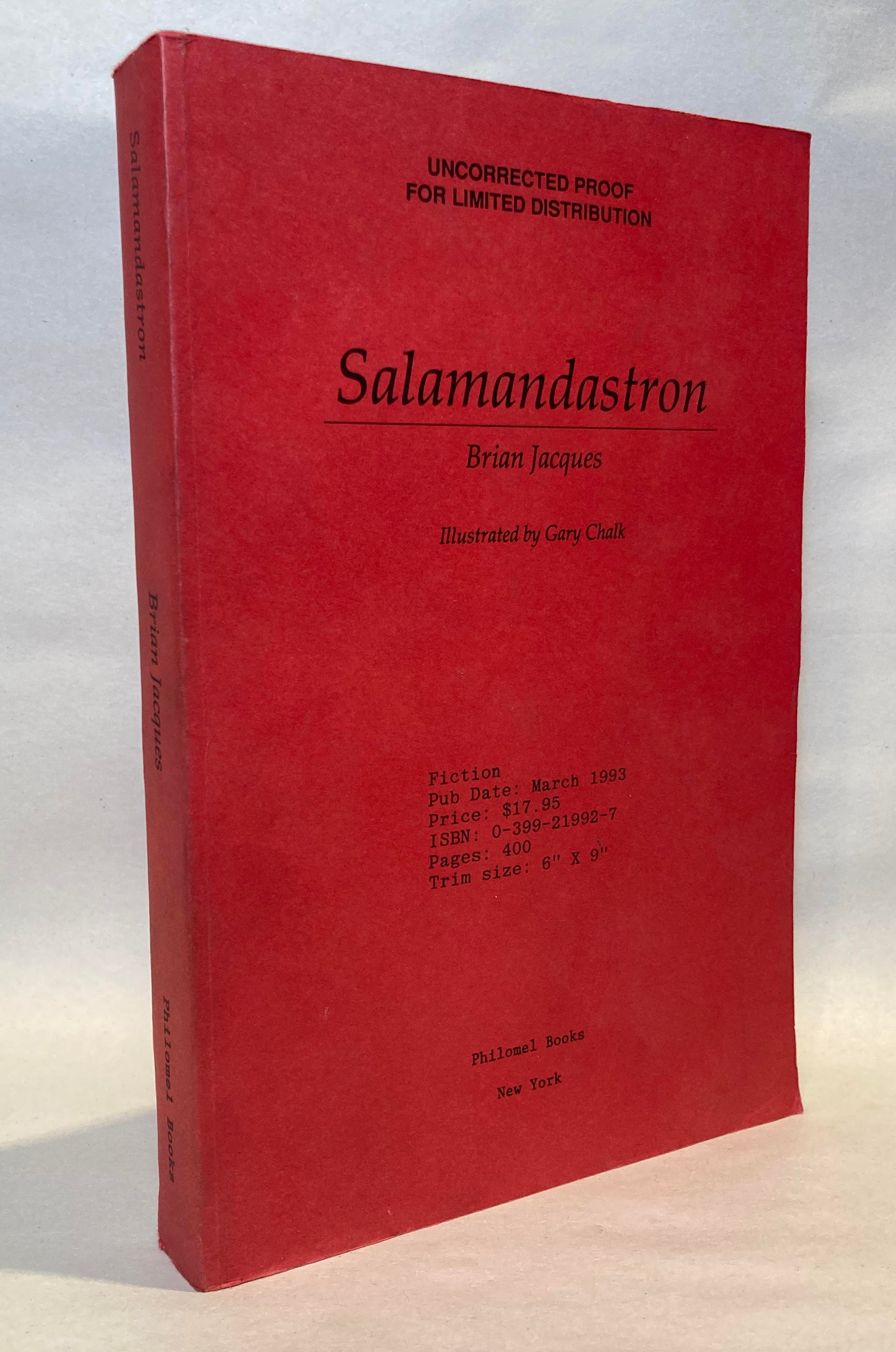 JACQUES, Brian. Salamandastron. Illustrated by Gary Clark. NY: Philomel [1992]. 8vo, [x] 391pp. Red paper wrappers printed in black. Double-page map, small b&w illustrations at the start of each section and head of each chapter. Spine ends lightly rubbed, else a fine copy. Signed by the author, Brian Jacques.