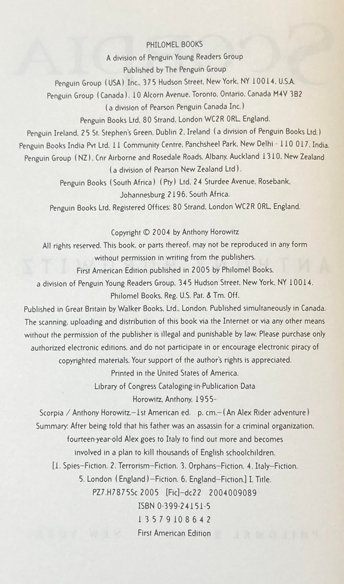 First edition. The fifth book in Anthony Horowitz’s NY Times bestselling Alex Rider series, now a streaming series. Alex Rider, teen spy, has always been told he is the spitting image of the father he never knew. But when Alex learns that his father may have been an assassin for the most lethal and powerful terrorist organization in the world, Scorpia, his world shatters. Now Scorpia wants Alex on their side. Can Alex find the strength to fight them?