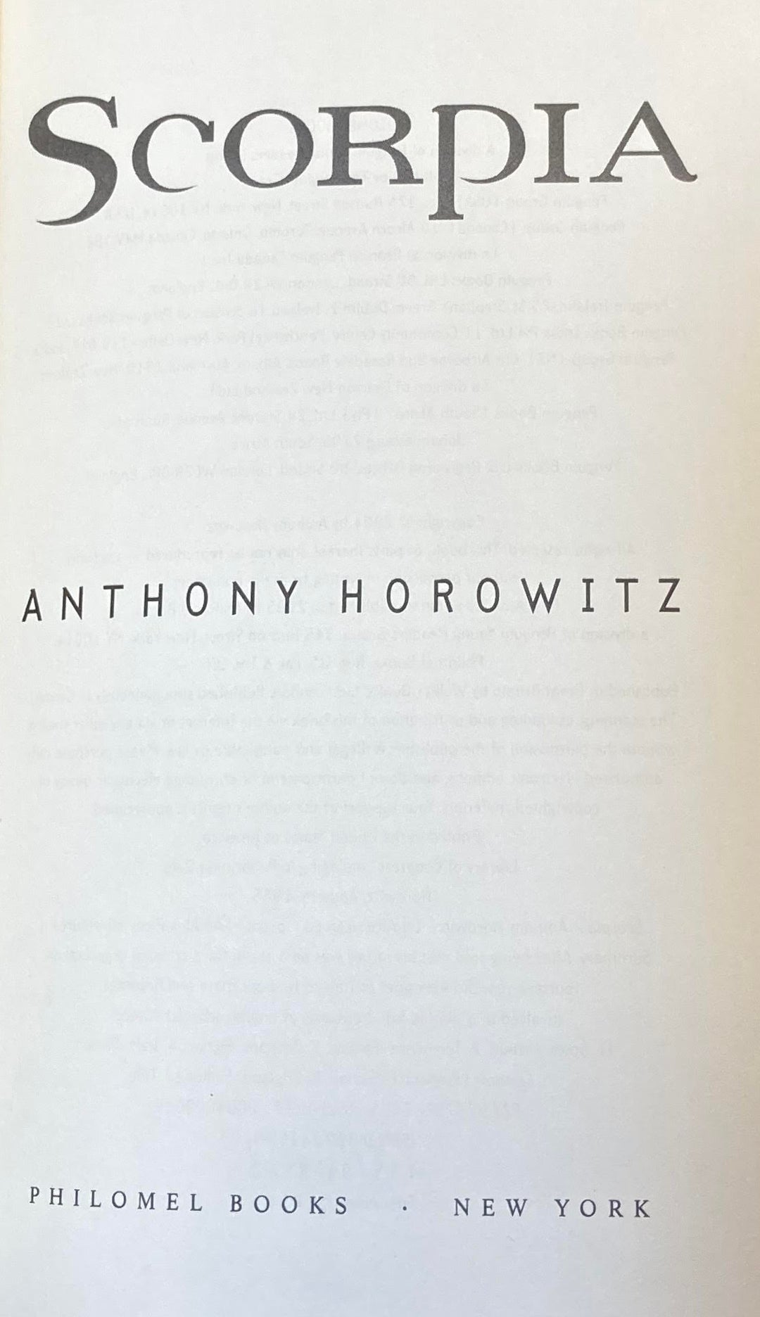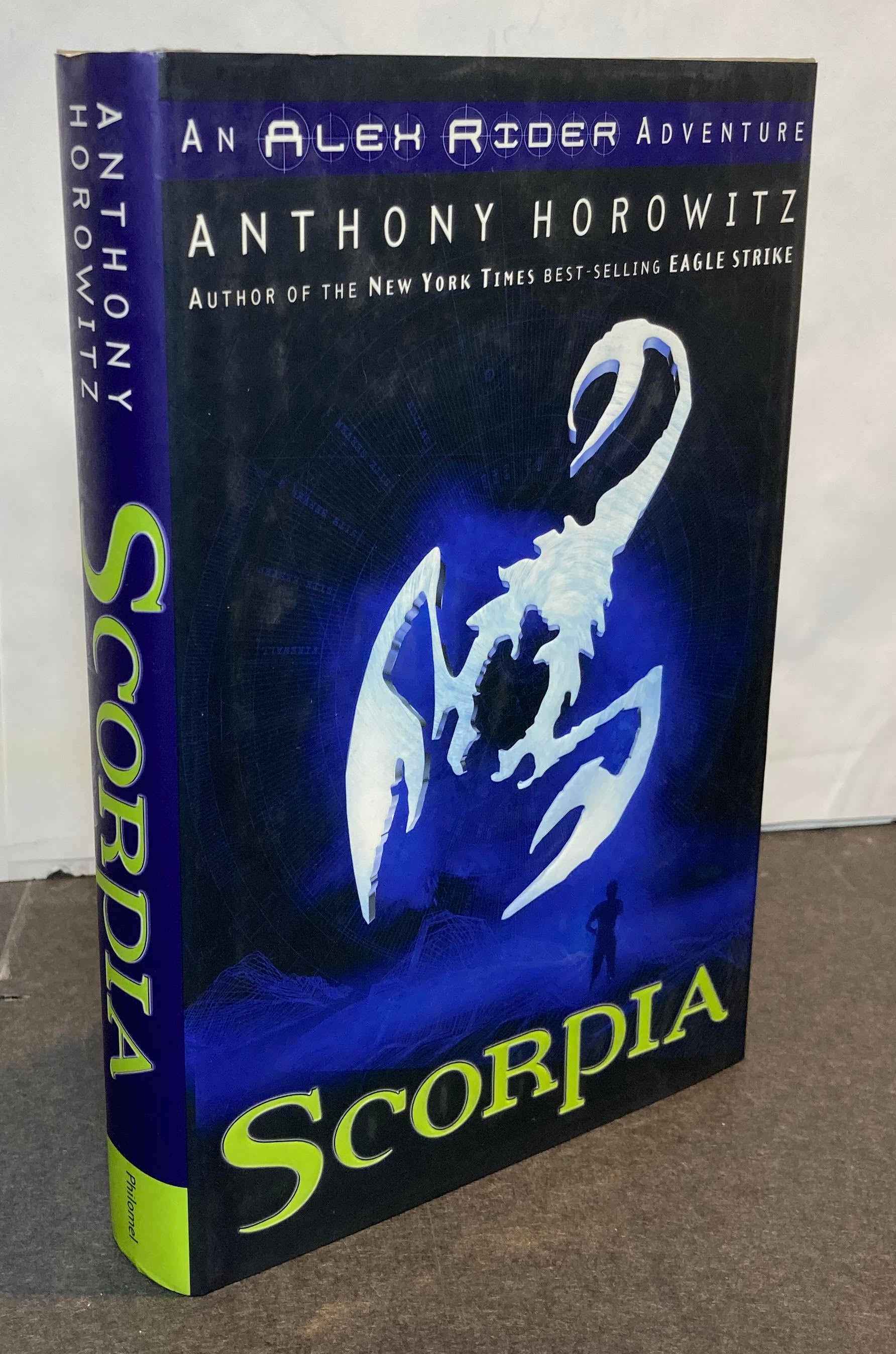 HOROWITZ, Anthony. Scorpia. NY: Philomel [2004]. 8vo, [viii] 312pp. Black boards with spine stamped in green. A fine copy in a fine dust jacket. With publisher’s promotional Scorpia sticker laid-in.