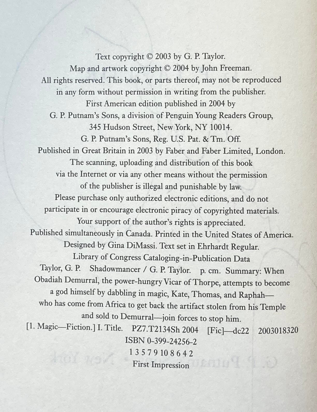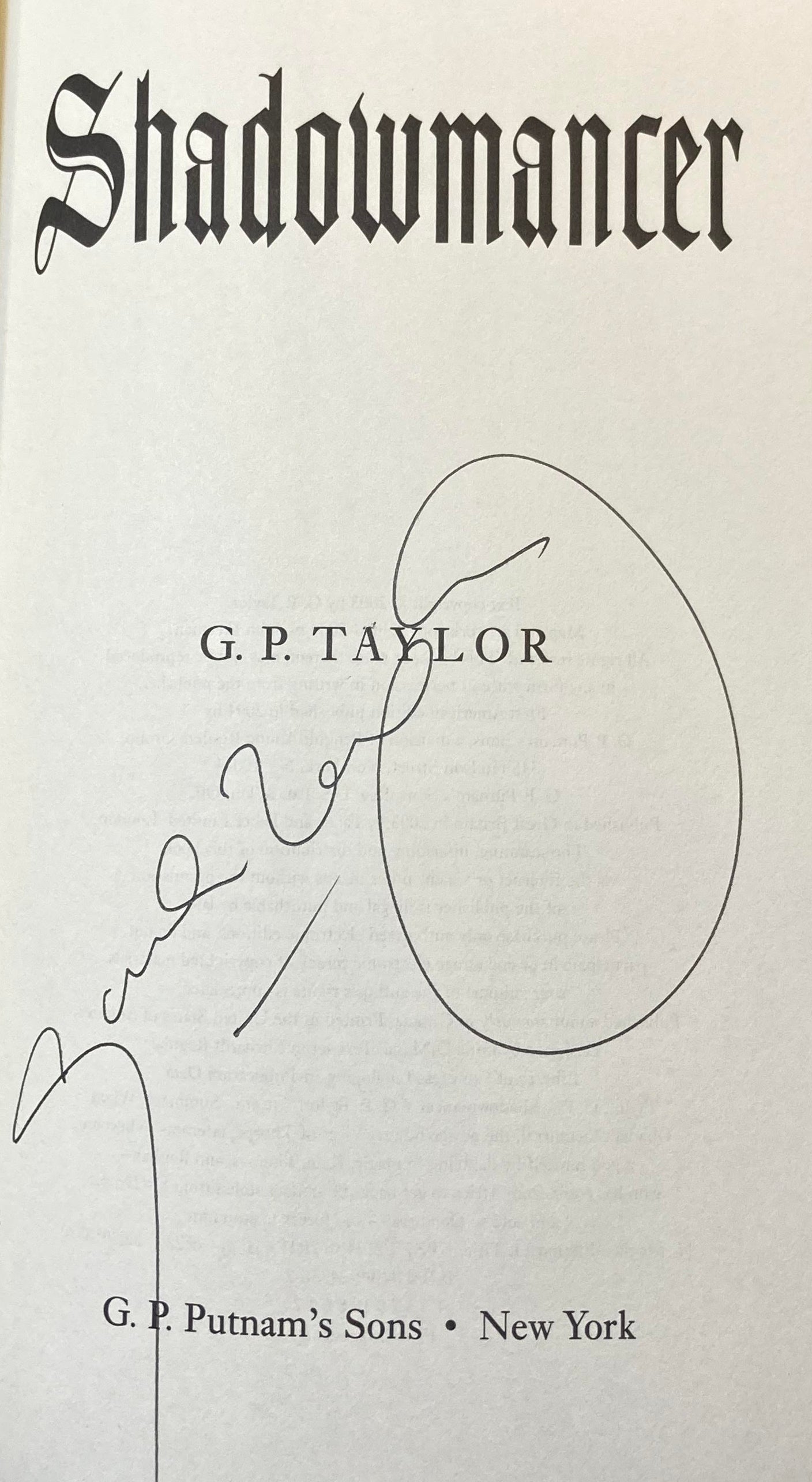 TAYLOR, G[raham] P[eter]. Shadowmancer. NY: G.P. Putnam’s Sons [2004]. 8vo, x 275pp. Black boards with spine stamped in gold. 1 full-page b&w illustration and 1 full-page b&w map. A fine copy in a fine dust jacket. Signed by the author, G.P. Taylor.