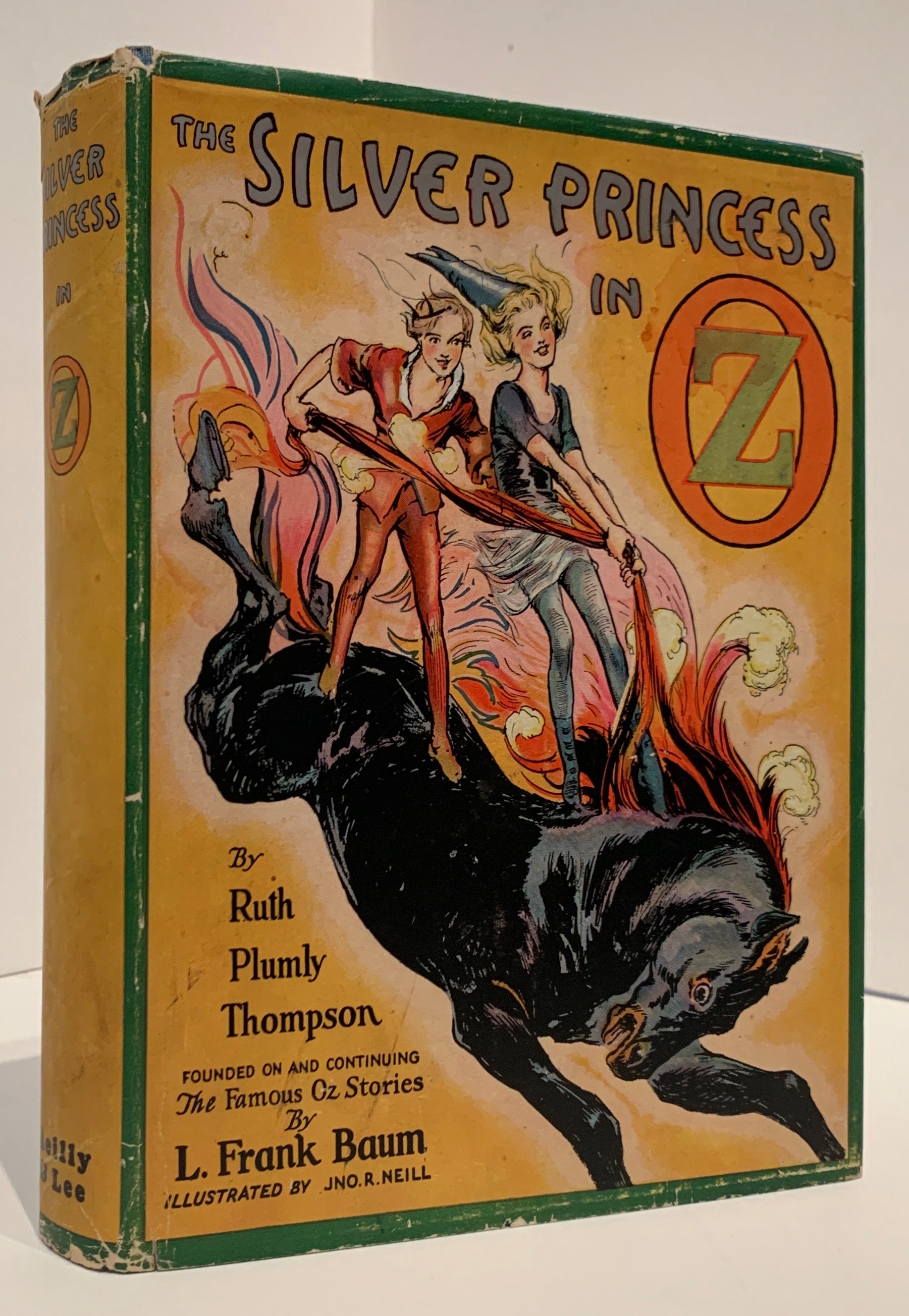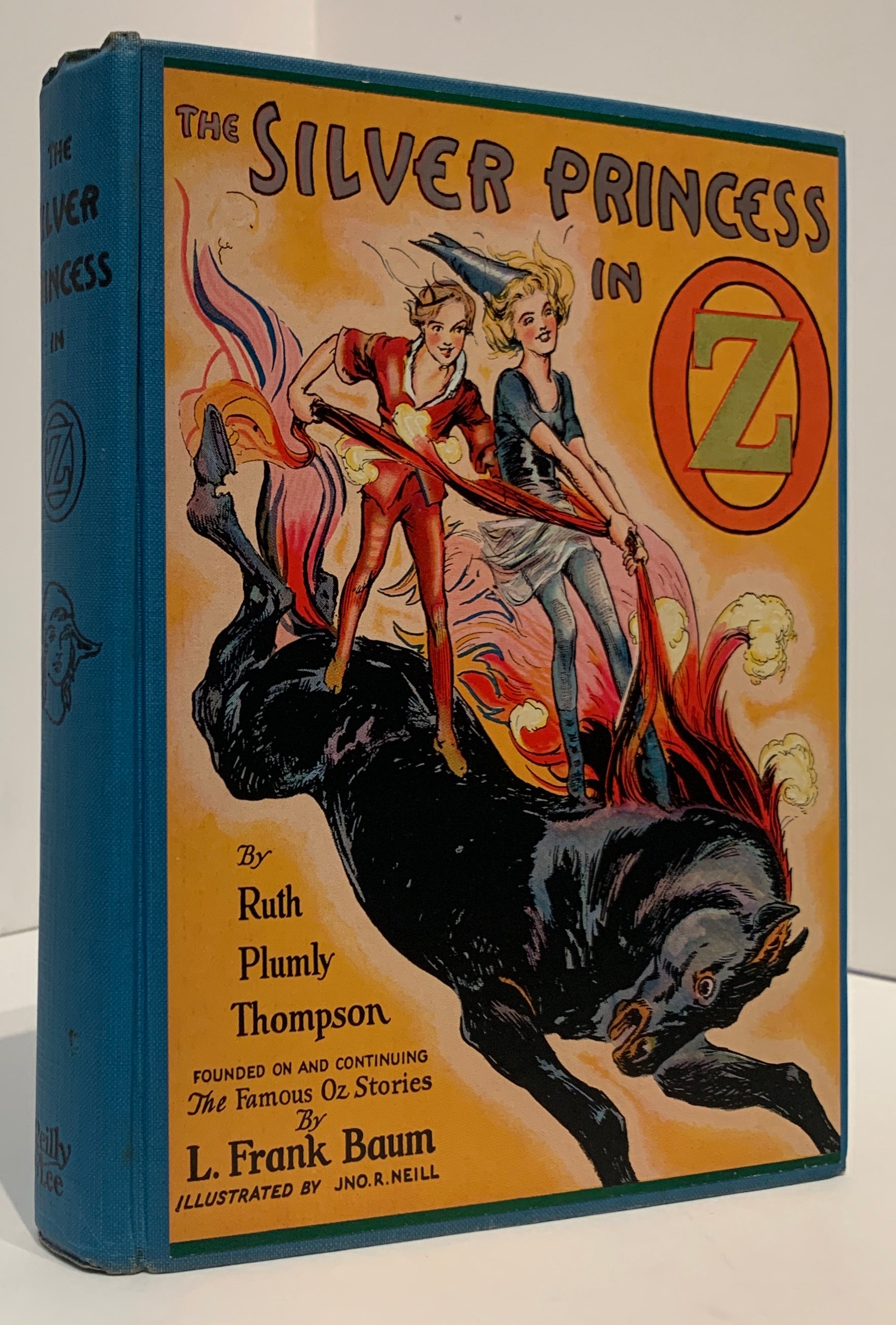 THOMPSON, Ruth Plumly. The Silver Princess of Oz. Illustrated by John R. Neill. Chicago: Reilly & Lee [1938]. 8vo, 255pp. Blue cloth with spine pictorially stamped in black and color pictorial paper label affixed to the front. Pictorial endpapers; numerous b&w illustrations. Spine ends and lower corners slightly rubbed, some faint spotting to rear cover, front hinge mended, else a near fine copy in original color pictorial dust jacket (2” closed tear at bottom of rear panel, some wear and chipping along folds and edges, 2” x 2” faint dampstain in upper right corner of front panel).