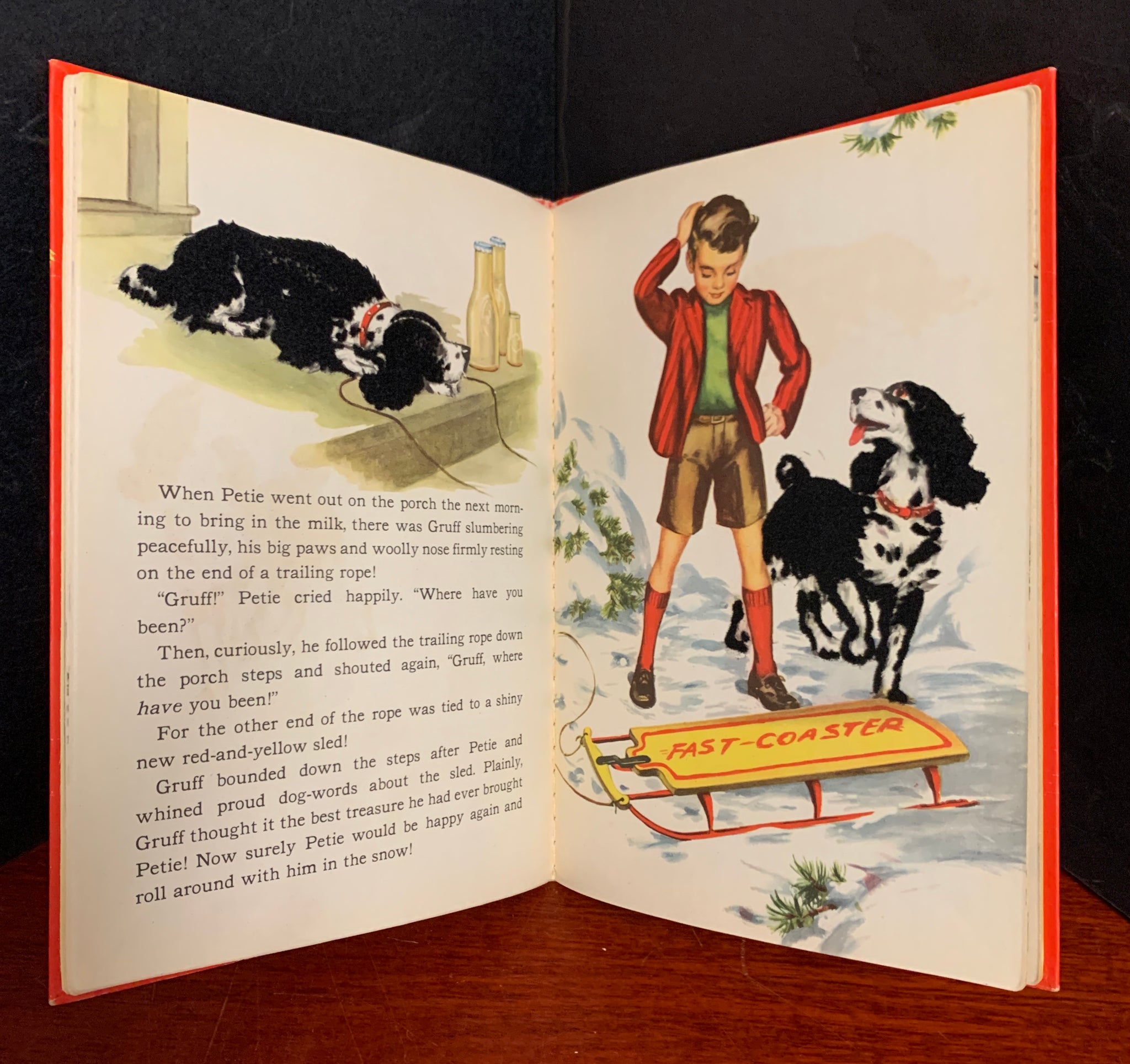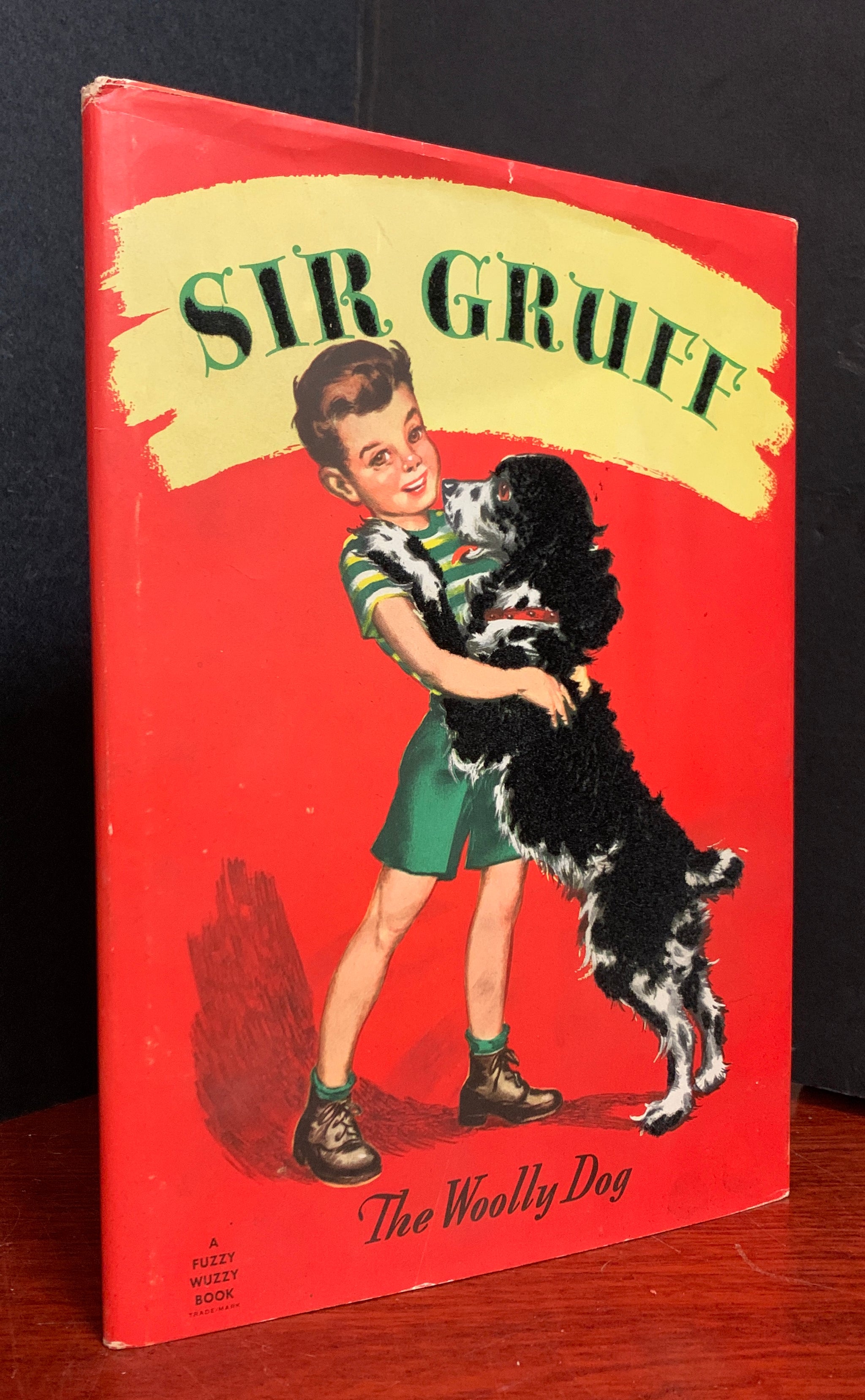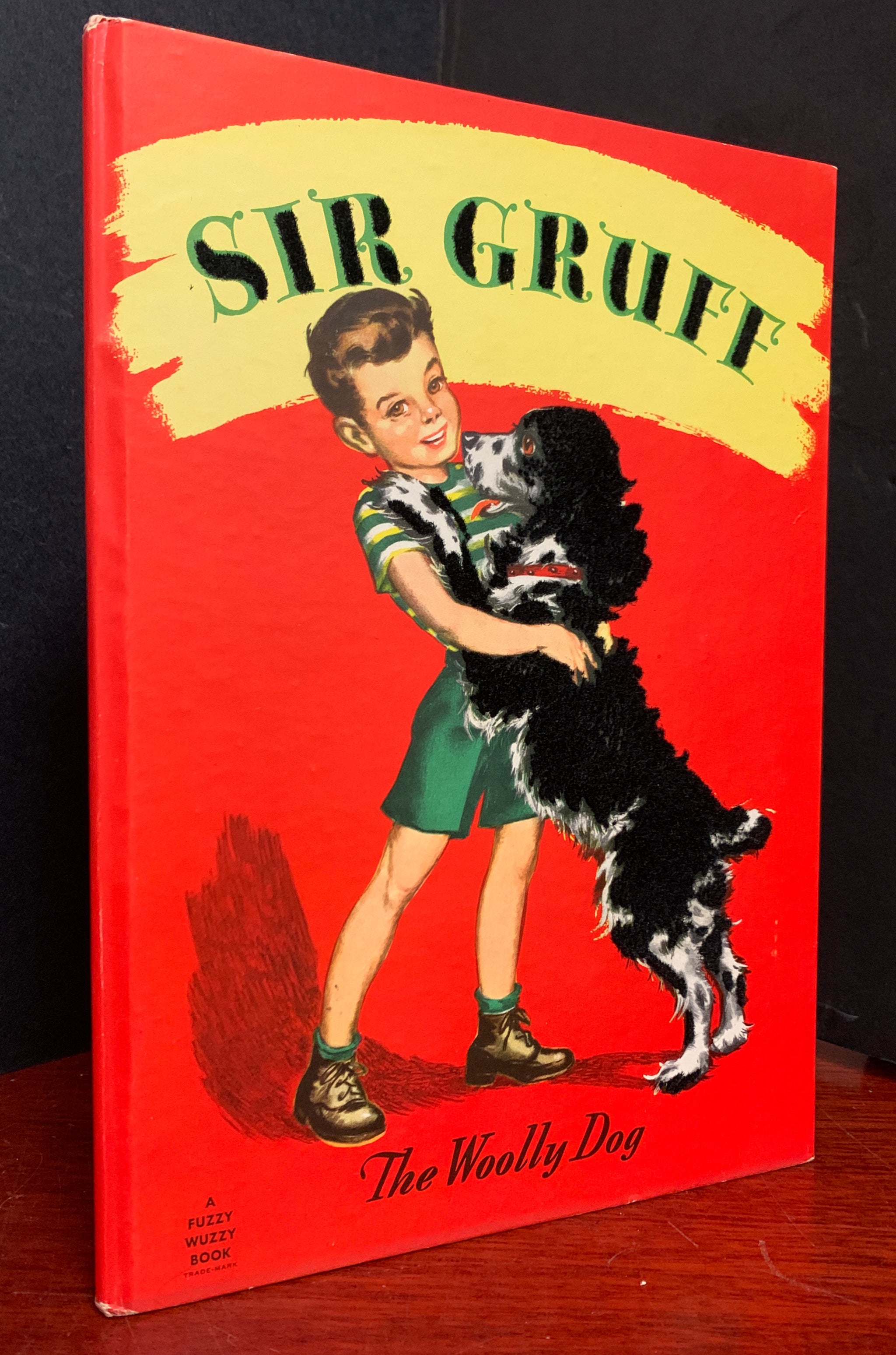 Early printing, possible first edition, having no date or printing information. Sir Gruff is Petie's rough-coated dog, who enjoys nothing more than bringing treasures home to his small master. But one day Sir Gruff arrives home with a shiny new red and yellow sled and Petie is faced with a problem. A wonderful interactive picture book with cloth flocked illustrations. One of the “Fuzzy Wuzzy” books to that featured these textured pictures. Scarce in such nice condition.