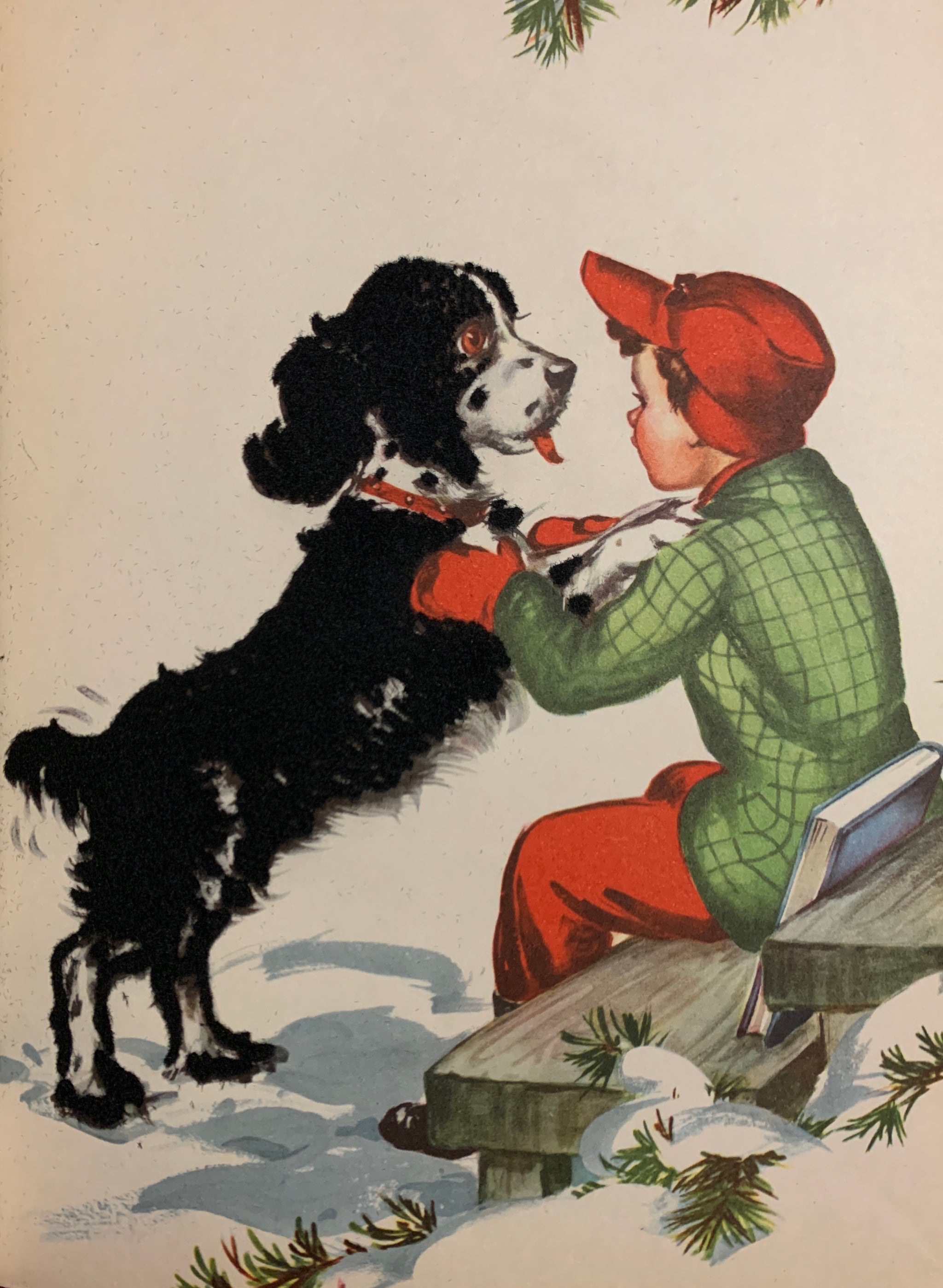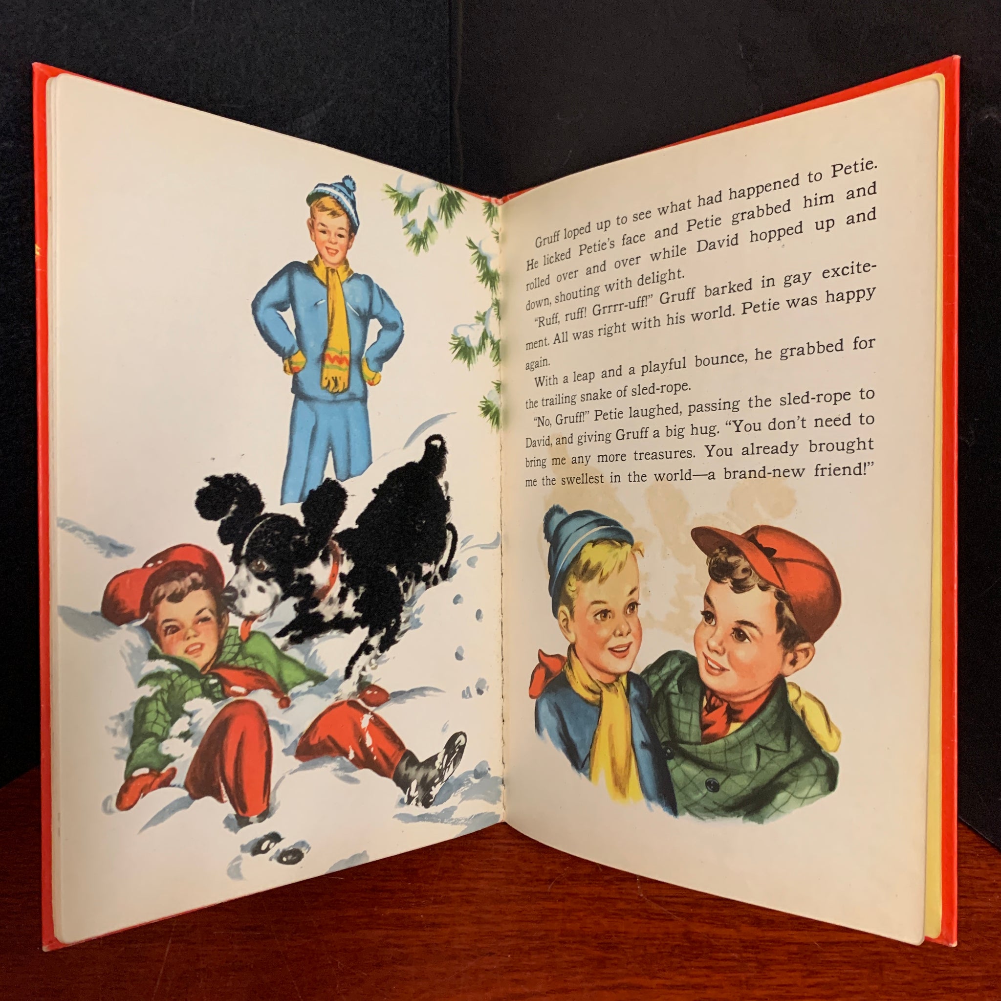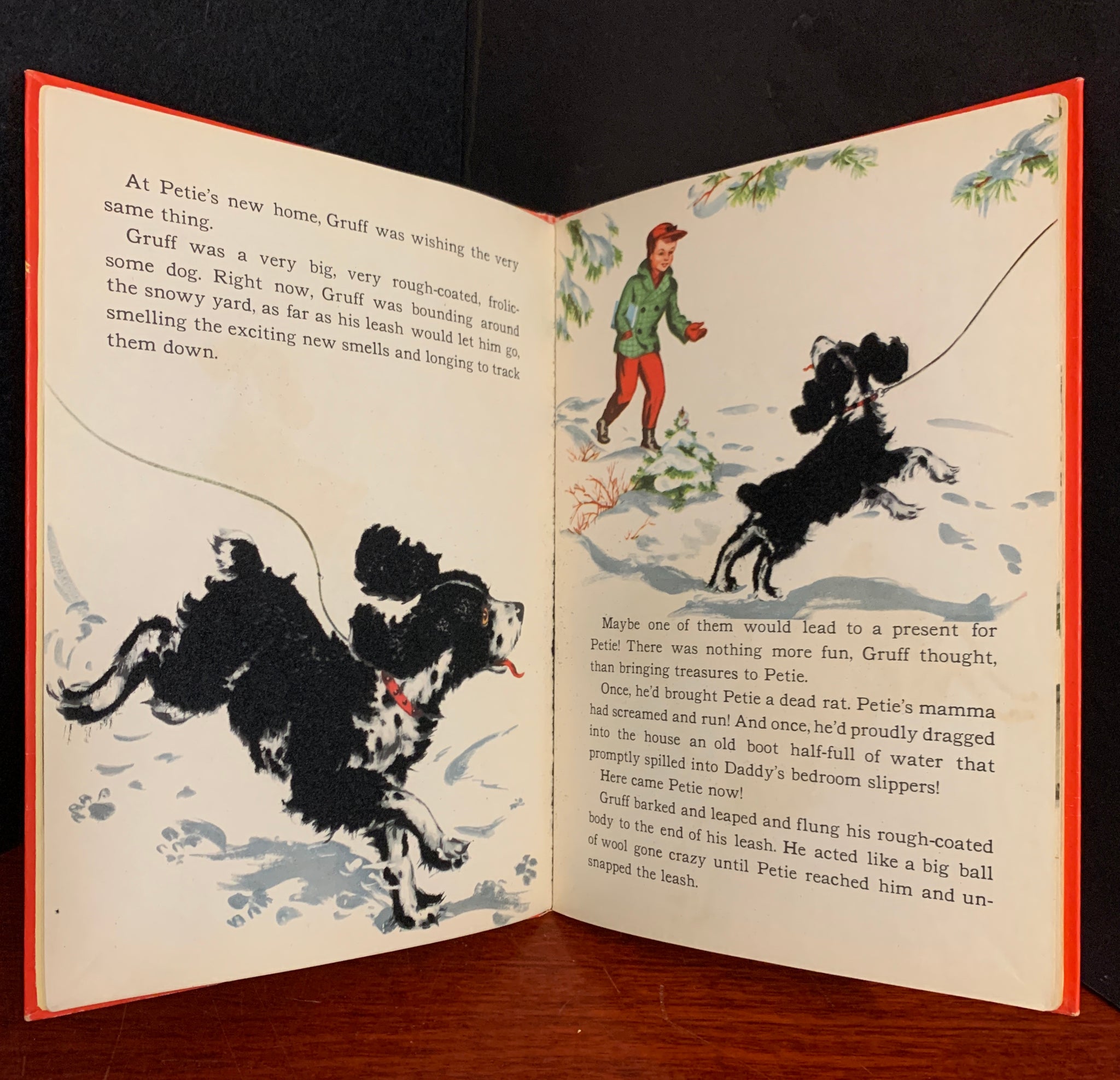 Early printing, possible first edition, having no date or printing information. Sir Gruff is Petie's rough-coated dog, who enjoys nothing more than bringing treasures home to his small master. But one day Sir Gruff arrives home with a shiny new red and yellow sled and Petie is faced with a problem. A wonderful interactive picture book with cloth flocked illustrations. One of the “Fuzzy Wuzzy” books to that featured these textured pictures. Scarce in such nice condition.