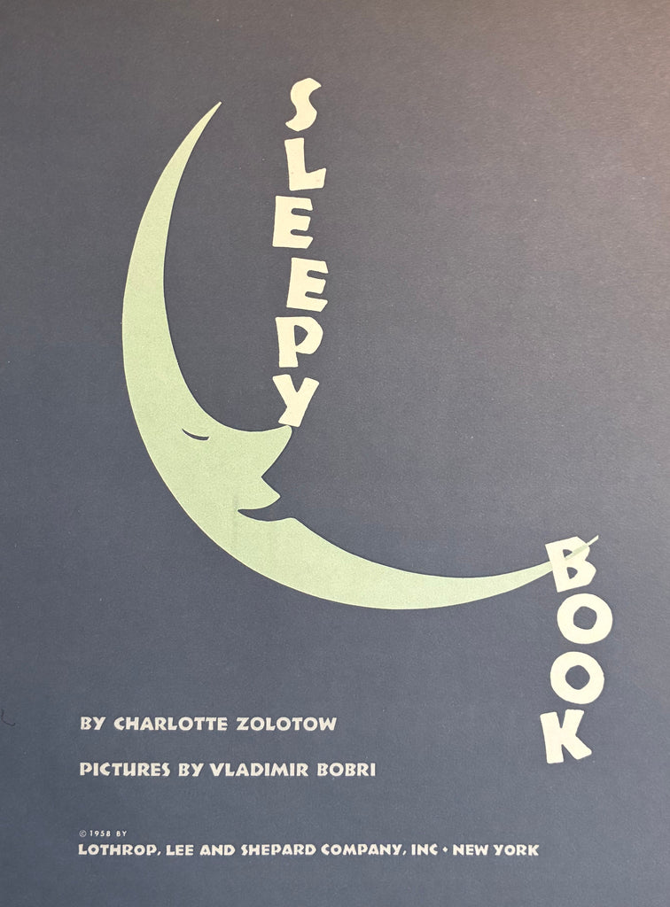 ZOLOTOW, Charlotte. Sleepy Book. Pictures by Vladimir Bobri. NY: Lothrop, Lee and Shepard, 1958. 4to, [32]pp. Blue cloth with spine stamped in white and front pictorially blind stamped. Color pictorial endpapers; color illustrations throughout. Spine ends and corners a tad rubbed, upper edge a tad sunned, else a clean, tight copy in original color pictorial dust jacket (slightest edgewear, small chip at head of spine, slight small stain at top of front panel, 1/2 inch closed tear at bottom of rear panel).