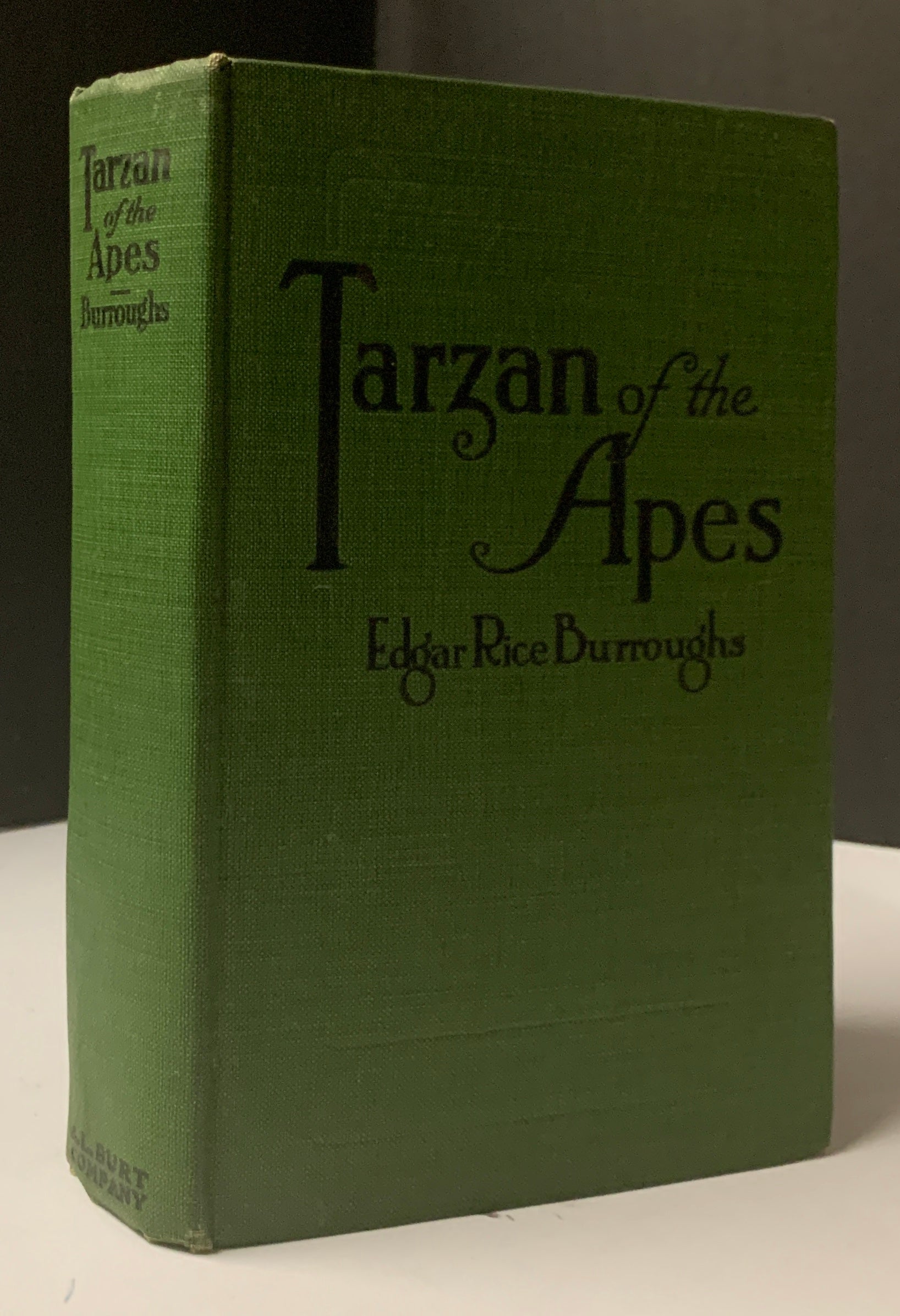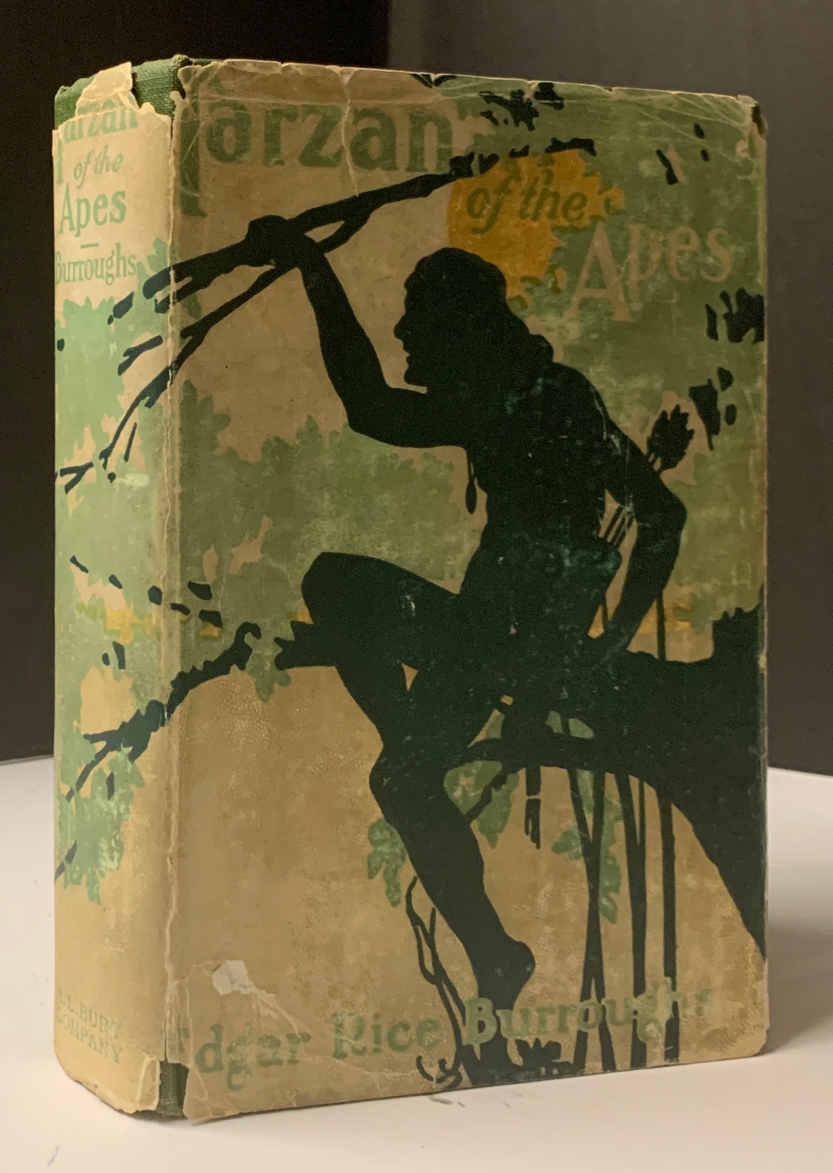 BURROUGHS, Edgar Rice. Tarzan of the Apes. NY: A.L. Burt (ca. 1918). 12mo, [viii] 401pp. + [4] advts. Green cloth stamped in black. A clean, bright copy with spine ends and corners lightly rubbed, former owner’s name, city, and state embossed towards bottom of front free endpaper, lower corner of pp. 55-56 bears evidence of having been folded, in original color pictorial dust jacket (chipping and wear at edges, soiled and sunned, but still whole).